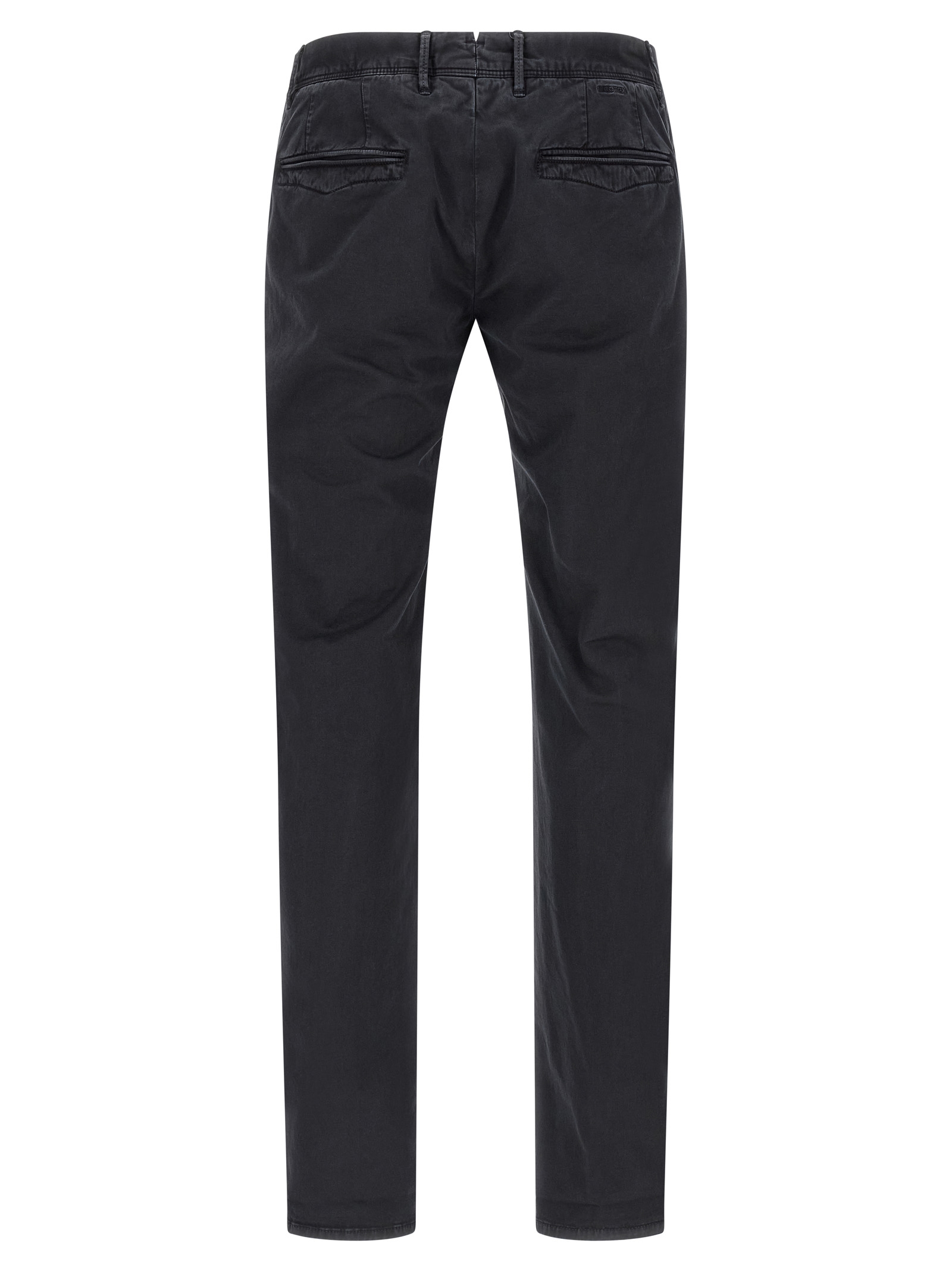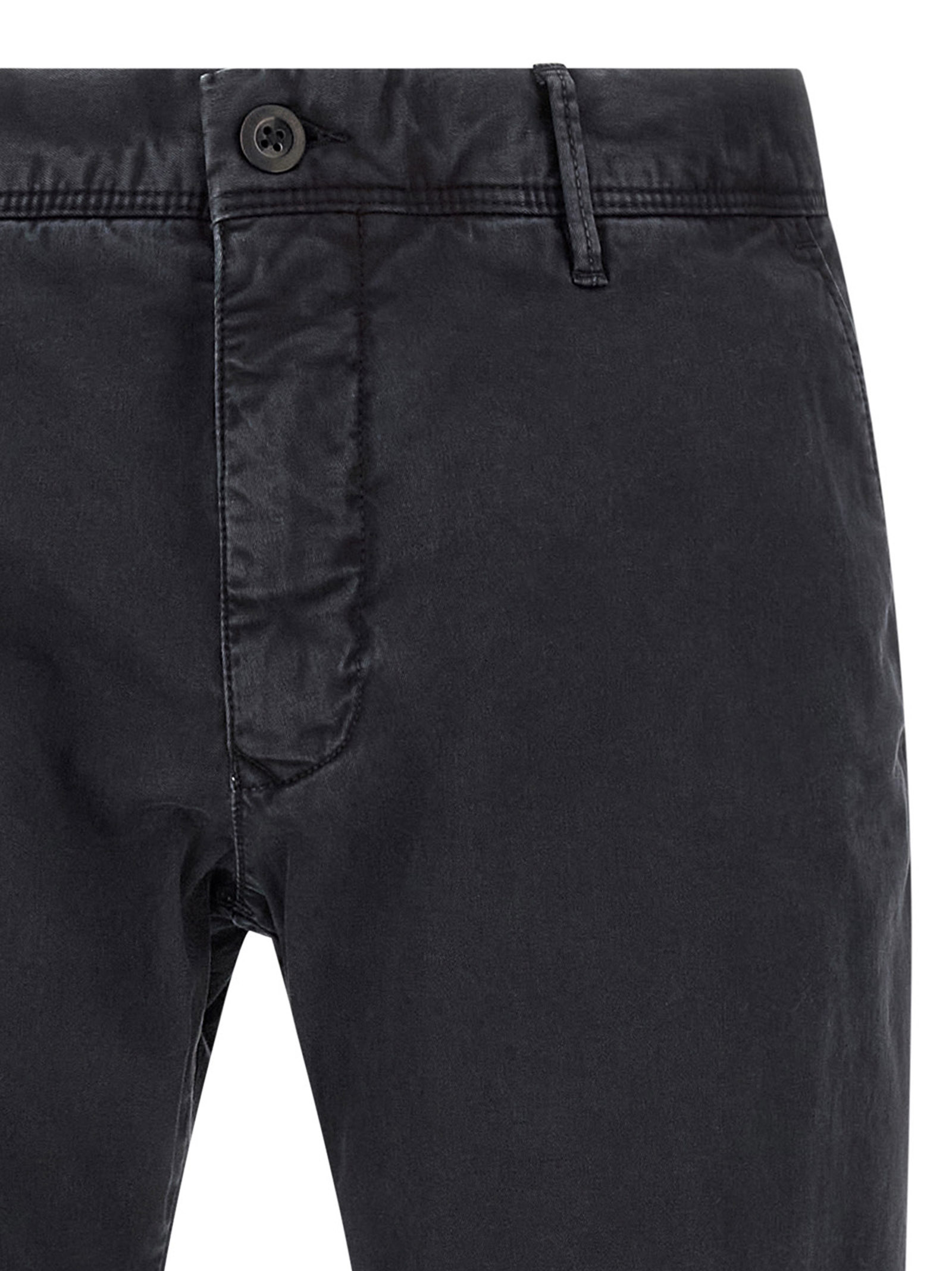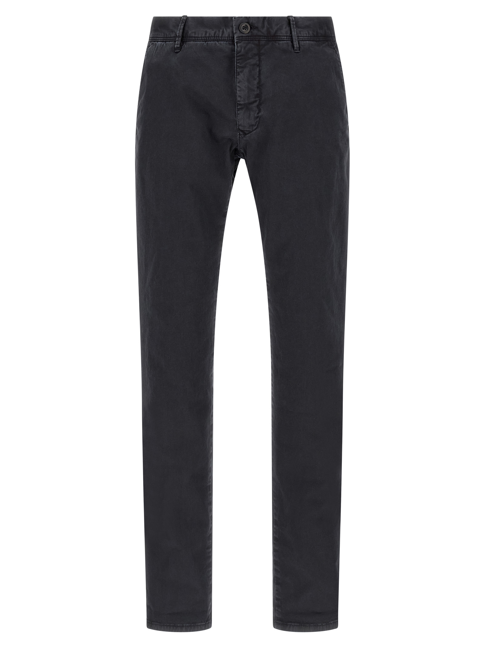 ’18S100′ stretch cotton pants, straight leg, low waist, front zip and button closure, pockets.