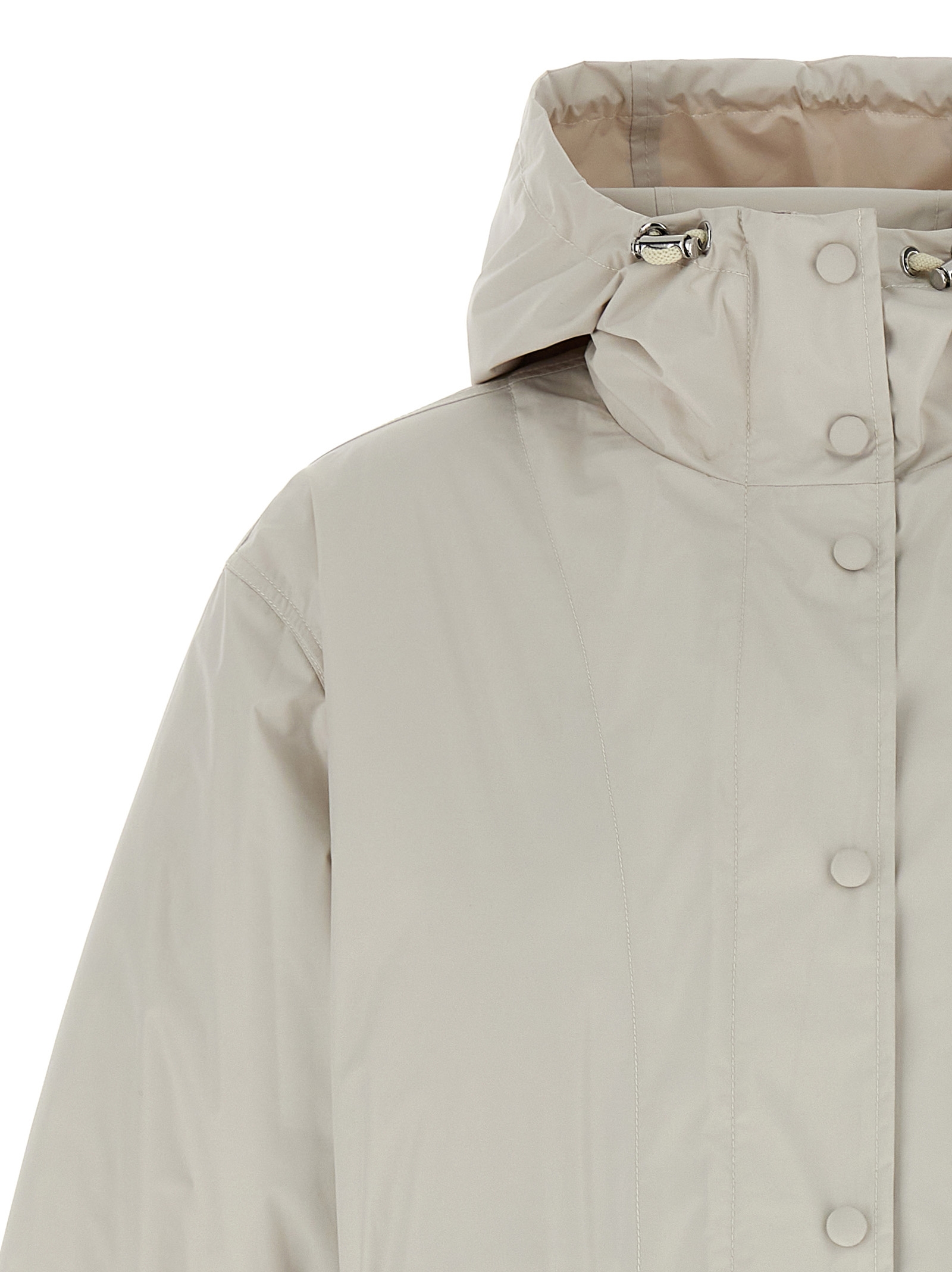 Water-repellent nylon 2 in 1 parka, hood, zip and snap button closure, drawstring at the waist and at the hem, pockets, long sleeves. Removable quilted inner jacket with snap button closure, crew neck, pockets, long sleeves.