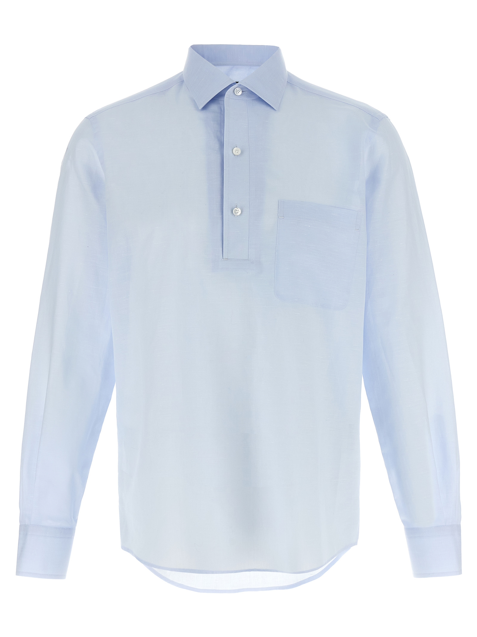 Linen blend shirt, collar, three buttons front closure, long cuffed sleeves.