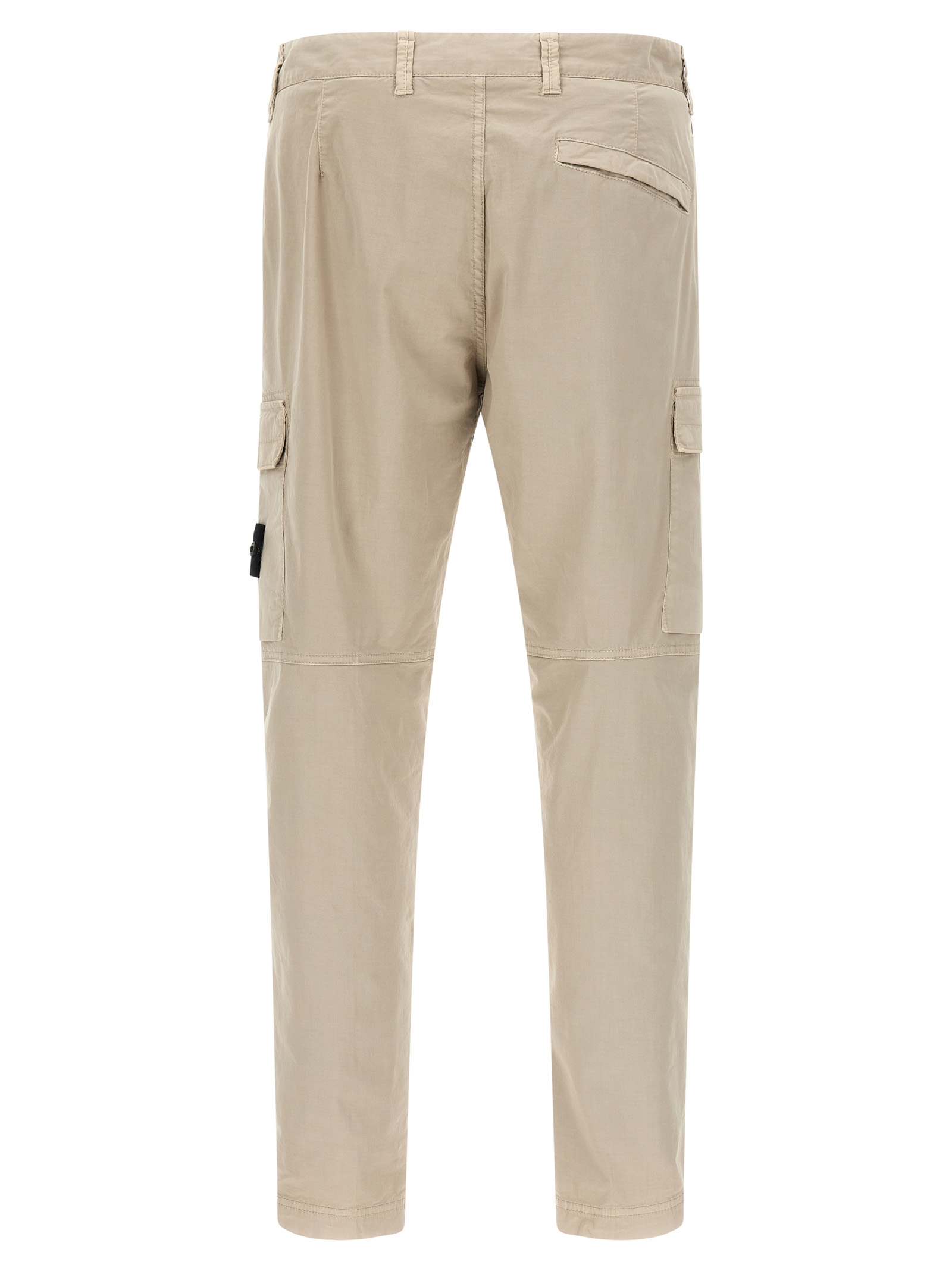 ‘3100032’ trousers in garment-dyed stretch cotton twill, cargo style with side pockets and logo badge, straight leg with shaped knees, zip and front button closure, reinforced inner waist with contrast lining, pockets.