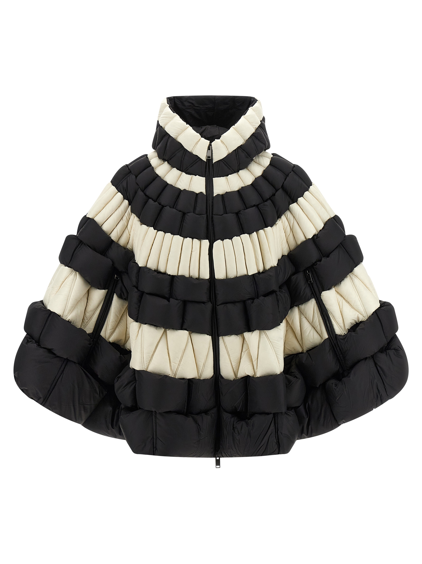 Nylon cape with braided 3D structure and goose feather padding, hood, high neck, front zip closure, side zip to pass hands.