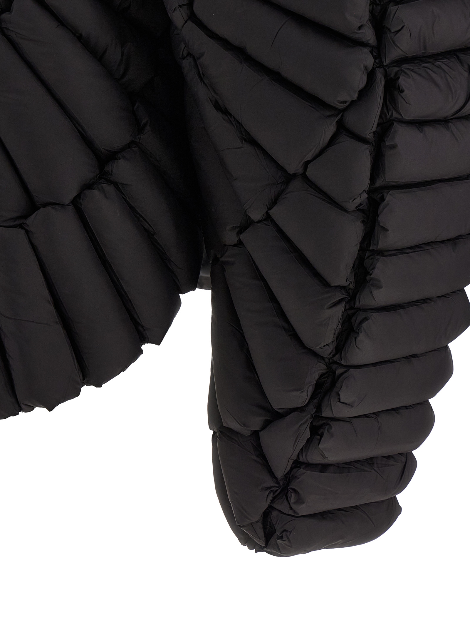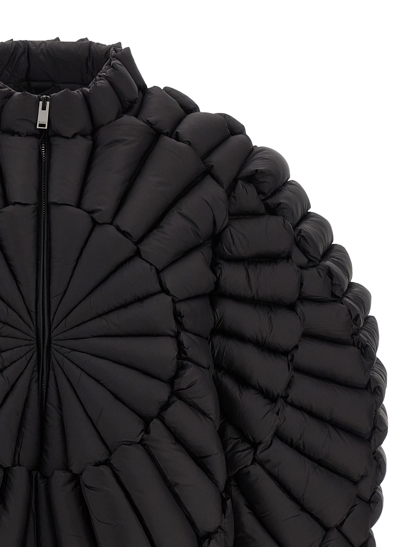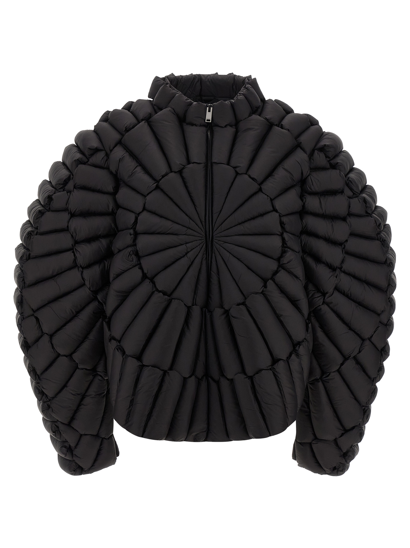 Nylon down jacket with 3D structure with goose feather padding, high neck, front zip closure, pockets, long curved sleeves, rounded hem.