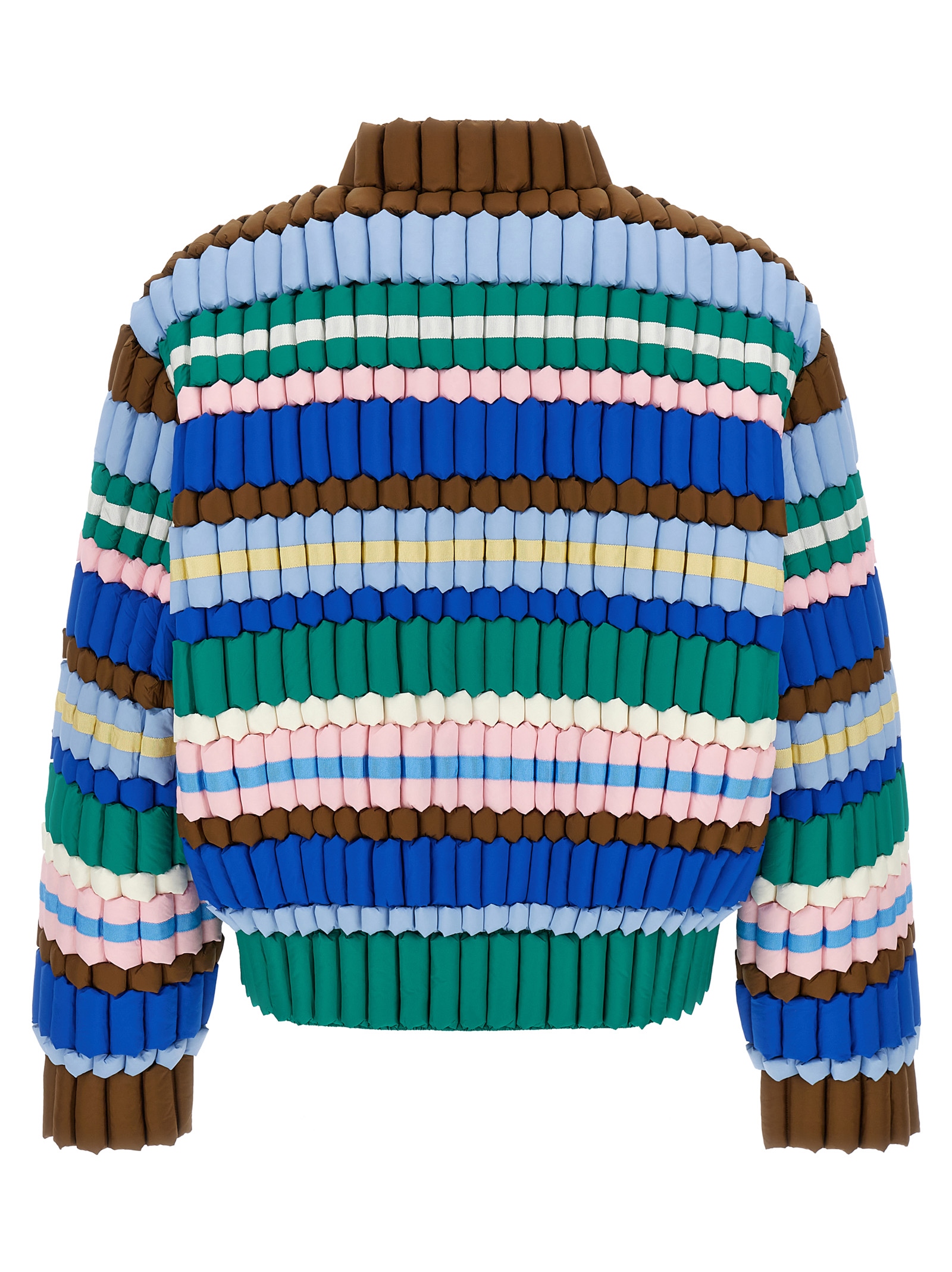 Nylon down jacket with 3D structure with goose down padding and grosgrain ribbon details, high color, front zip closure, pockets, long sleeves with cuffs and dropped shoulder, elastic at the hem.