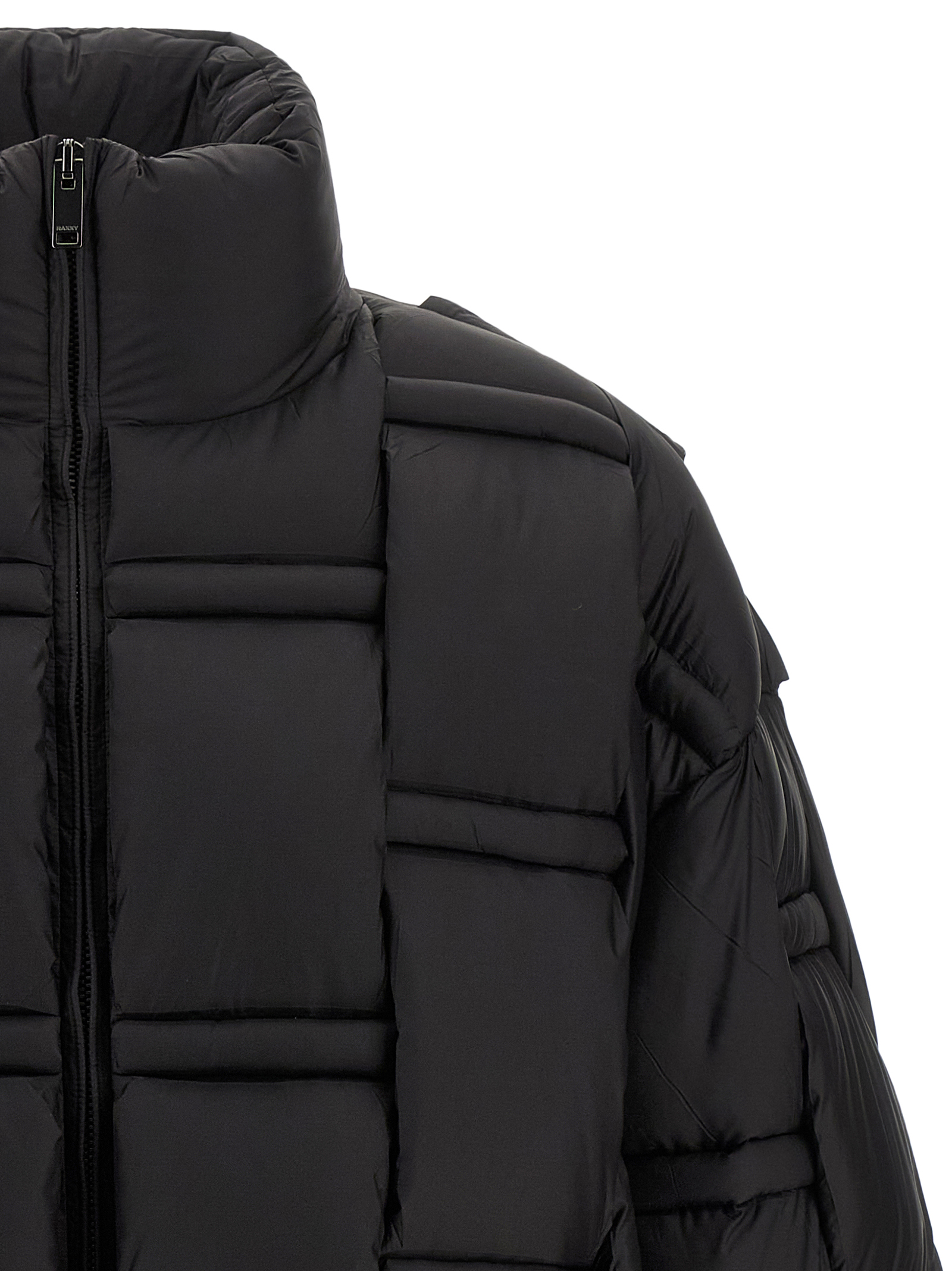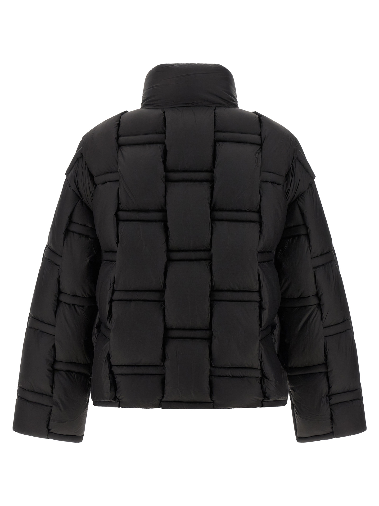 Nylon down jacket with braided 3D structure and goose feather padding, high neck, front zip closure, pockets, long sleeves.