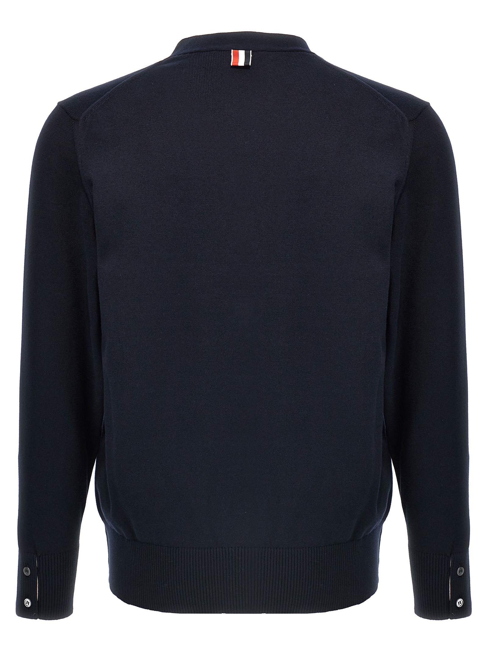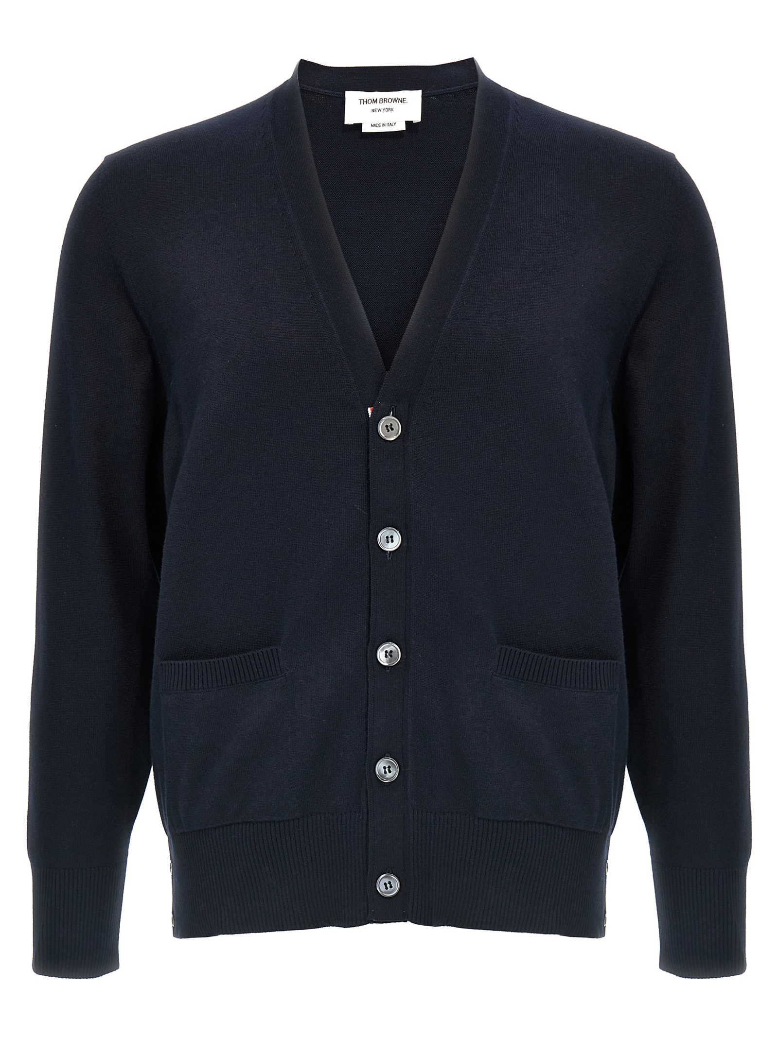 Cotton cardigan with V-neck, button closure, ‘4-Bar’ detail on the side, pockets, long sleeves with cuffs, side slits with buttons.