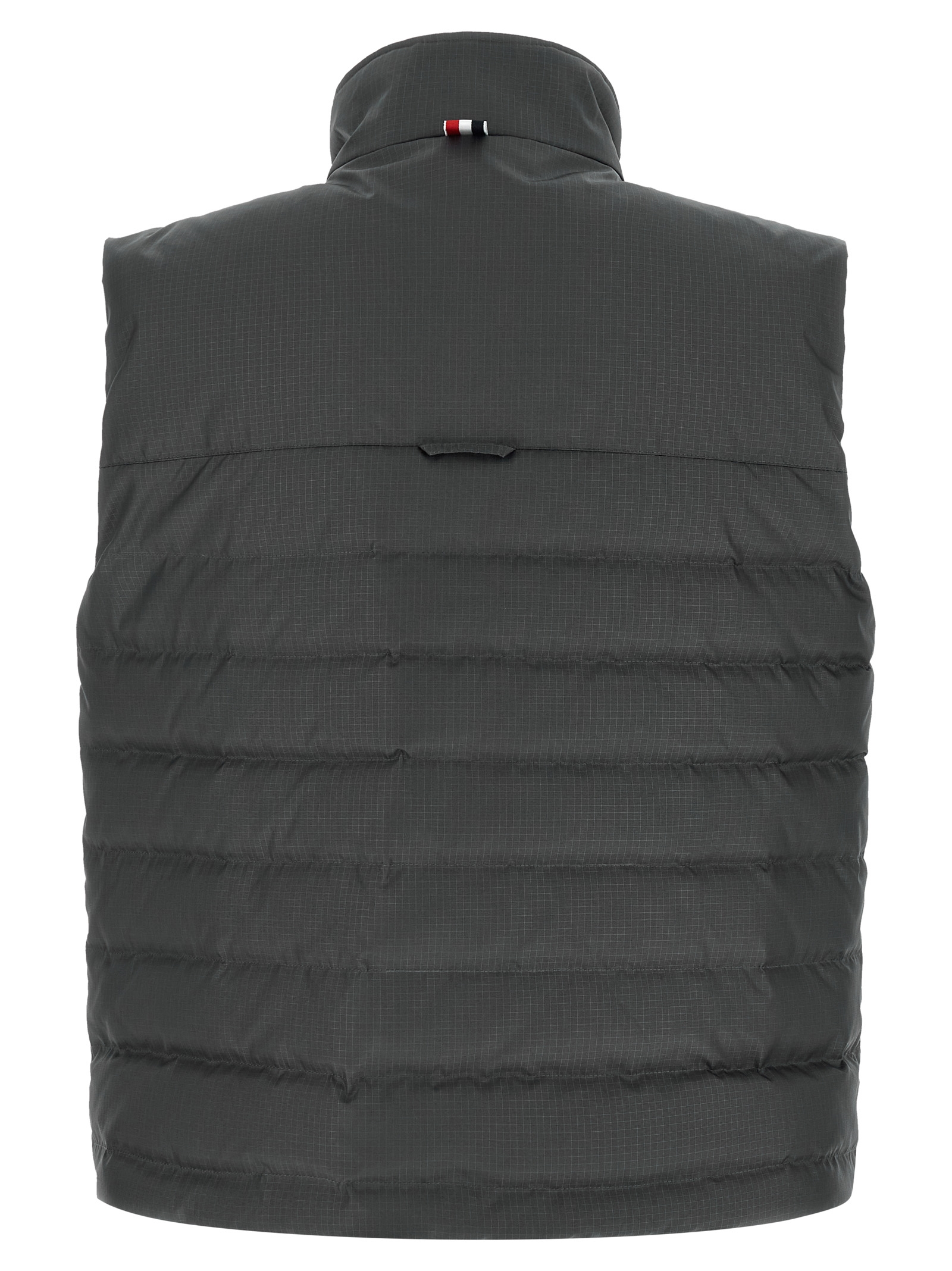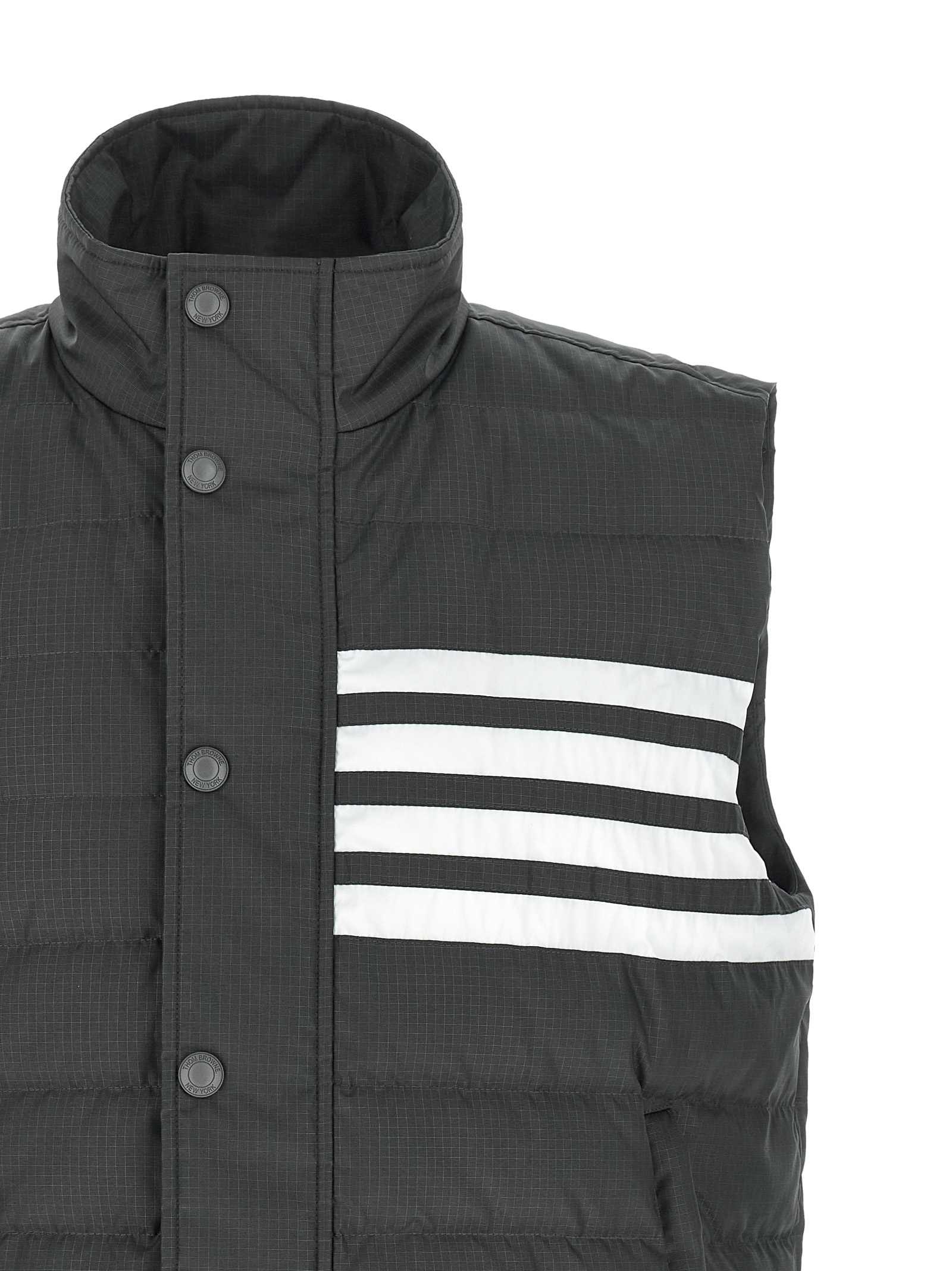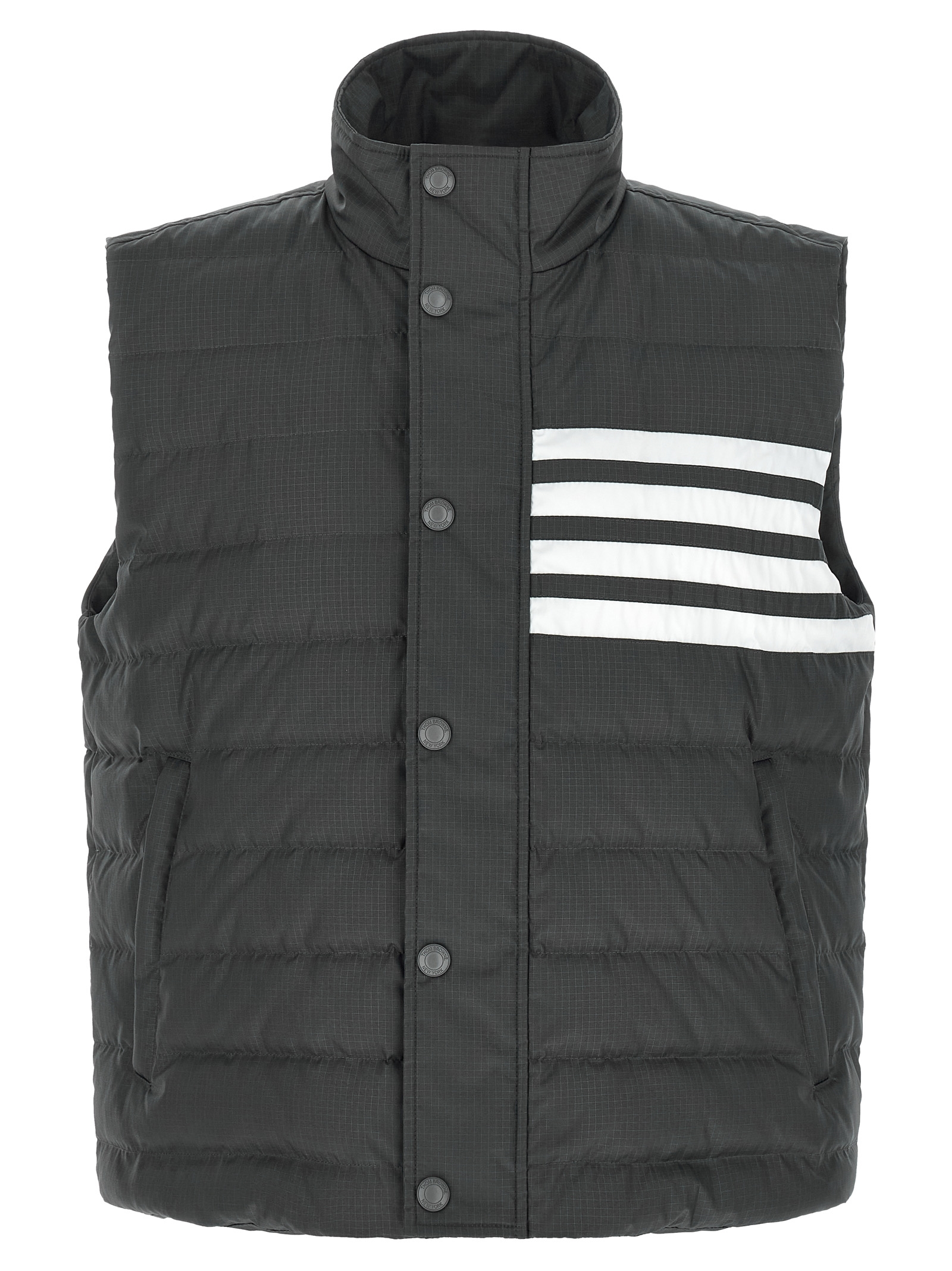 Lightly quilted shiny ripstop vest with goose down padding with contrast nylon ‘4 Bar’ insert on the front, stand-up collar, zip and snap button closure, pockets, striped fabric lining.