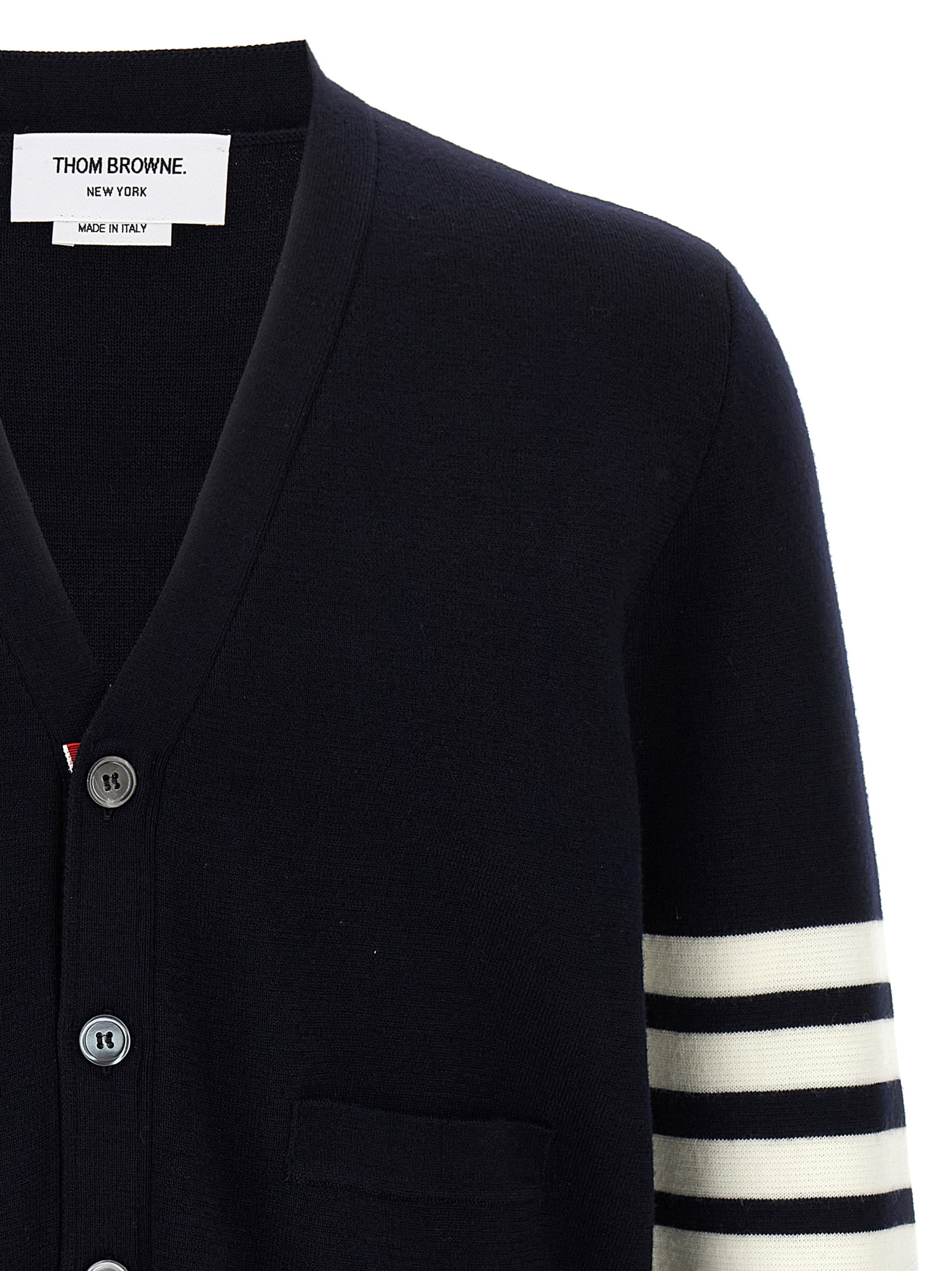 Milan stitch virgin wool cardigan with jacquard ‘4-Bar’ detail on the sleeve, V-neck, front button closure, pockets, long cuffed sleeves, side slits with striped grosgrain ribbon.
