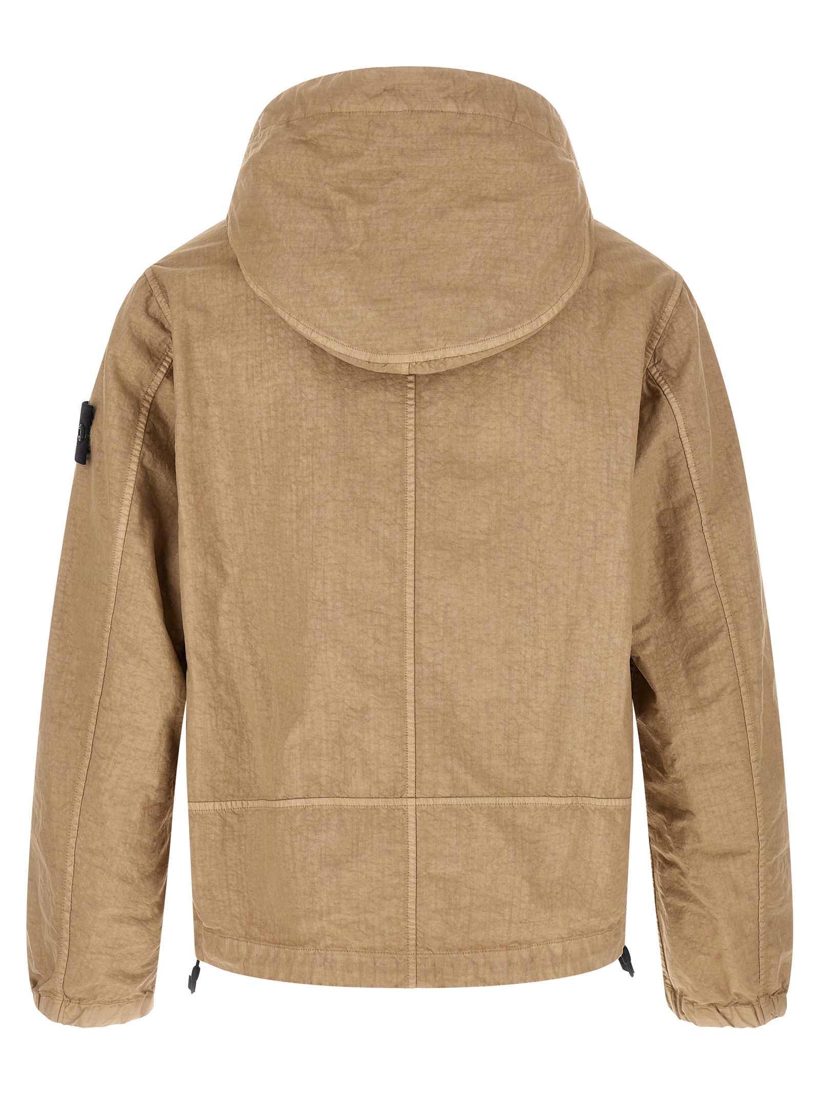 ‘4100053’ jacket in Panama woven calendered fabric with anti-drip agent and garment dyeing process that gives the fabric surface a marbled appearance, adjustable lined hood, high neck, front zip closure, pockets, long sleeves with elastic cuffs and logo badge appliquรฉ, drawstring on the hem, unlined.