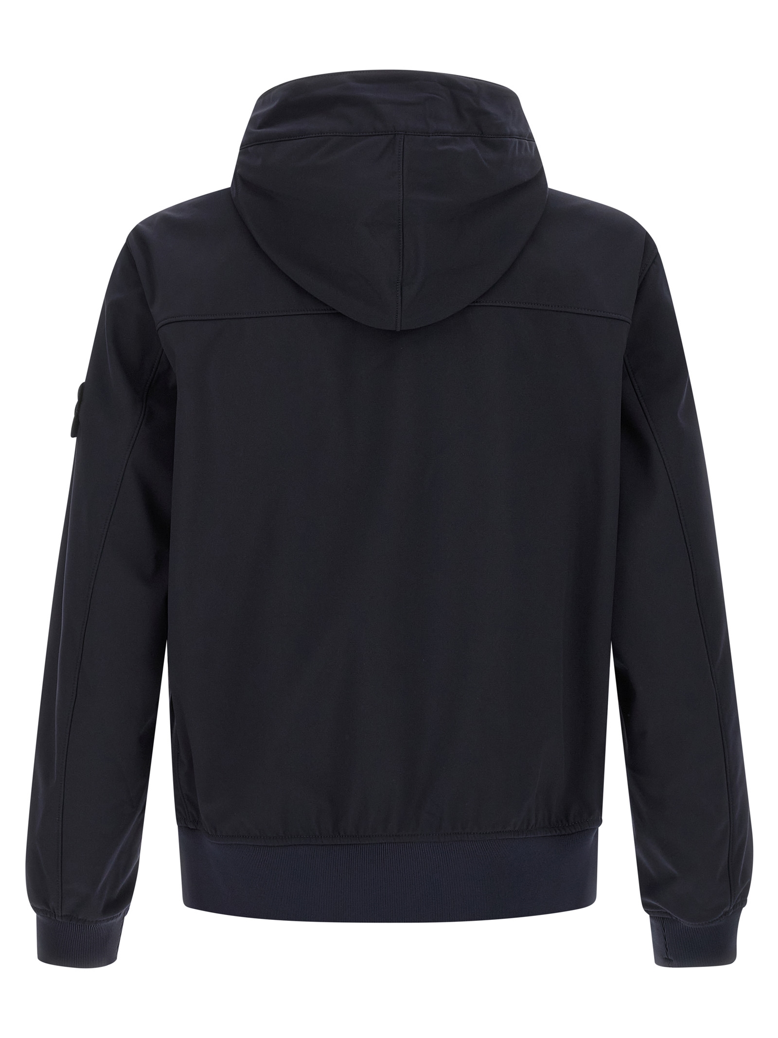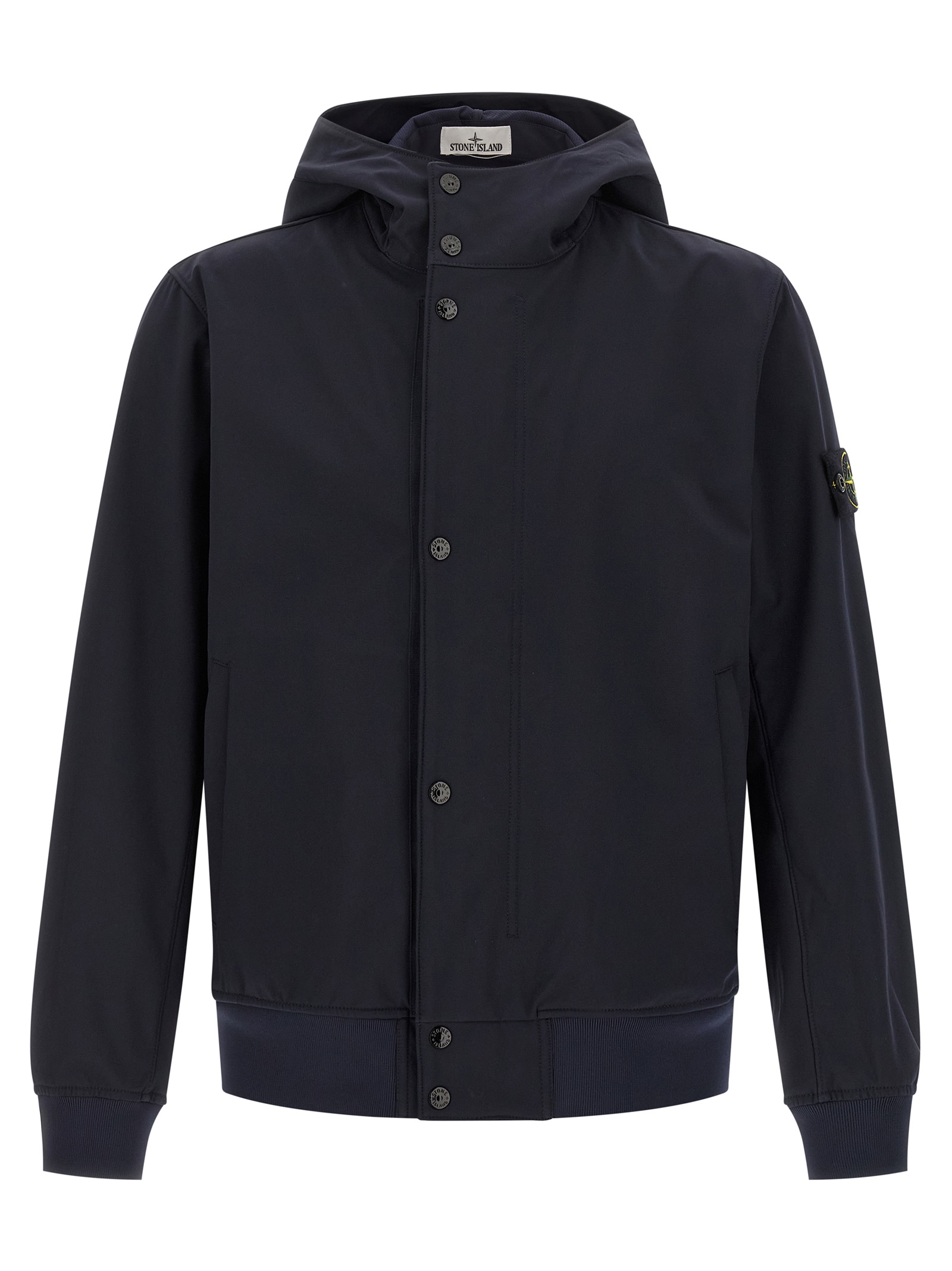 ‘4100118’ jacket in three-layer technical material with 8000 mm water column with outer part in stretch polyester canvas woven with e.dye® Waterless Color System™ technology yarns and textured polyester jersey inner part with breathable and water and wind resistant membrane, adjustable hood, high neck, zip closure and front snap buttons, pockets, long sleeves with cuffs, logo badge appliqué, band on the hem.