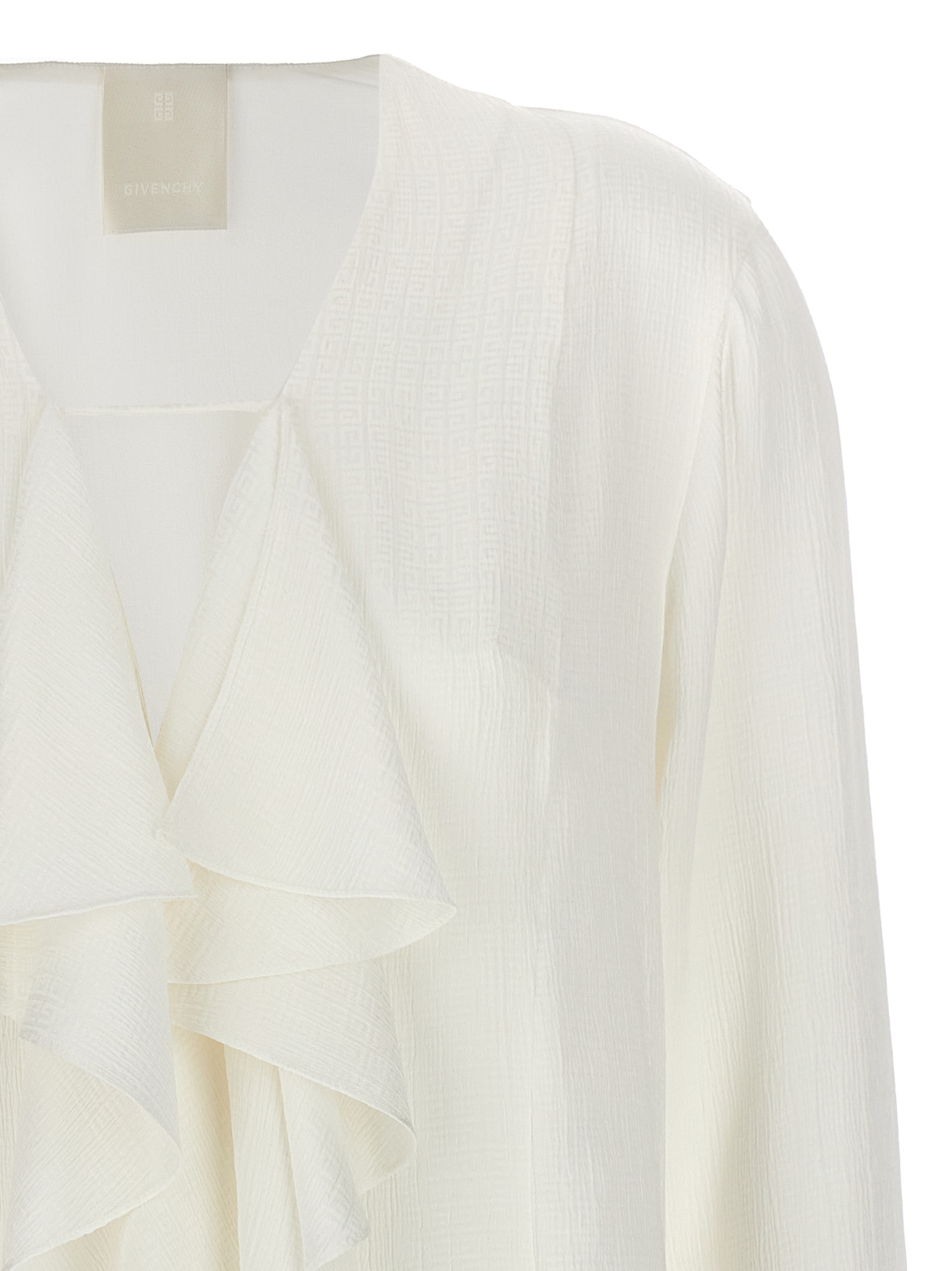 Silk shirt with ‘4G’ pattern, V-neck with ruffle detail, long sleeves with ruffles.