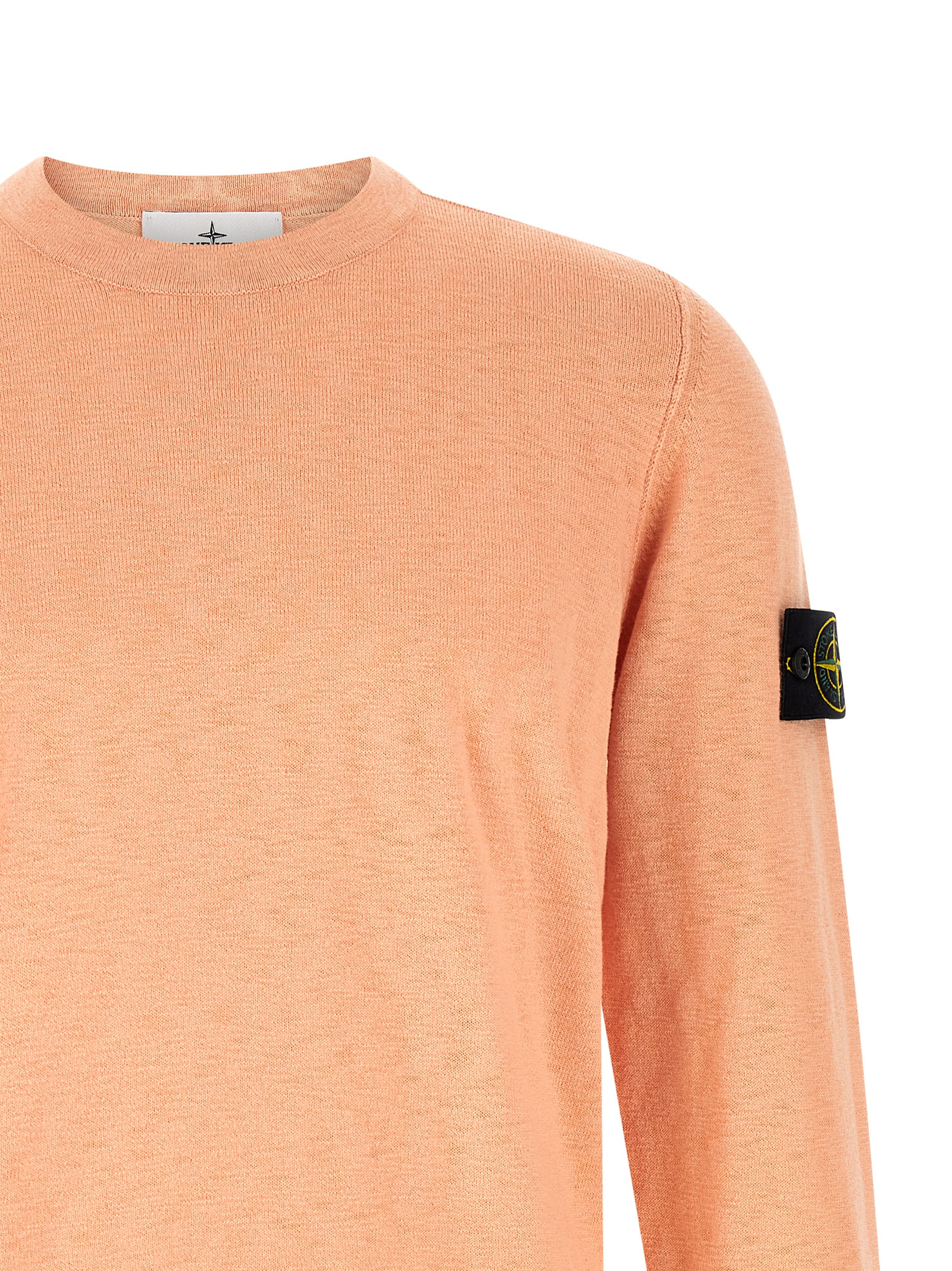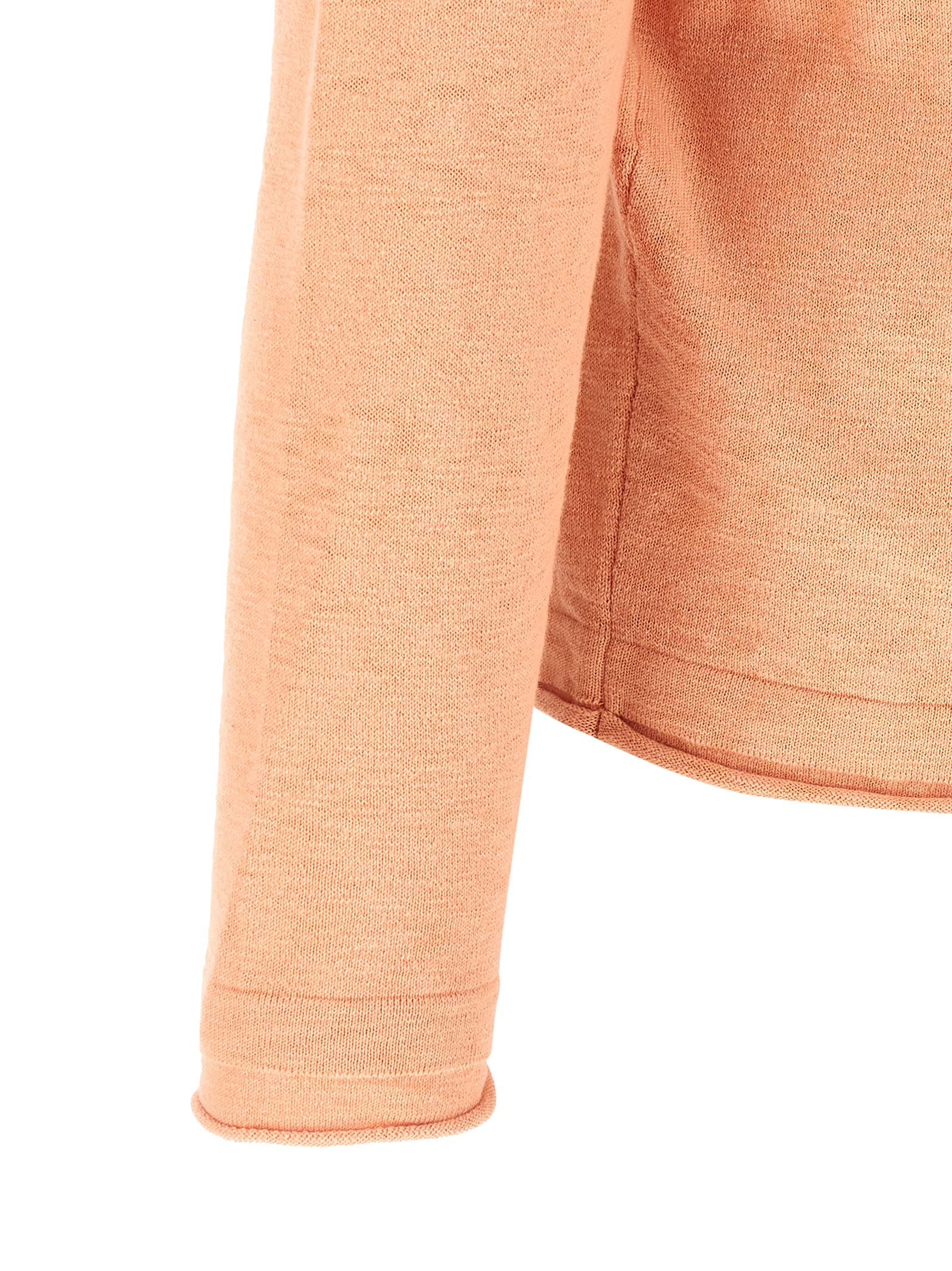 ‘5100052’ knit sweater in 14 fineness shaved cotton and nylon blend knit, crew neck, long sleeves with cuffs and logo badge appliqué.