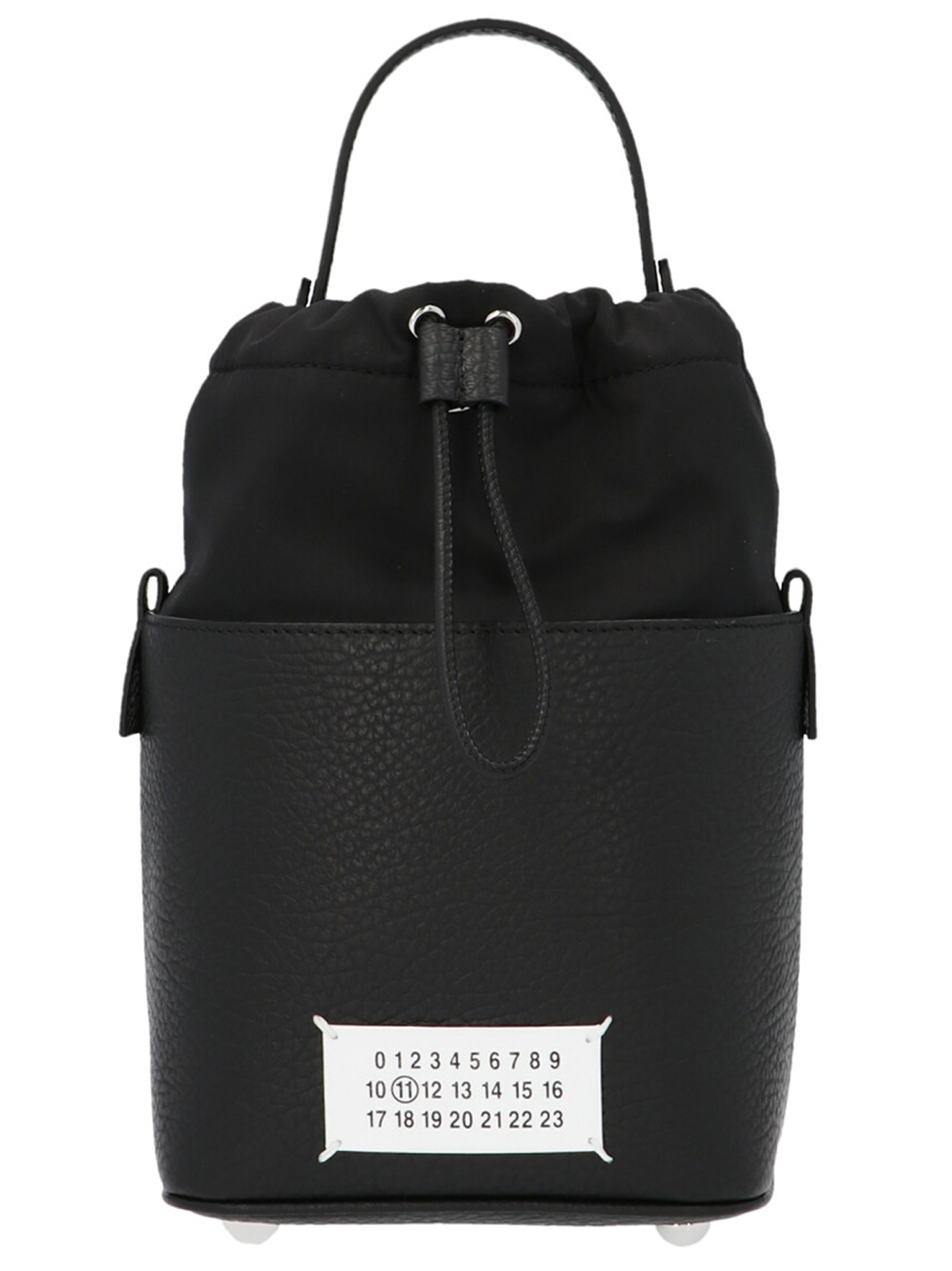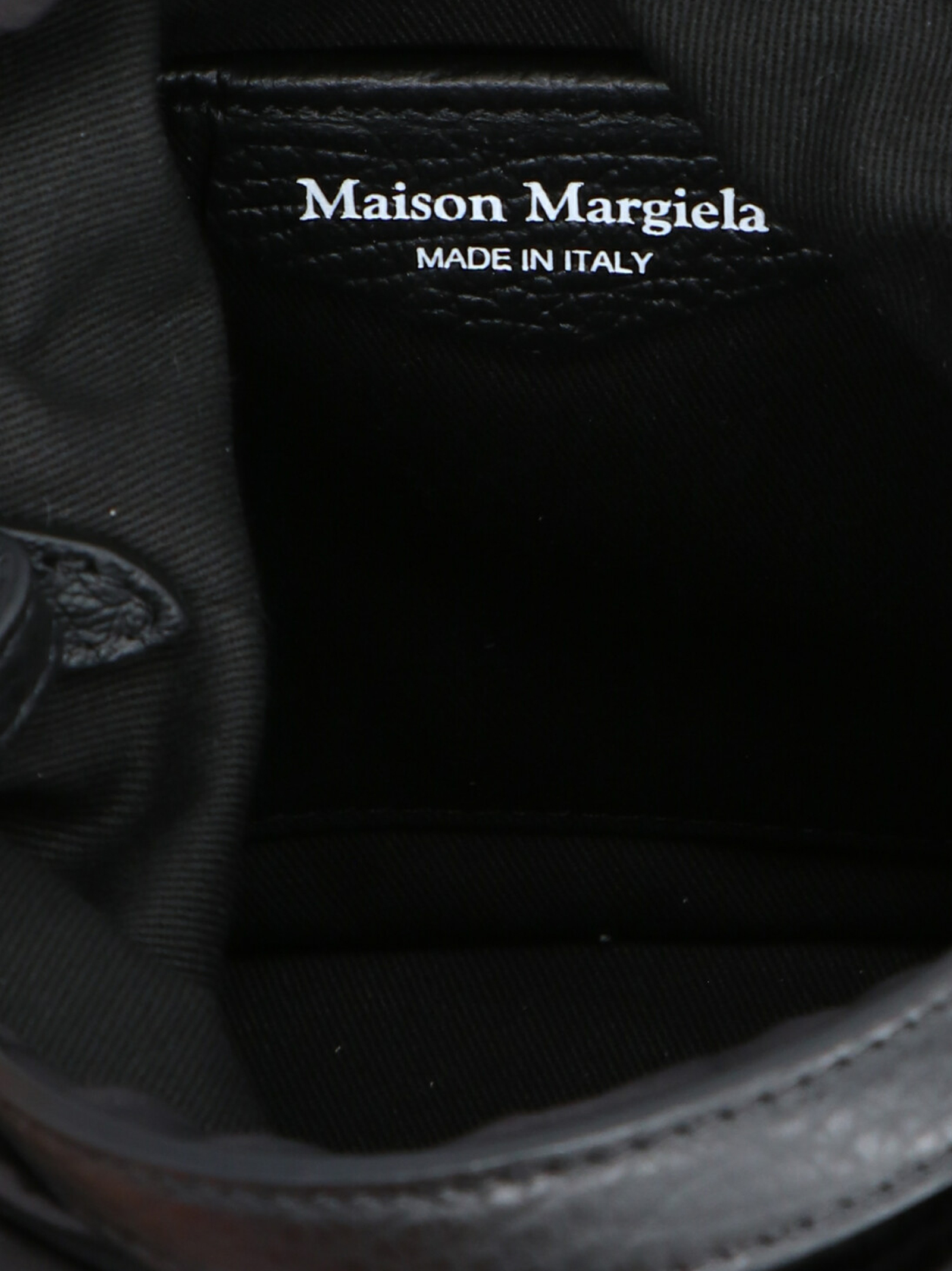 Maison Margiela leather bucket bag with a contrasting drawstring closure, a logo, and a shoulder strap that is removable.