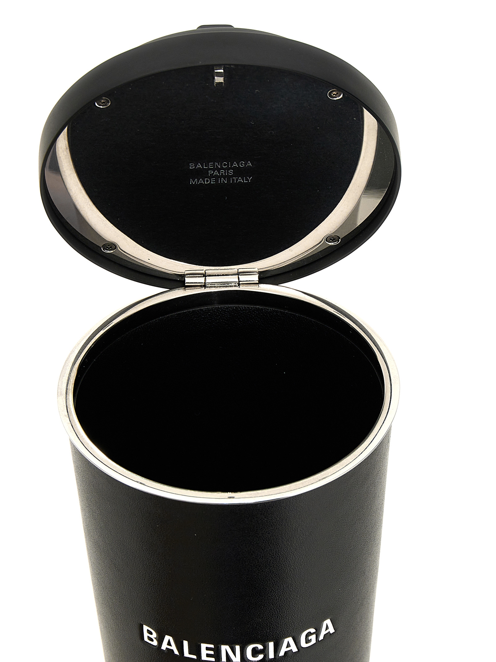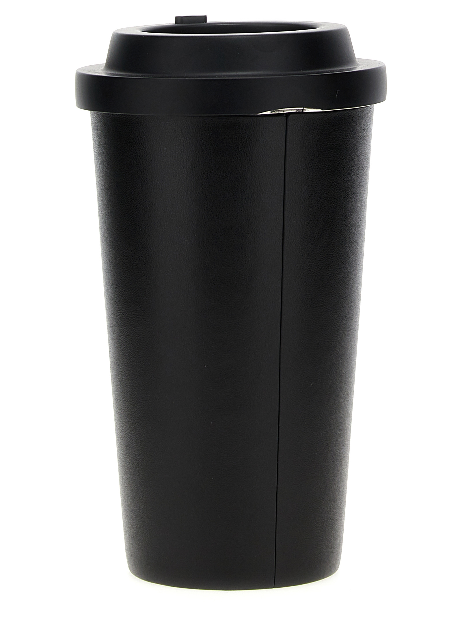 9 AM’ leather clutch in the shape of a coffee cup with top click closure, front logo.