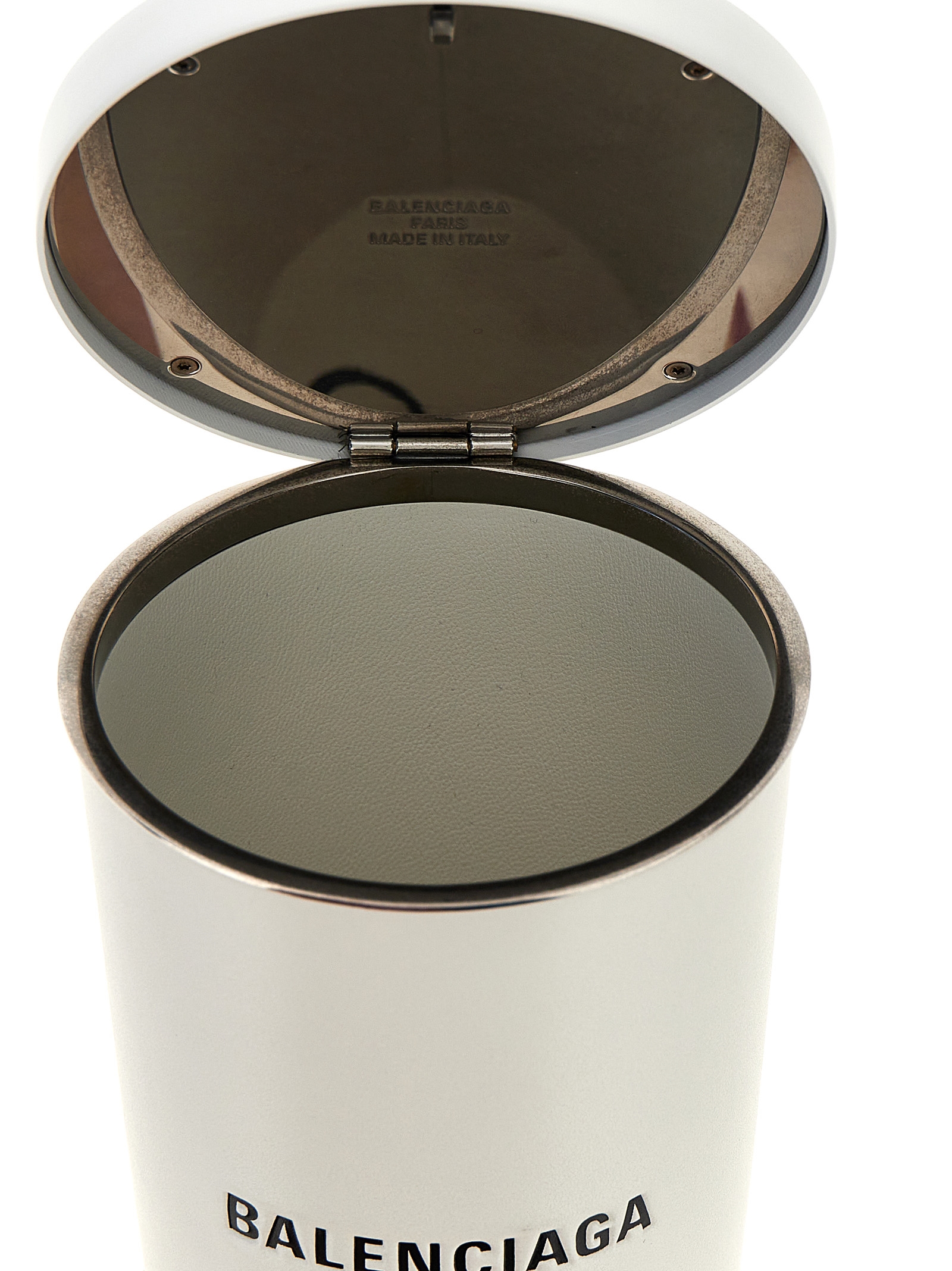 9 AM’ leather clutch in the shape of a coffee cup with top click closure, front logo.