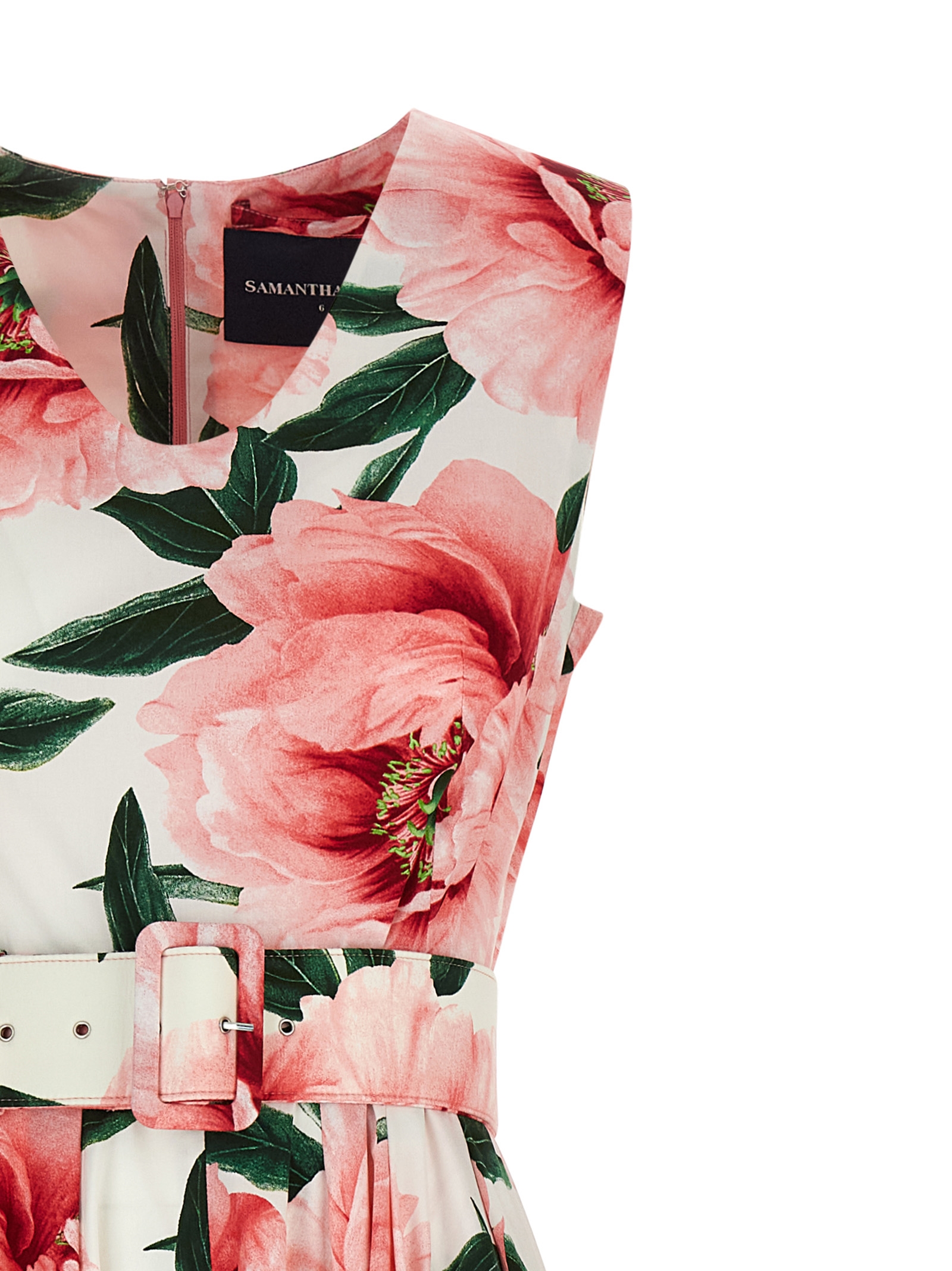 All-over ‘Pastel Magnolia Abelia’ cotton midi dress with back zip closure, V-neck, removable pockets, belt and sash detail.
