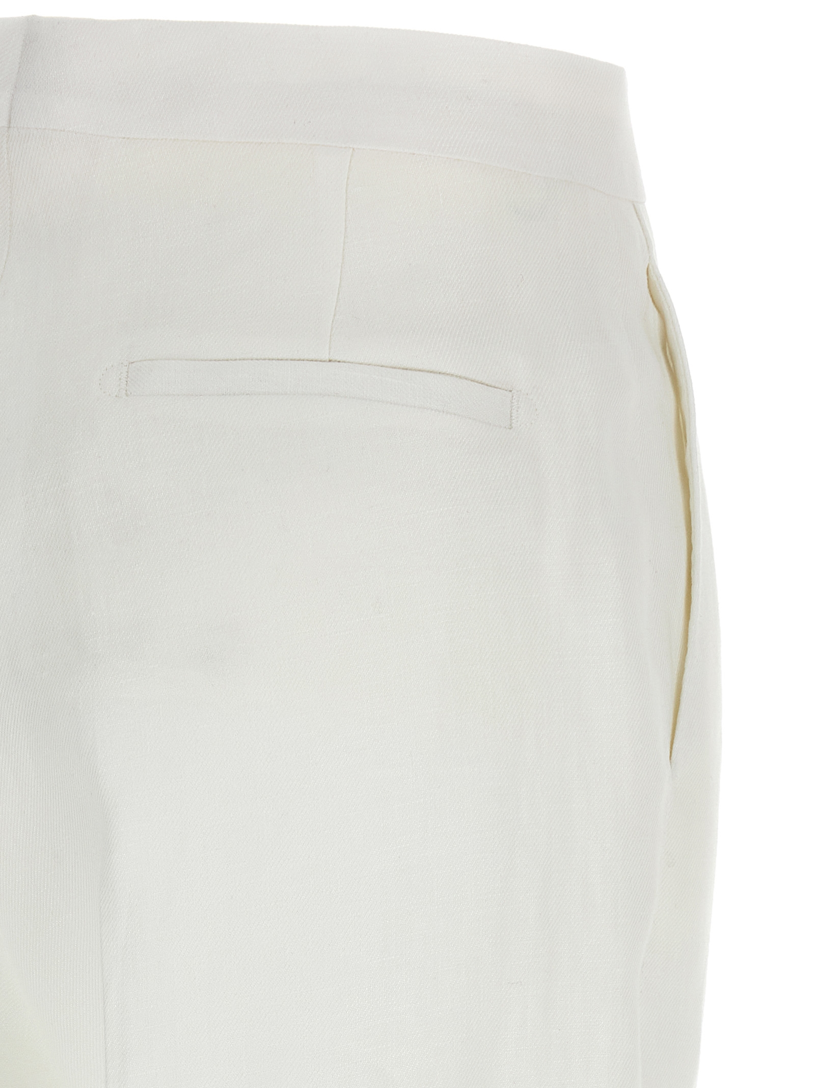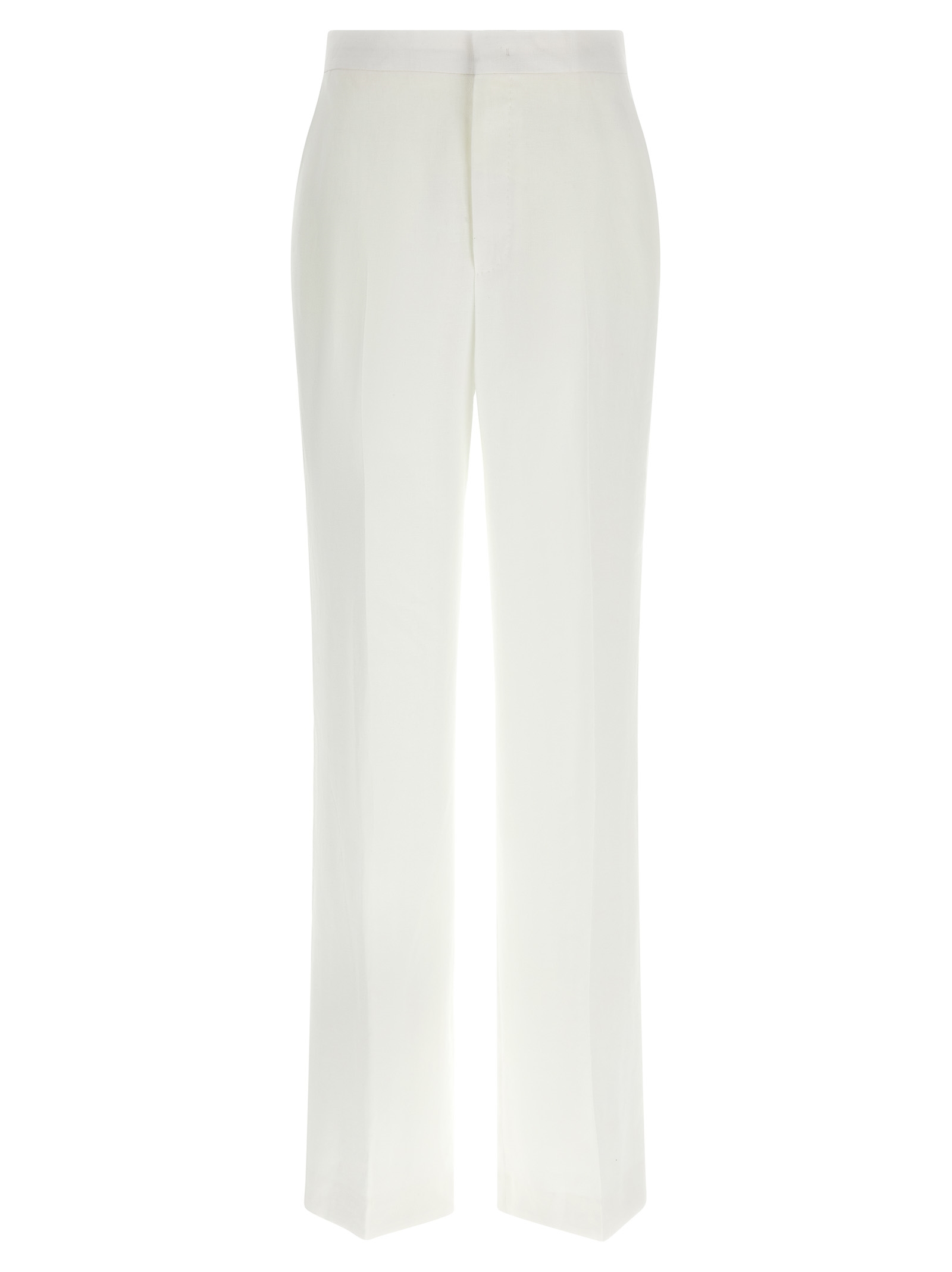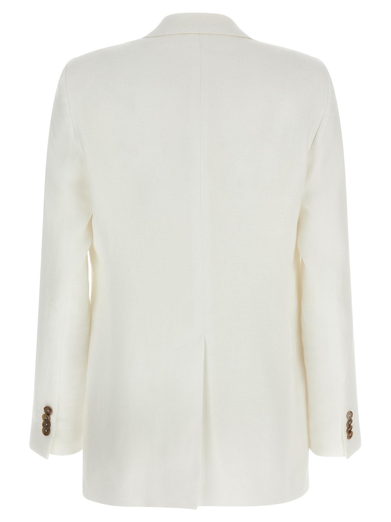 ‘Adrianne’ linen dress consisting of single-breasted blazer with front horn button closure, mirror lapels, breast pocket, flap pockets, back split, cupro lining and trousers with stretched pleat, wide and straight leg, front French pockets, back welt pockets, zip and front hook closure, cupro blend lining.