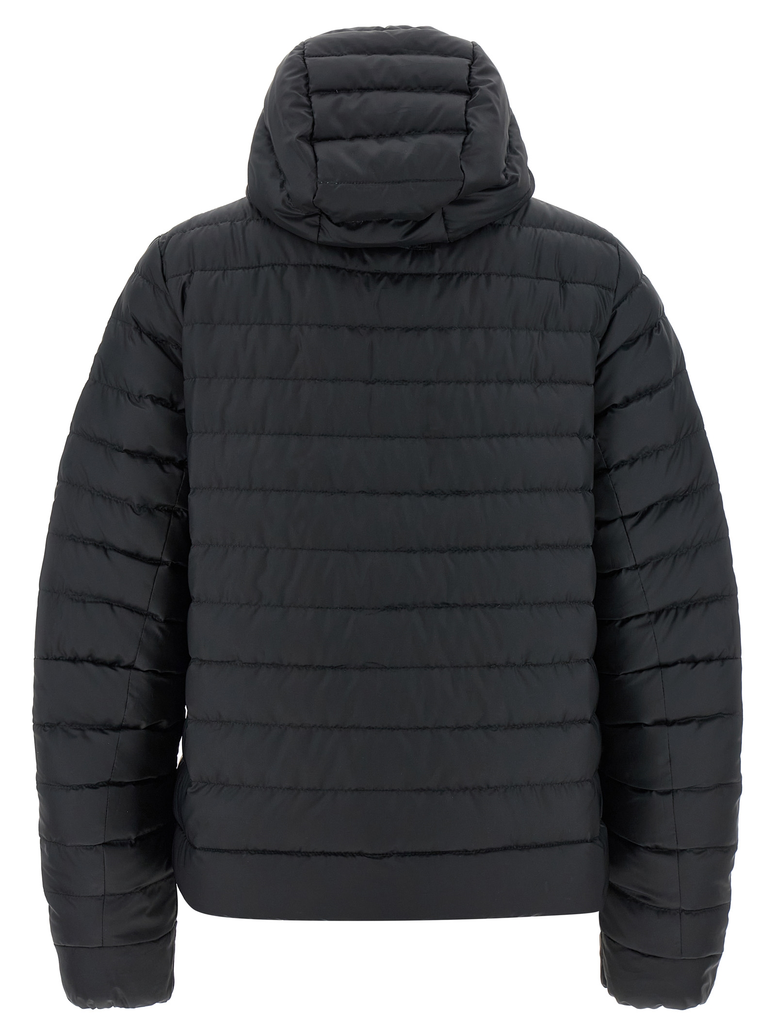 ‘Aethera’ water-repellent down jacket with ripstop structure, quilted and slightly goose feather padding, hood, front zip closure, pockets, long sleeves with elastic cuffs and tone-on-tone logo patch appliqué, drawstring on the hem, foldable in the right pocket.
