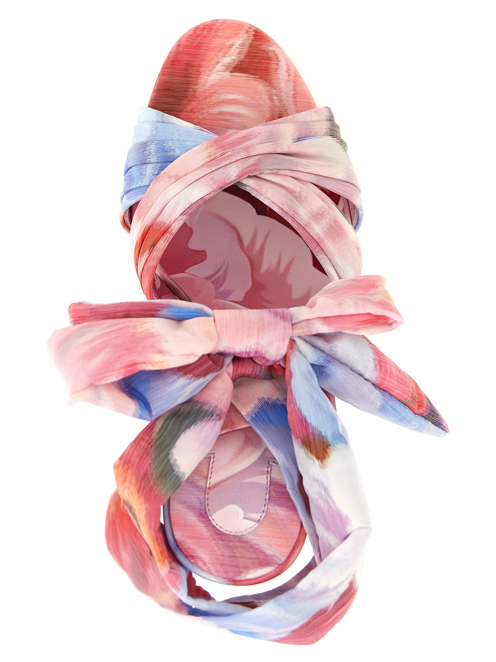 ‘Affabula’ sandals in Peonies’ print chiné fabric, almond toe, front crinkled bands, ankle strap, padded insole, stiletto heel with ‘scrunchie’ effect, ‘Everlasting Red’ sole.