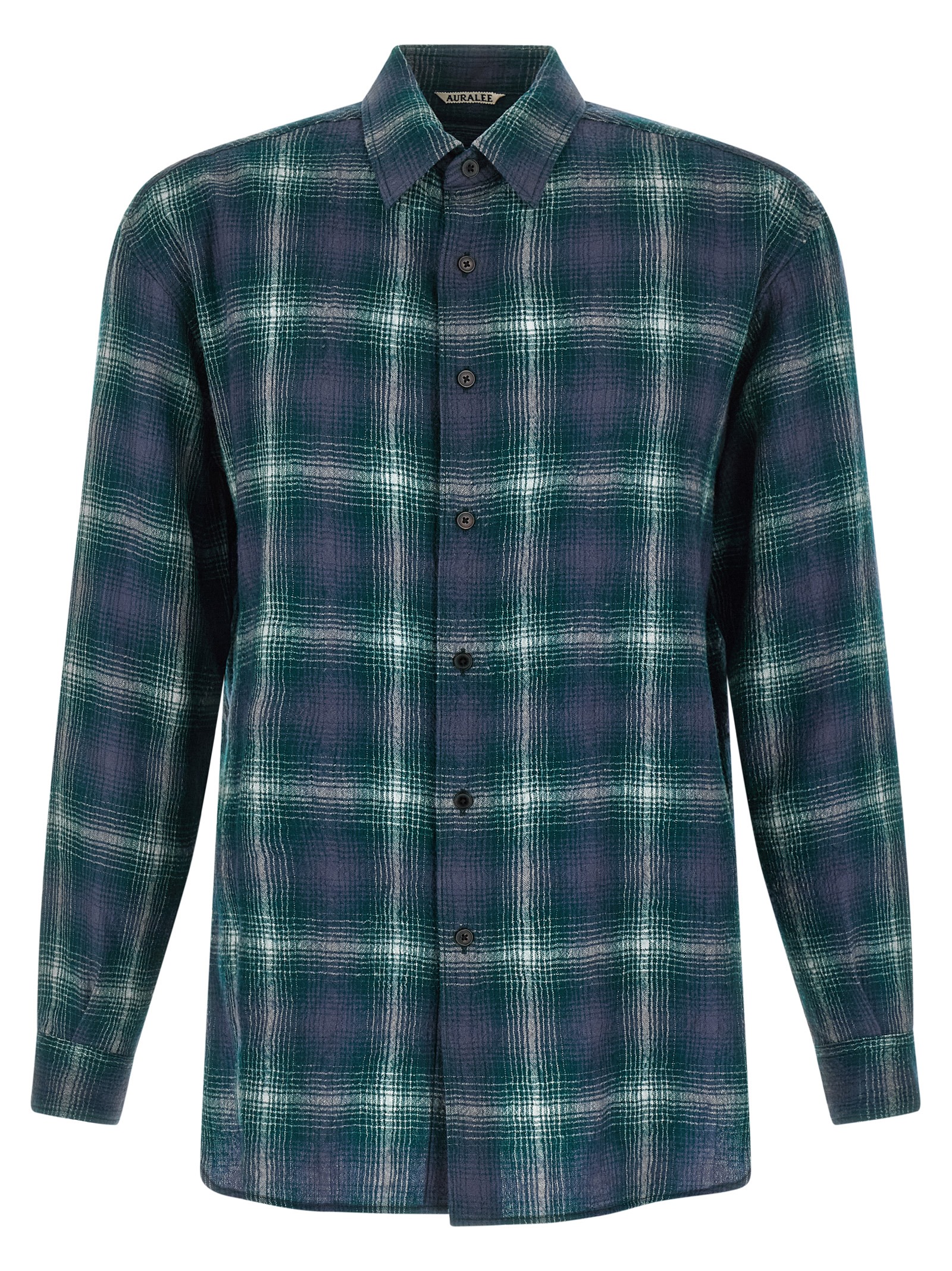 Airy Wool Check’ ultra-fine combed wool shirt with check pattern, front button closure, long cuffed sleeves and dropped shoulders.