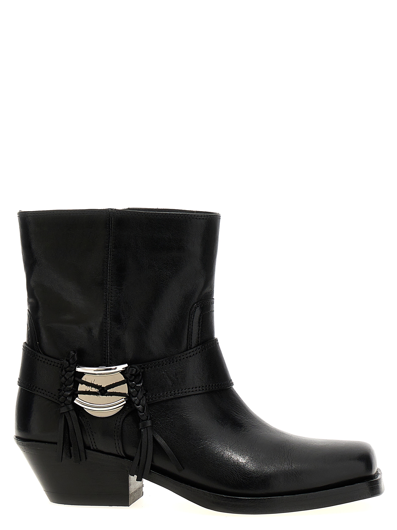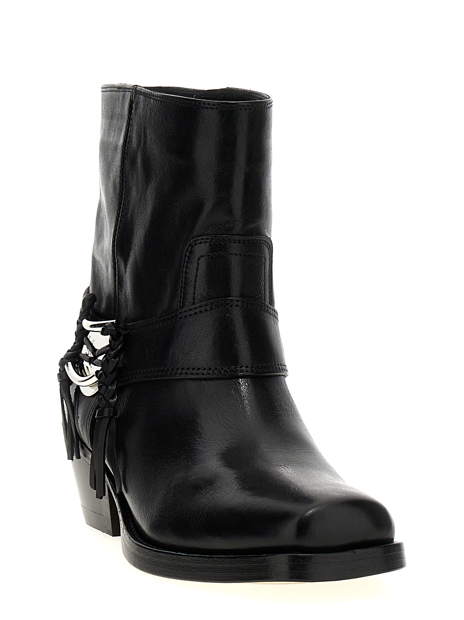‘Akson Gaucho’ leather ankle boots with square toe, leather belt loop with metal and braided leather detail, leather sole, heel.
