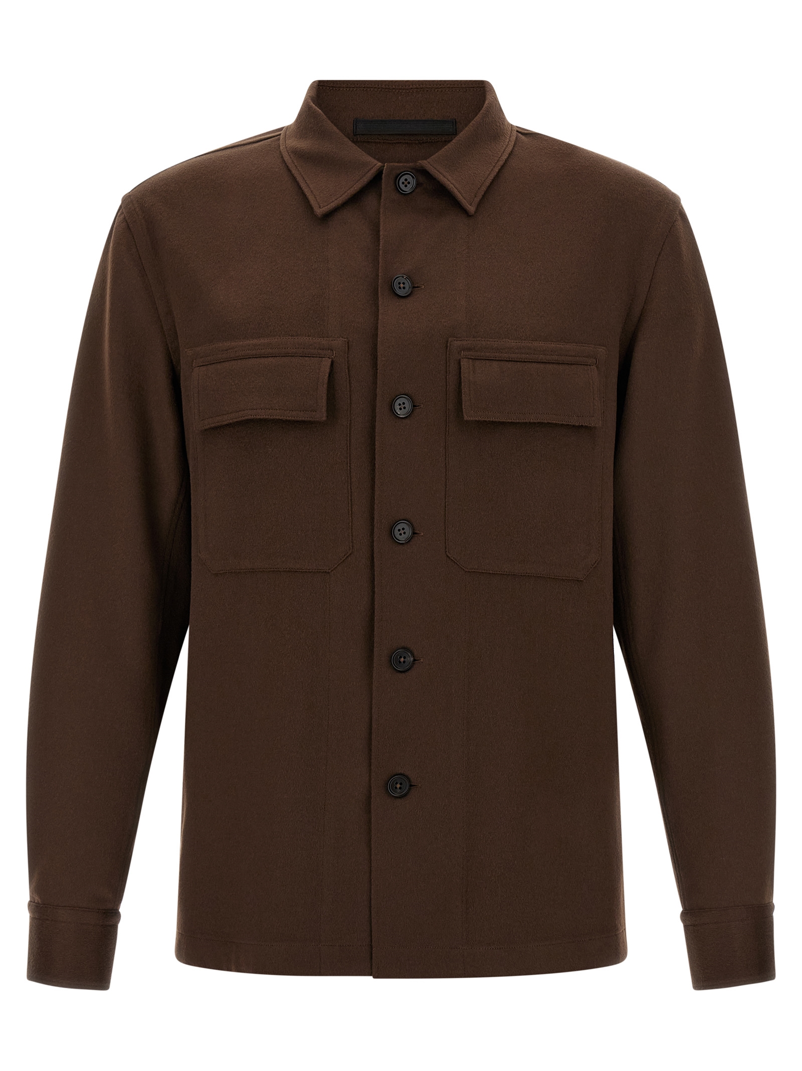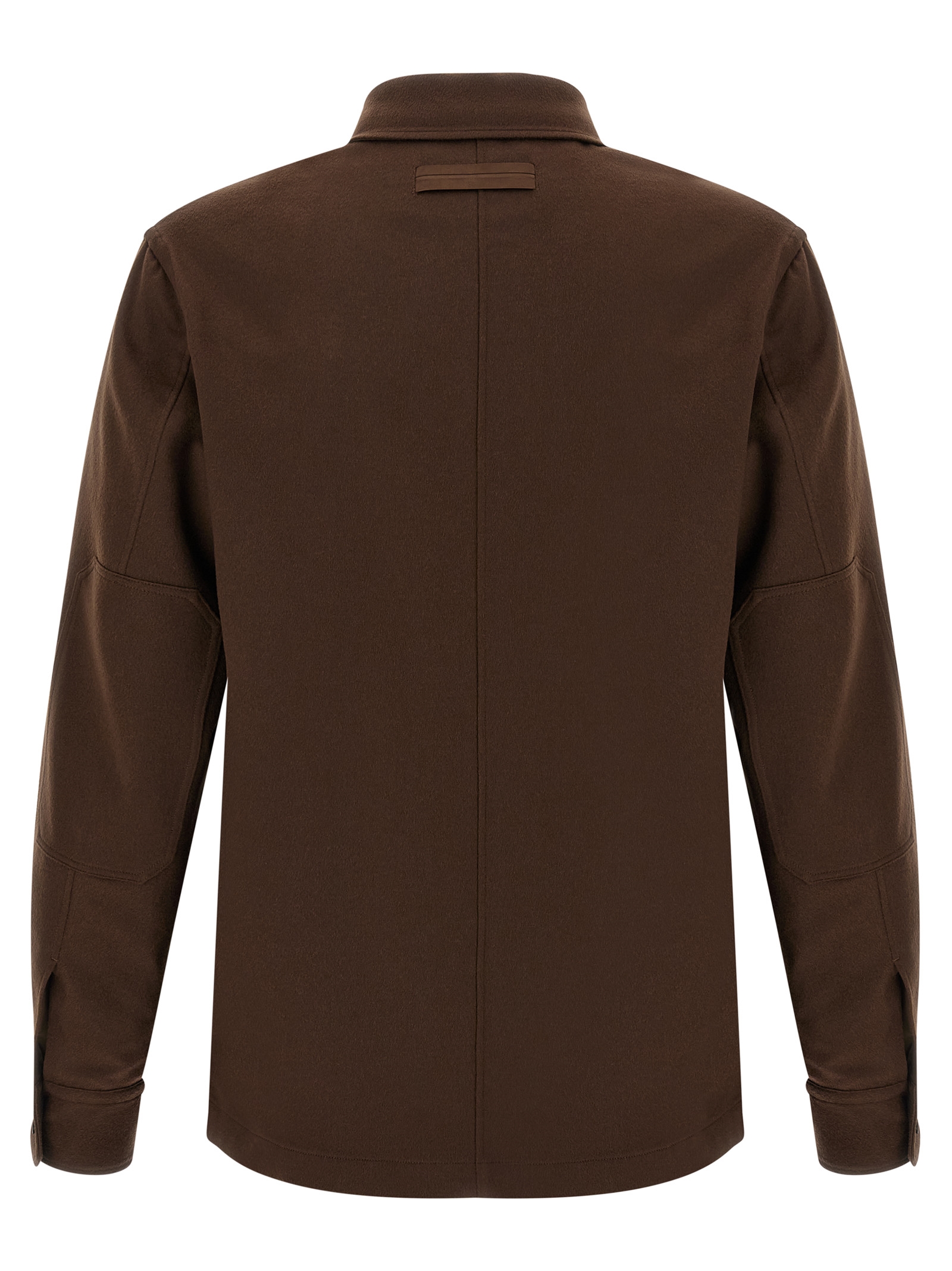 ‘Alba’ cashmere oasis shirt with front button closure, pockets, long cuffed sleeves, side slits, tone-on-tone leather ‘Zegna 232 Road Brand Mark’ patch on the back.