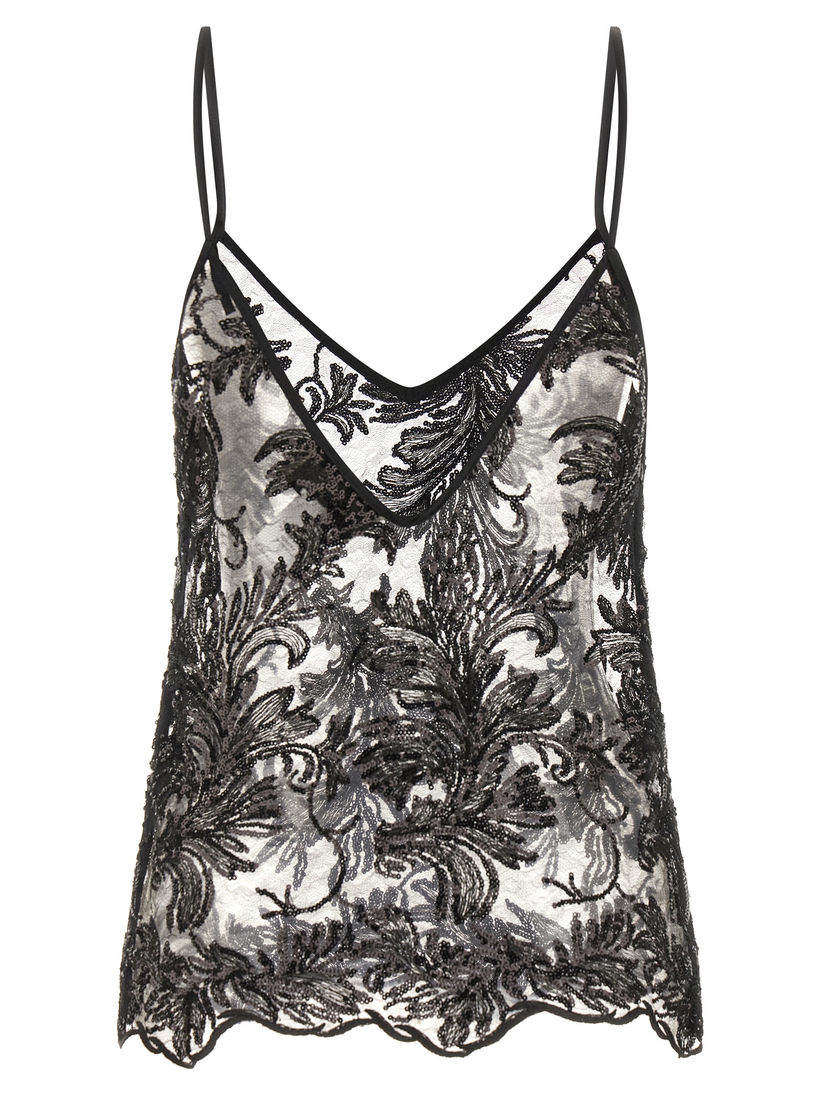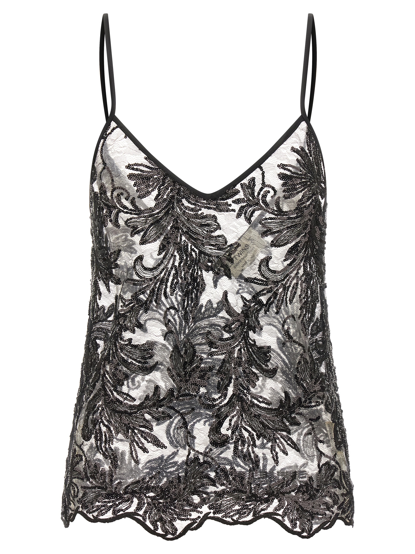 ‘Alba’ semi-transparent lace top with sequin appliqué, wide V-neck front and back, thin straps, and asymmetrical hem.