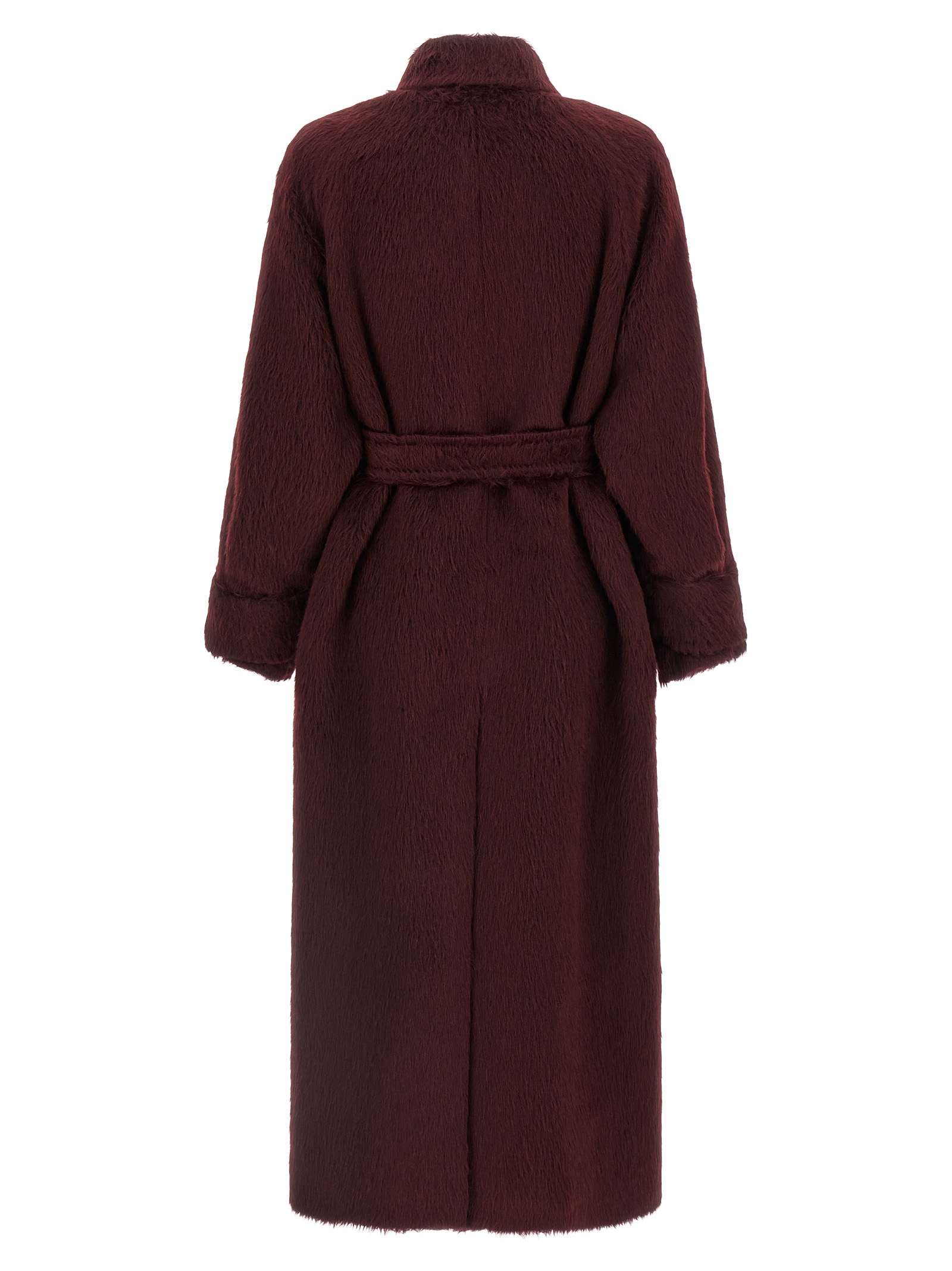 Long ‘Albata1234’ coat in long-haired alpaca and wool fabric with robe style, lapel collar, pockets, long raglan sleeves, back split, viscose lining with M monogram jacquard, removable belt.