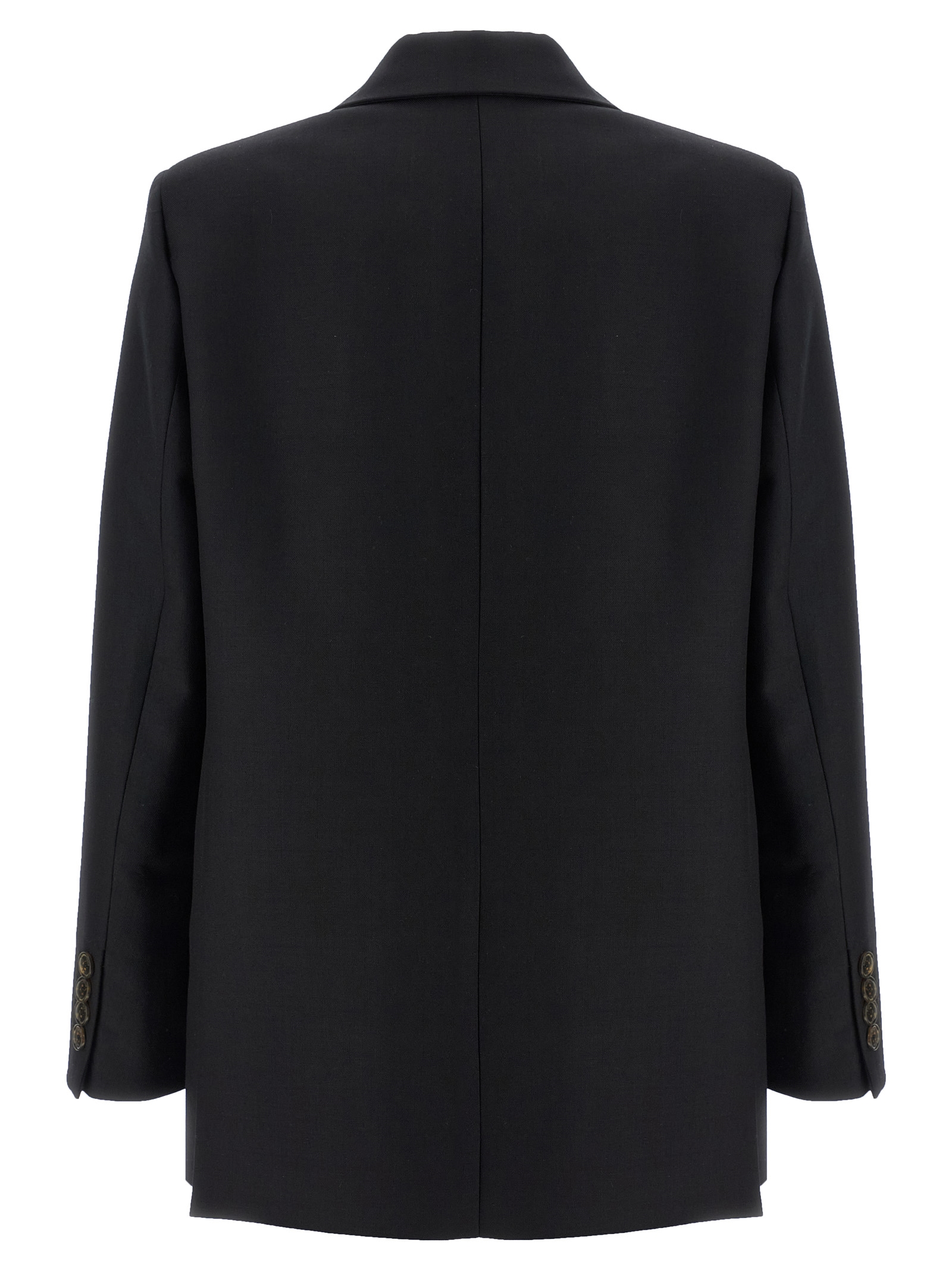 ‘Alcanara Everynight’ double-breasted blazer in lightweight virgin wool twill with front tortoiseshell button closure, peak lapels, breast pocket, ‘Smiley’ pockets, four inner pockets, long sleeves, square shoulder with slightly padded shoulder strap, back vents, monogram viscose lining.