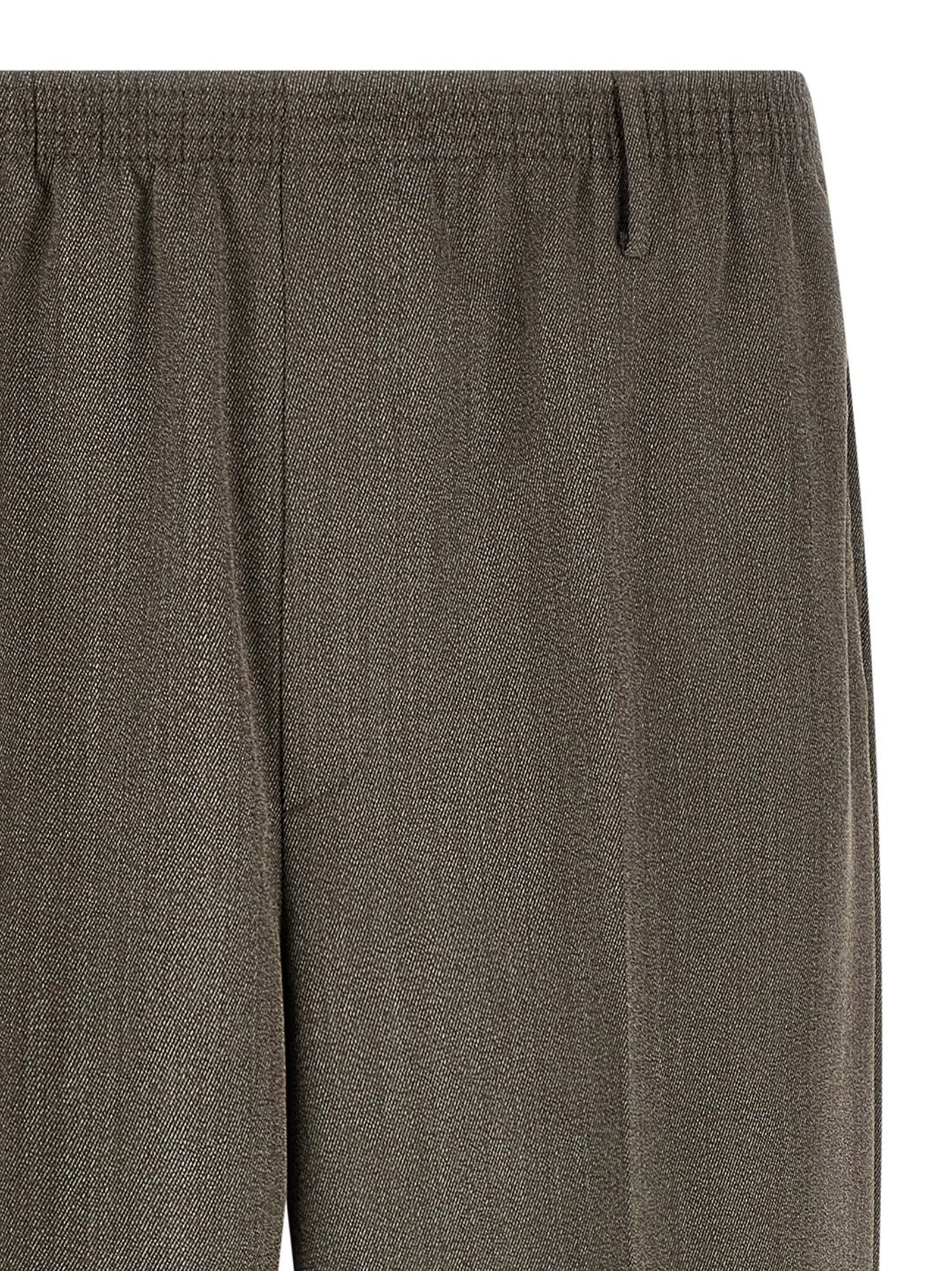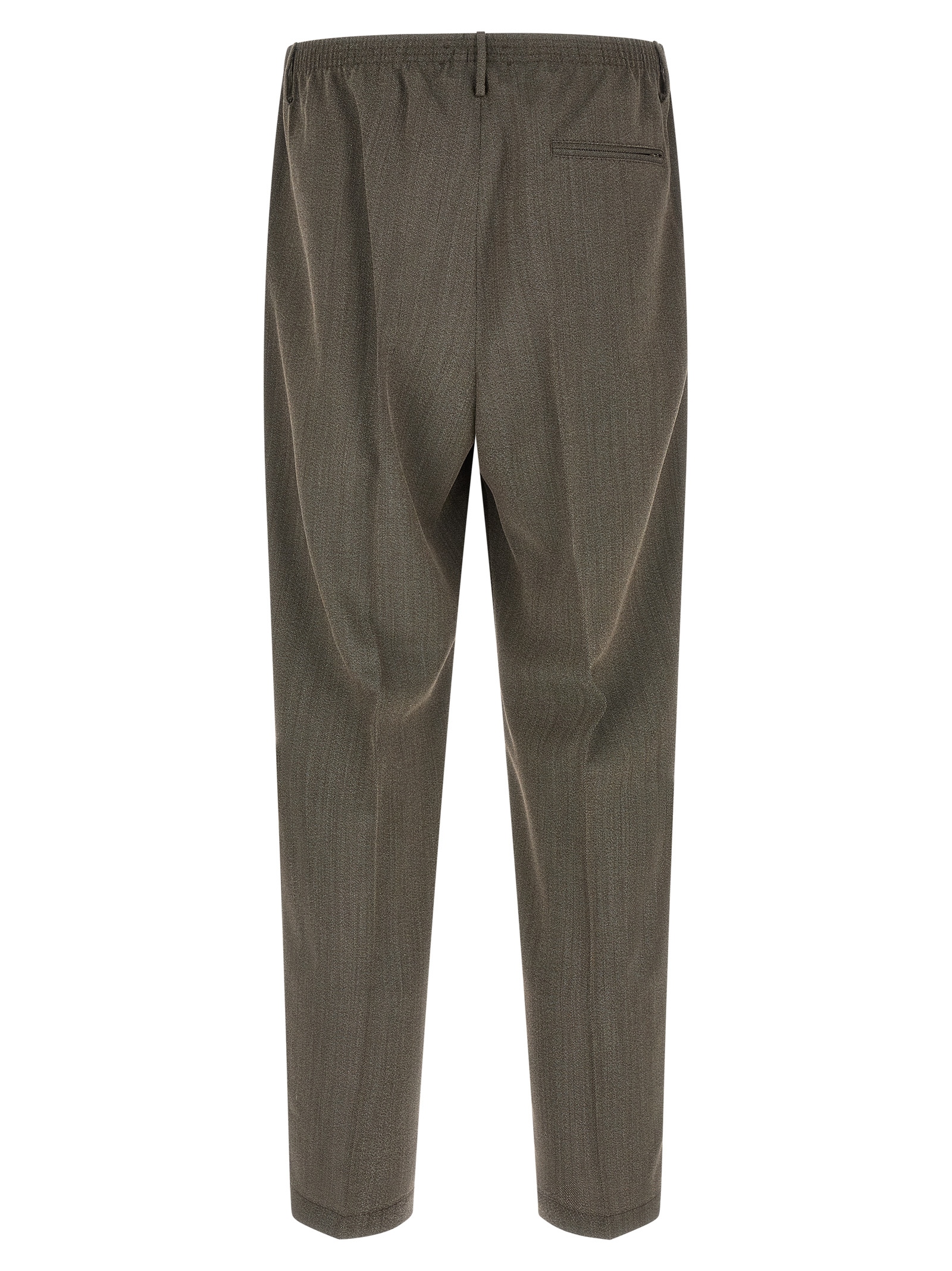 ‘Alfred Bl’ mélange virgin wool trousers, tapered wide leg, stretched pleat, elastic waistband, trompe l’oeil flap, pockets.