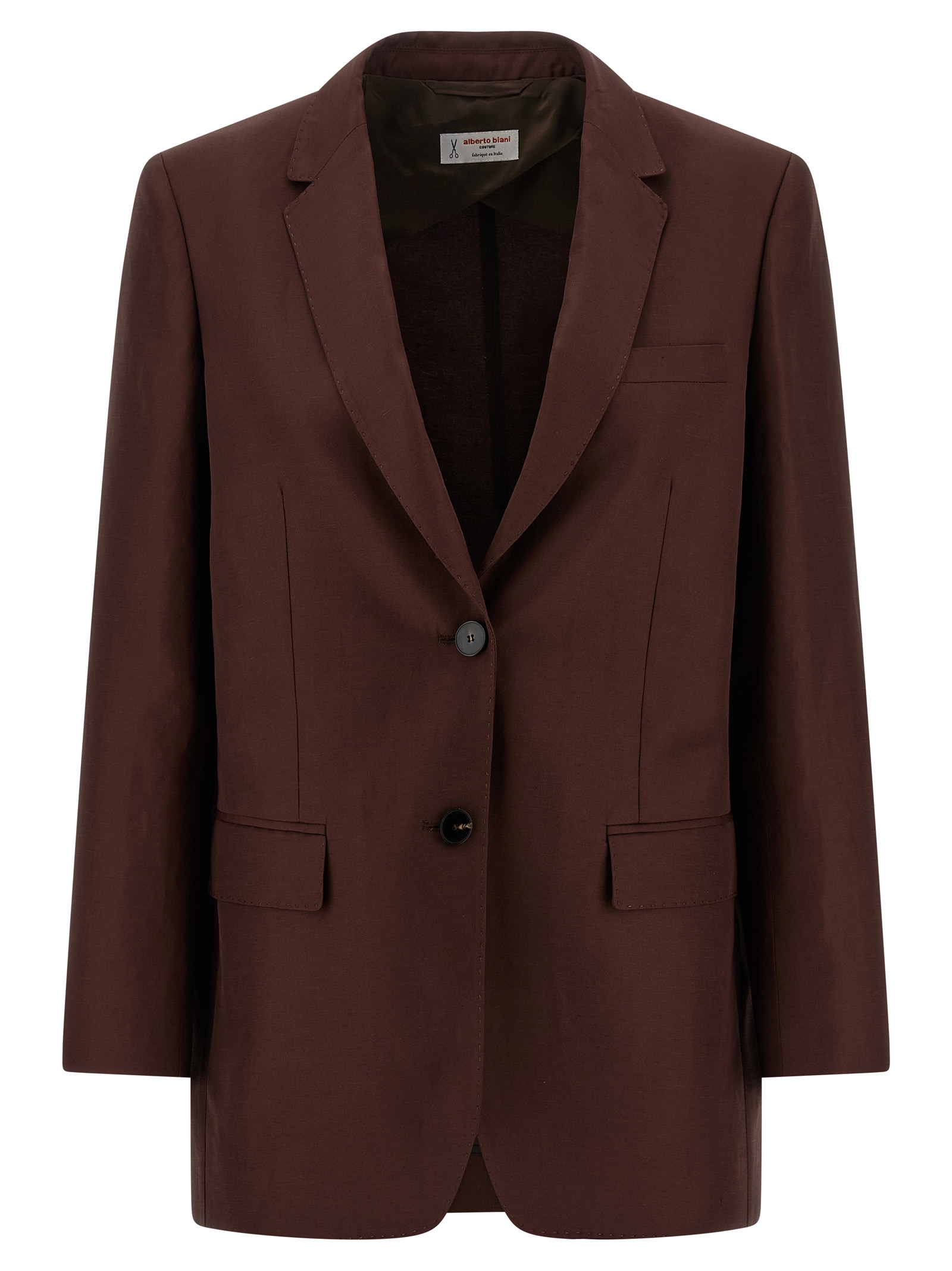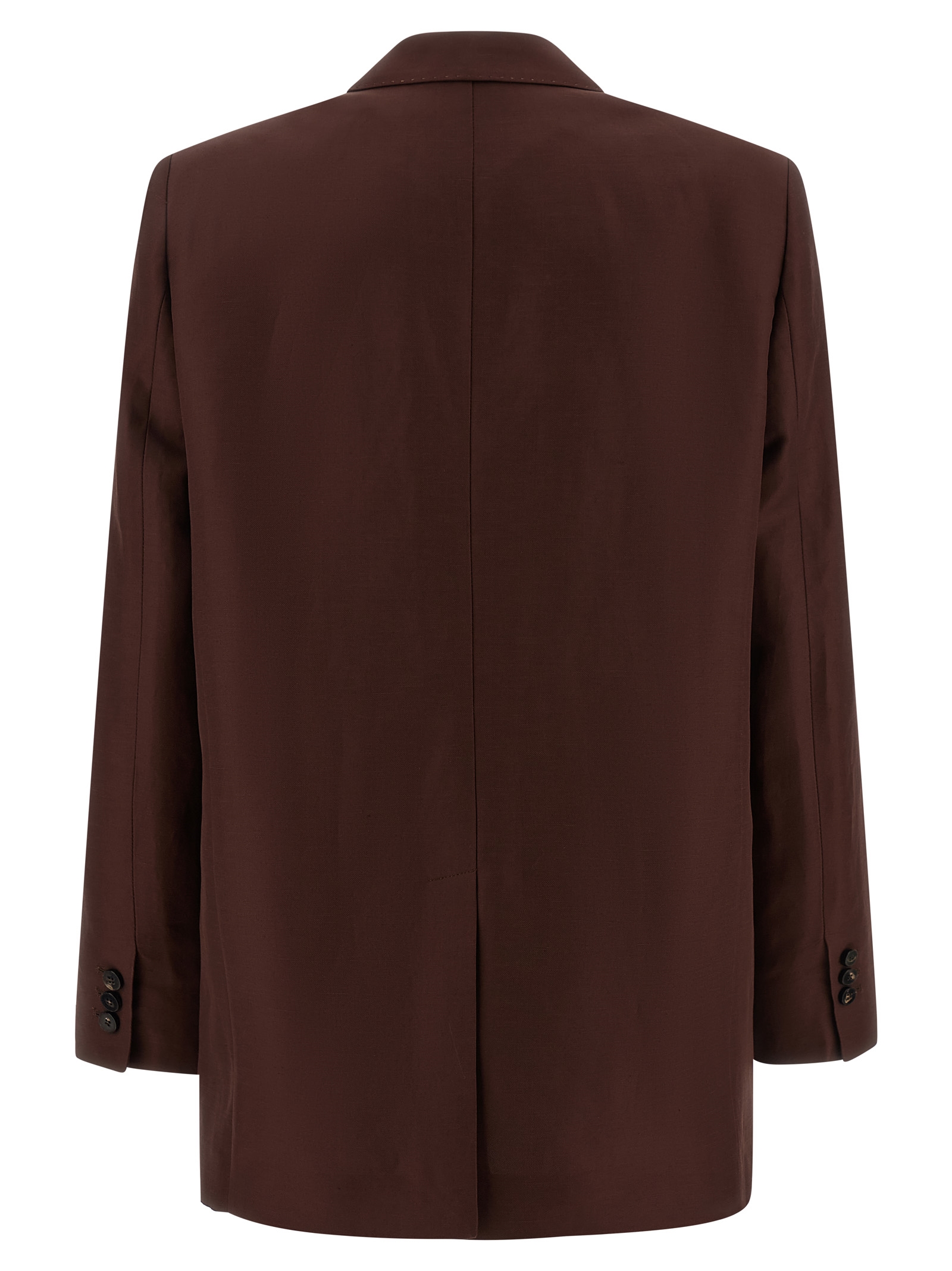 ‘America’ single-breasted blazer in viscose and linen blend with front horn button closure, visible stitching, mirror lapels, breast pocket, flap pockets, structured shoulder strap, long sleeves, back split, unlined.