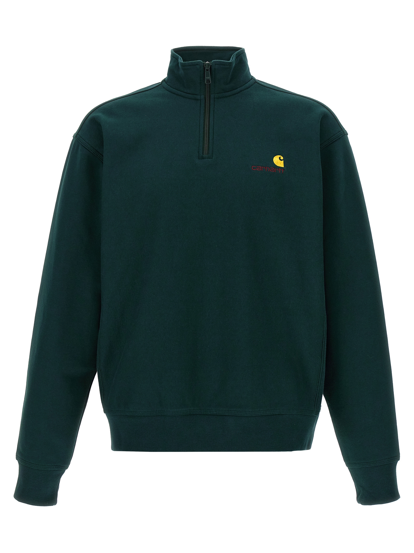 ‘American Script’ cotton blend sweatshirt with half zip high neck, logo embroidery, long cuffed sleeves.