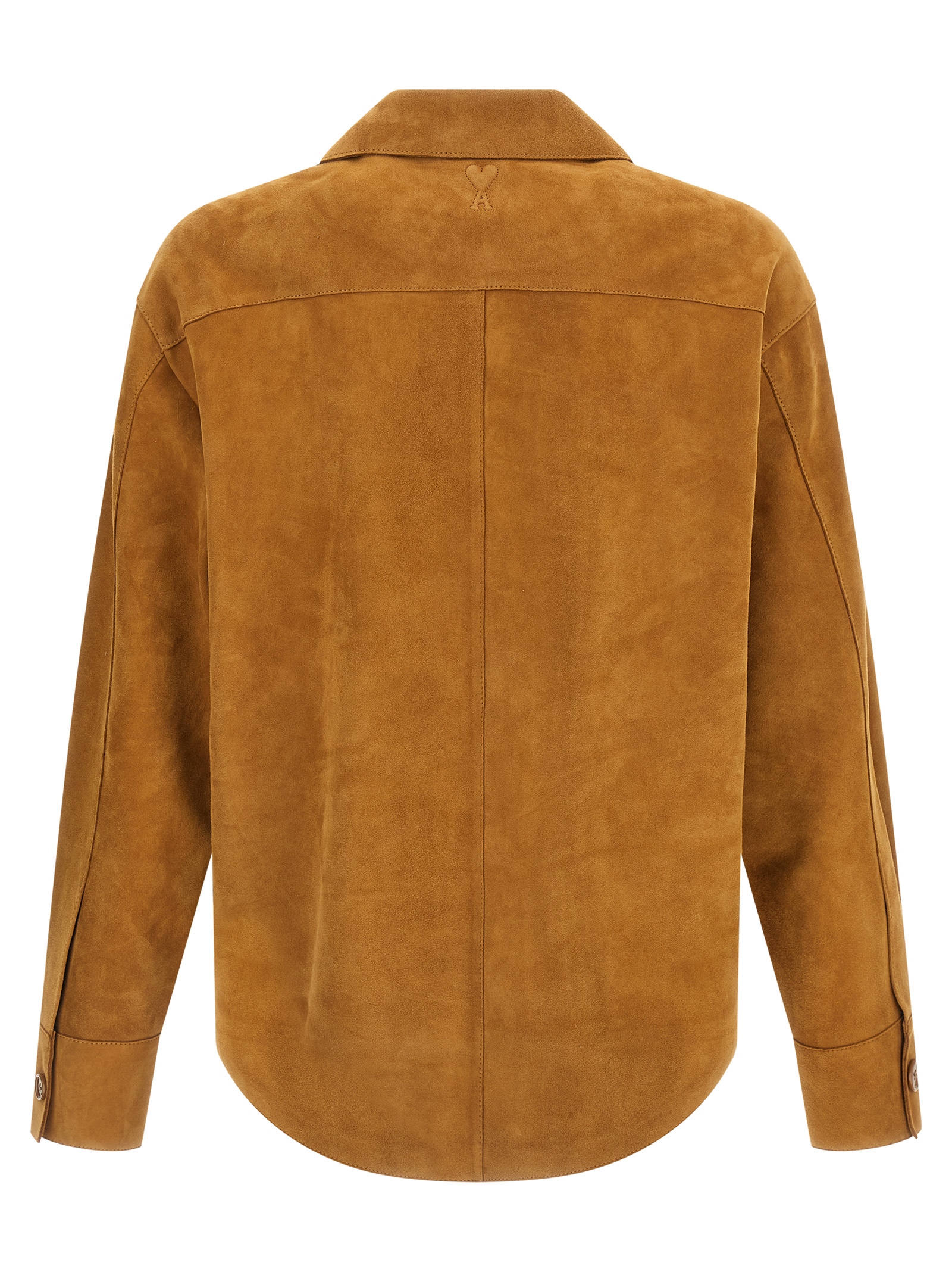 Suede overshirt, embossed and stitched ‘Ami de Coeur’ logo at the back, shirt collar, front button closure, long sleeves with cuffs and dropped shoulders, unlined.