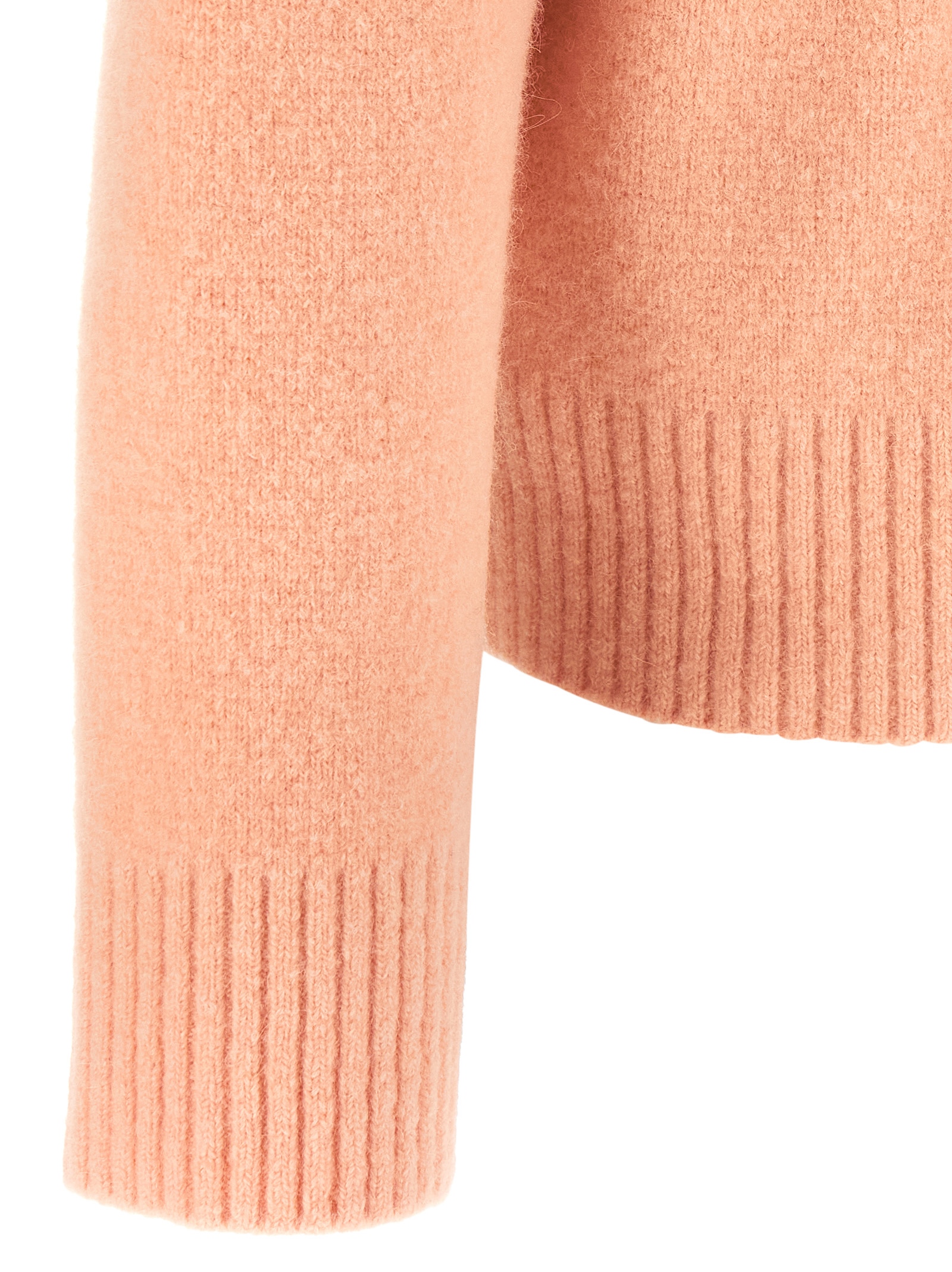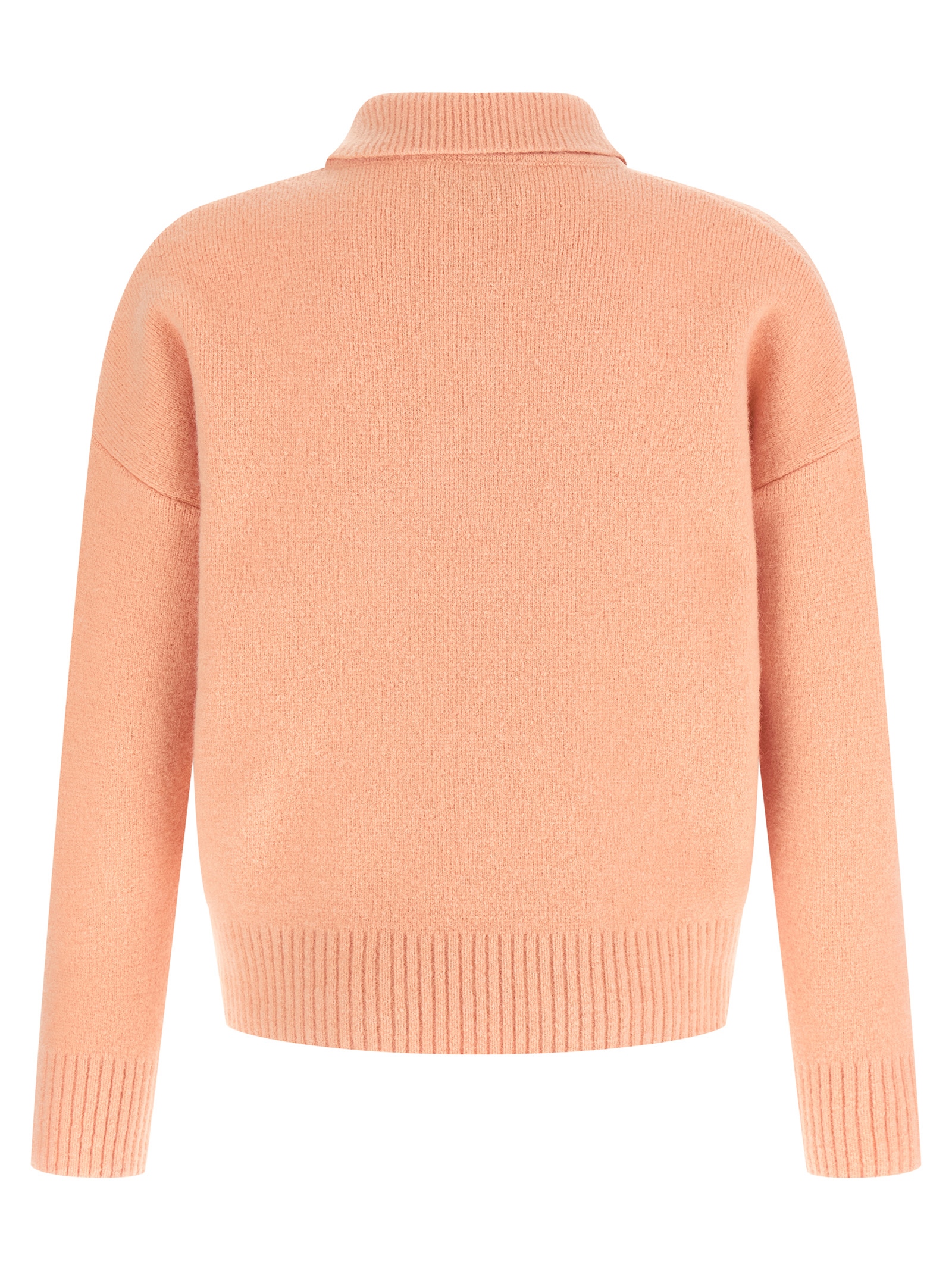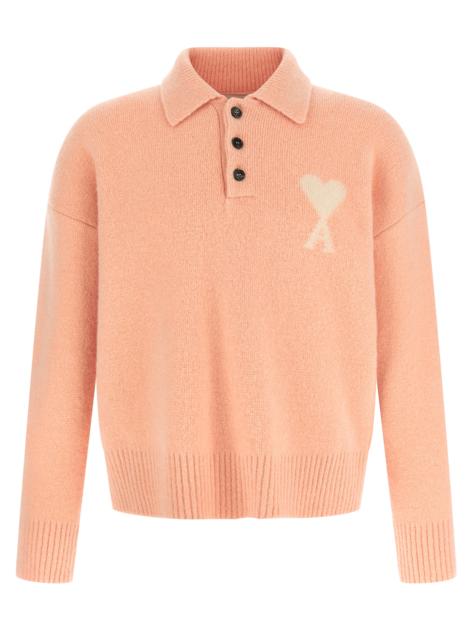 Felted merino wool knit polo shirt with contrast ‘Ami De Coeur’ intarsia on the front, collar and buttons, long cuffed sleeves and dropped shoulders.