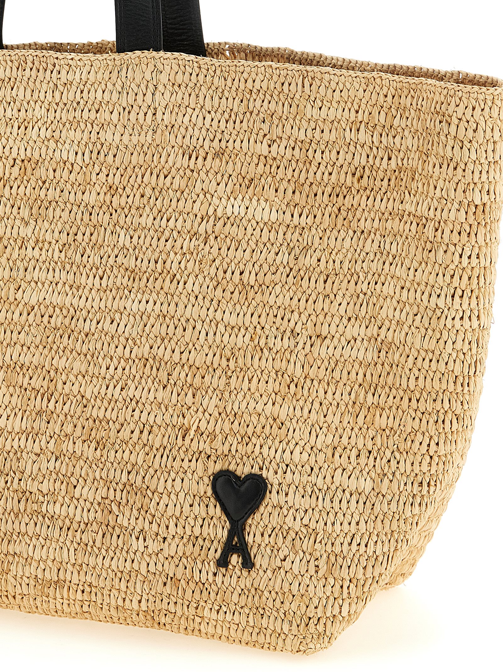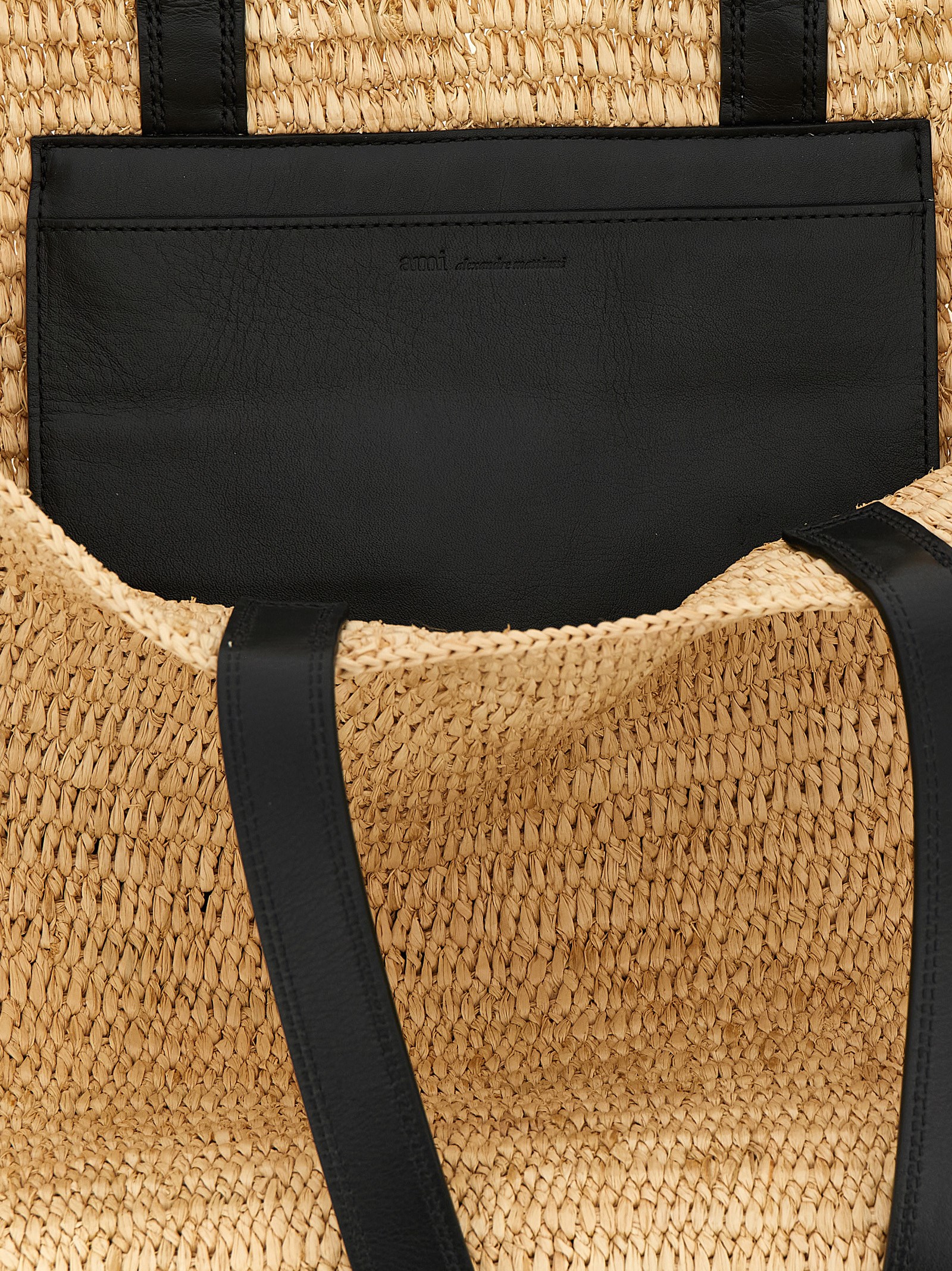 Braided raffia shopping bag with contrasting smooth leather details, front ‘Ami de Coeur’ patch, double fixed handle, inner pocket, unlined.