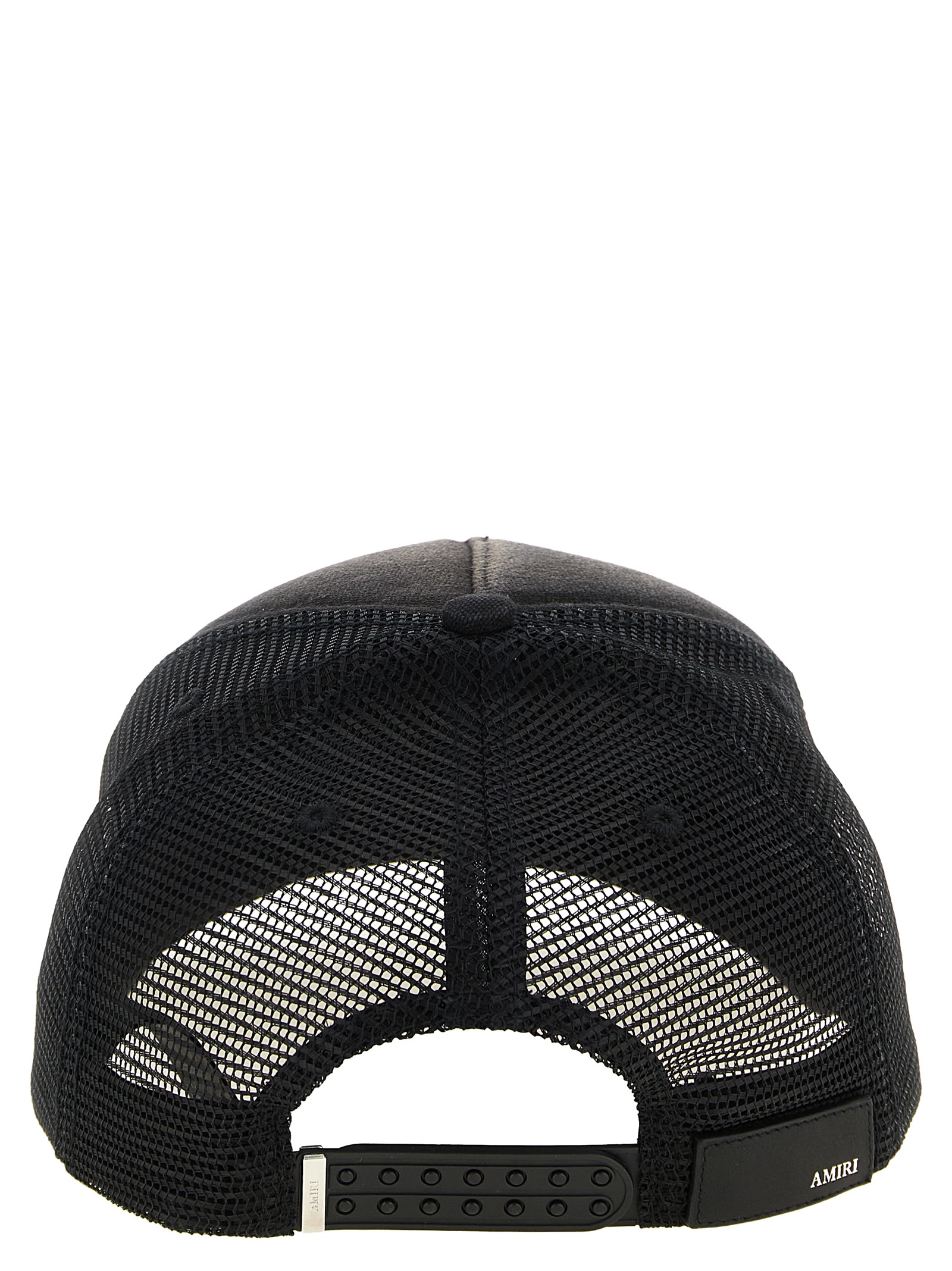 ‘Amiri Hollywood Trucker’ cap consisting of a used-effect canvas front and a mesh back, baseball model, curved visor, contrasting logo embroidery on the front, and adjustable strap on the back.
