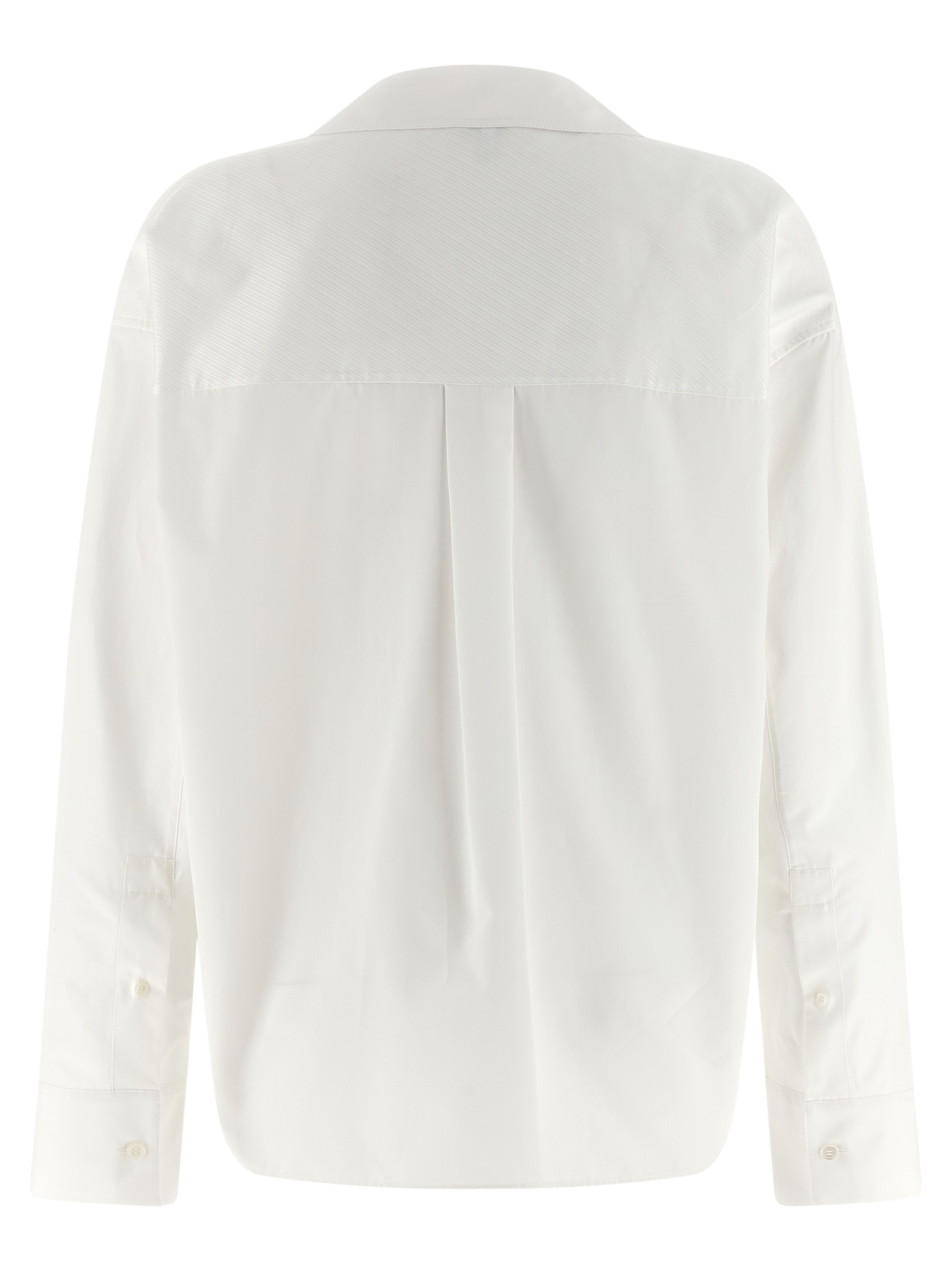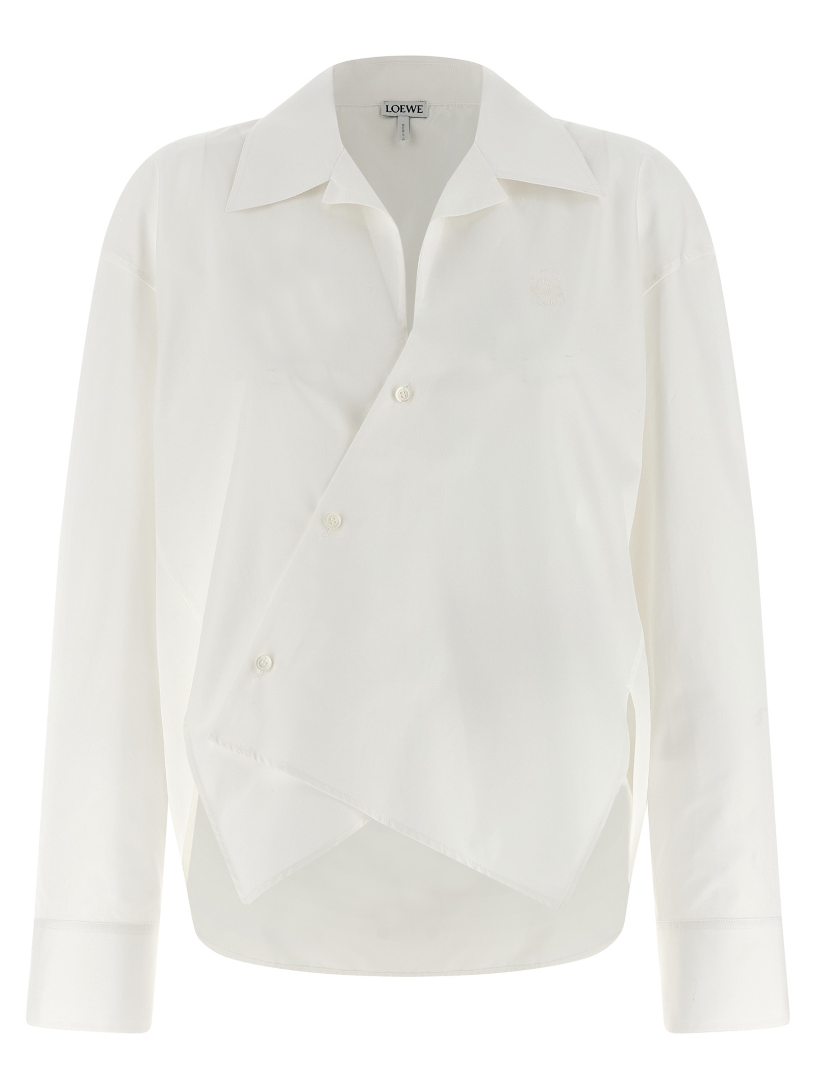 Light cotton poplin shirt with front diagonal button closure, camp collar, tonal ‘Anagram’ embroidery on the front, long wide sleeves with cuffs and dropped shoulder, side slits, asymmetrical hem.