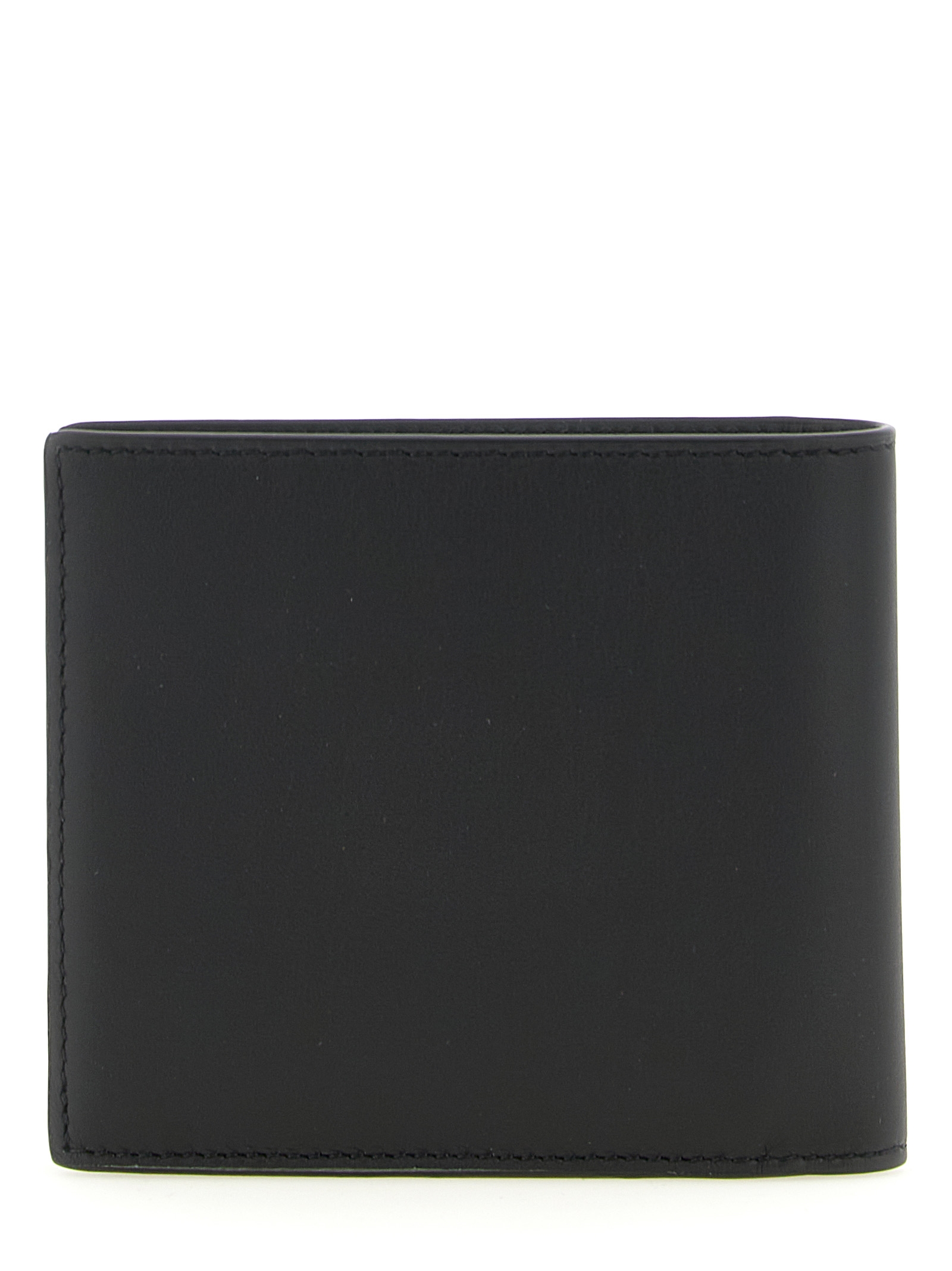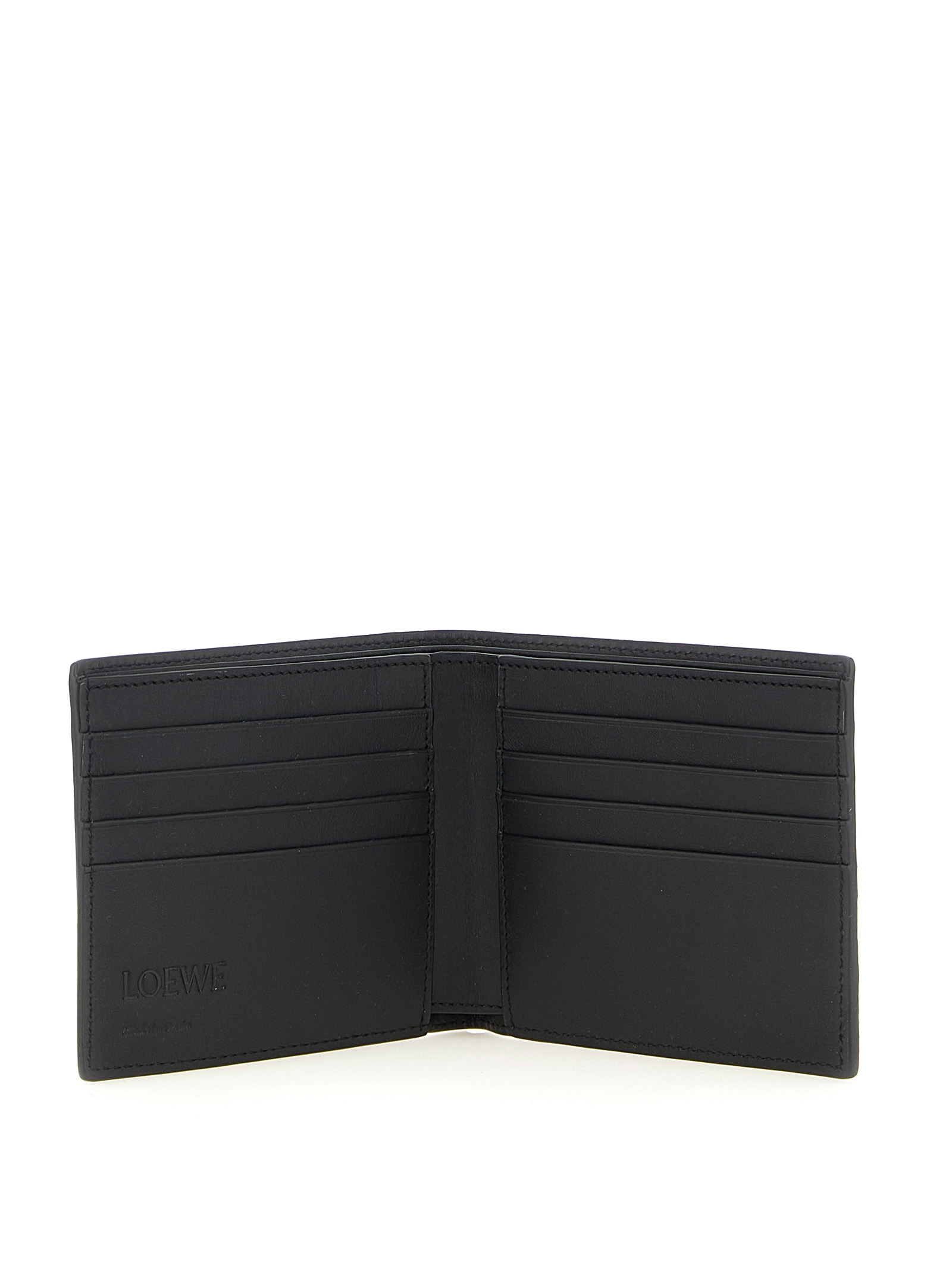 Satin calf leather wallet, bifold model, tone-on-tone patch with embossed LOEWE anagram pattern, and book opening.