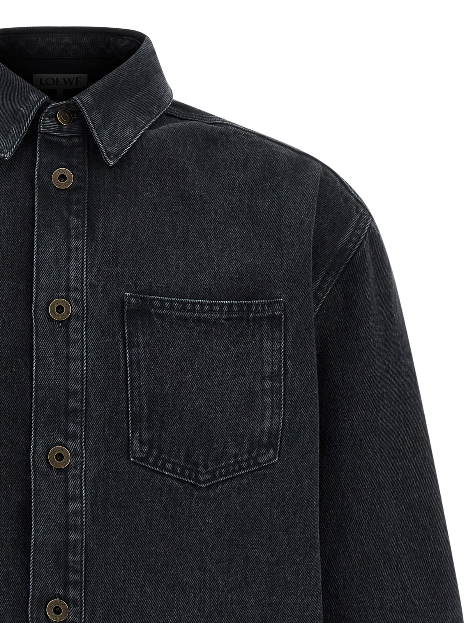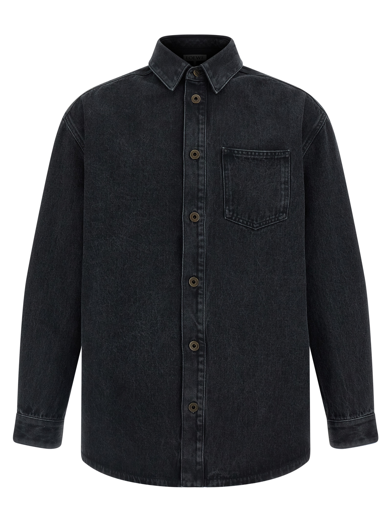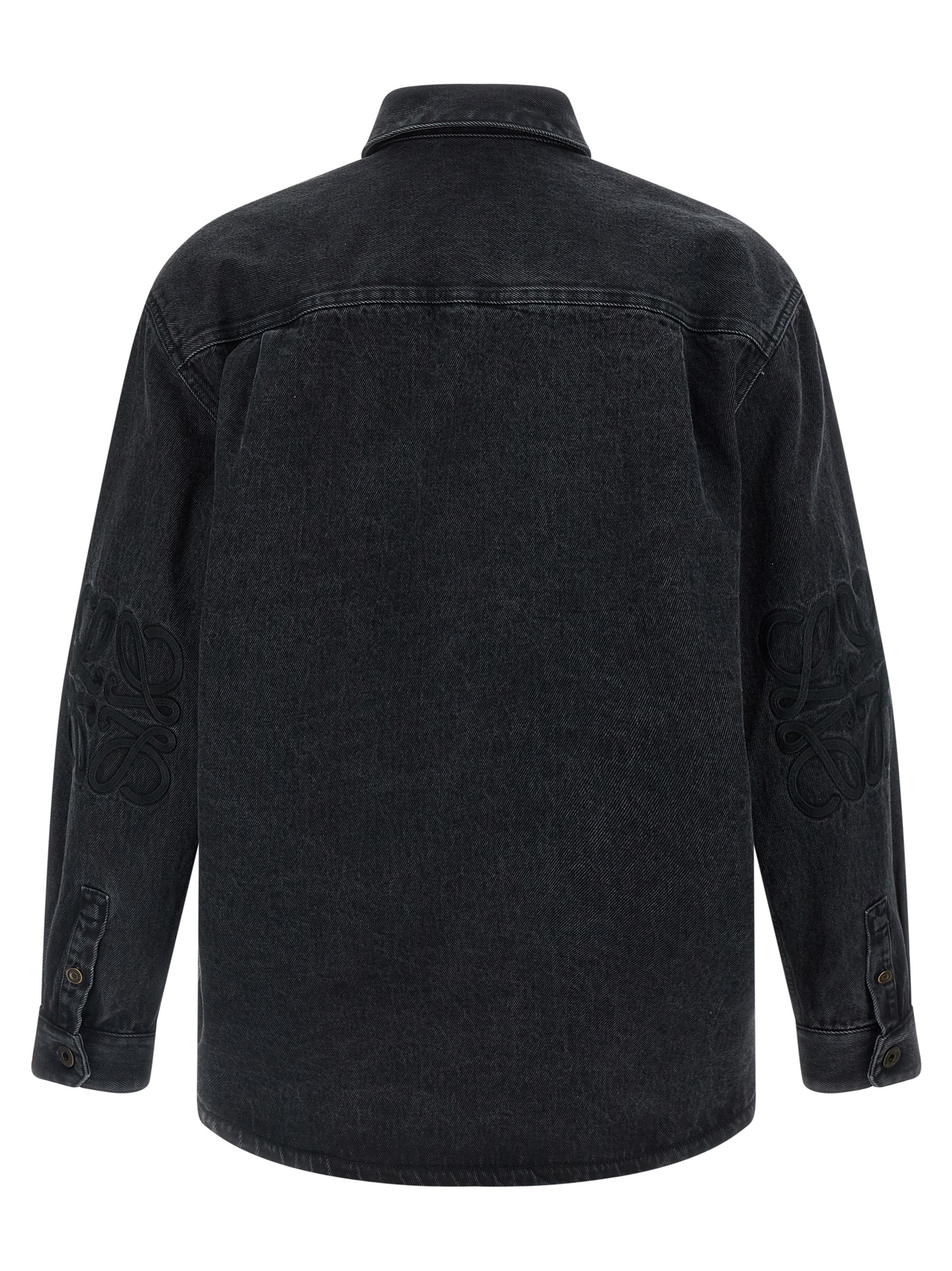 Medium weight cotton denim overshirt, chest pocket, front metal button closure, long cuffed sleeves and tone-on-tone ‘Anagram’ embroidery on the elbow.