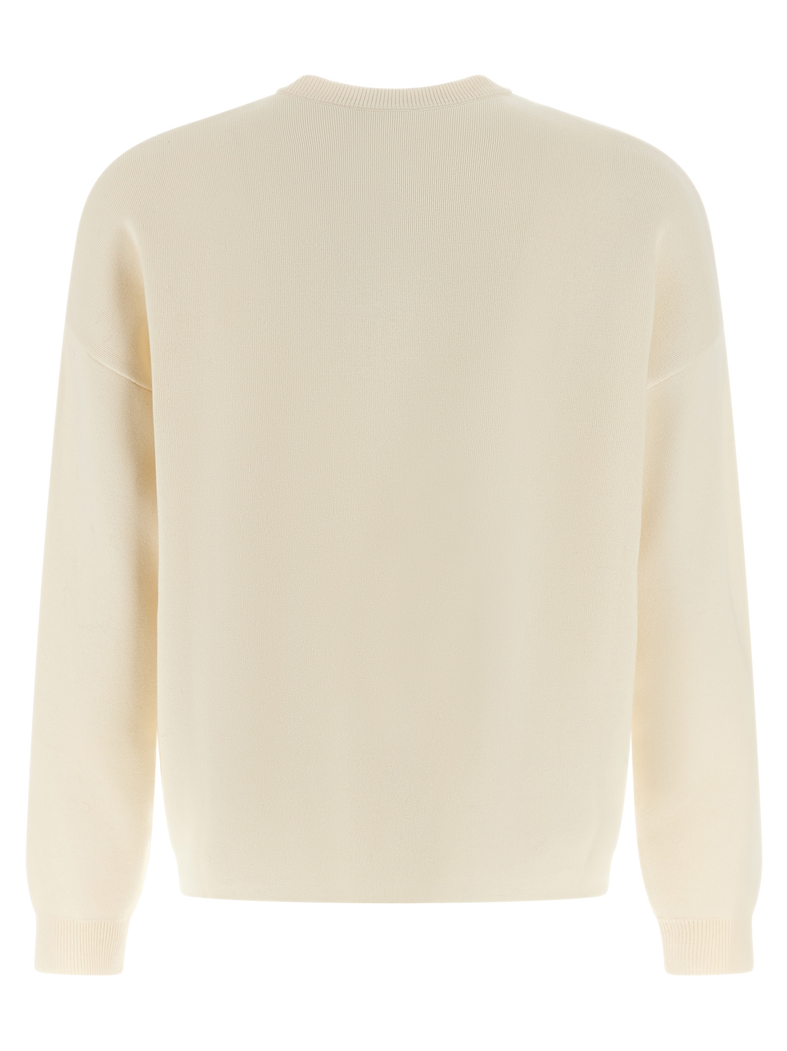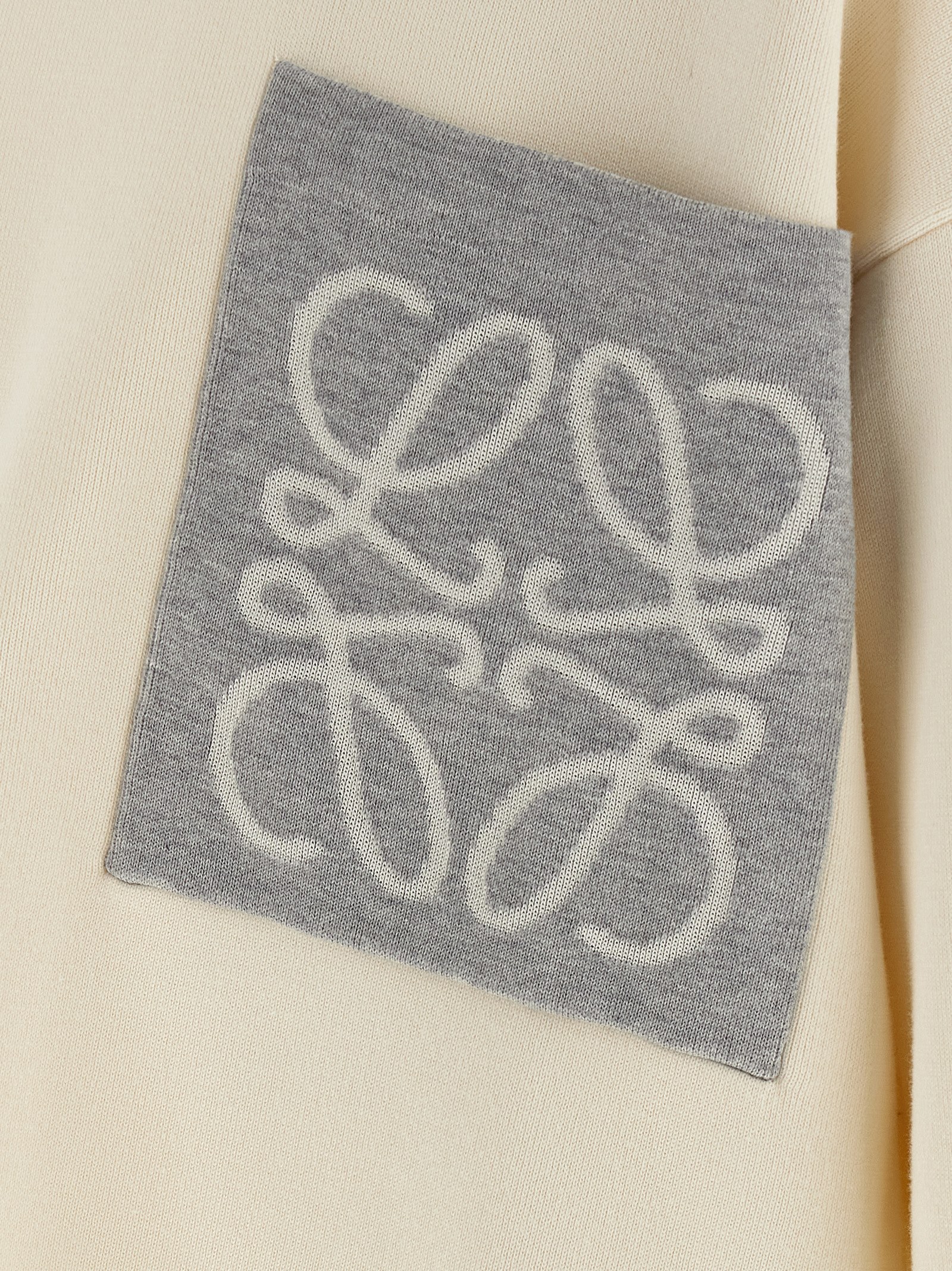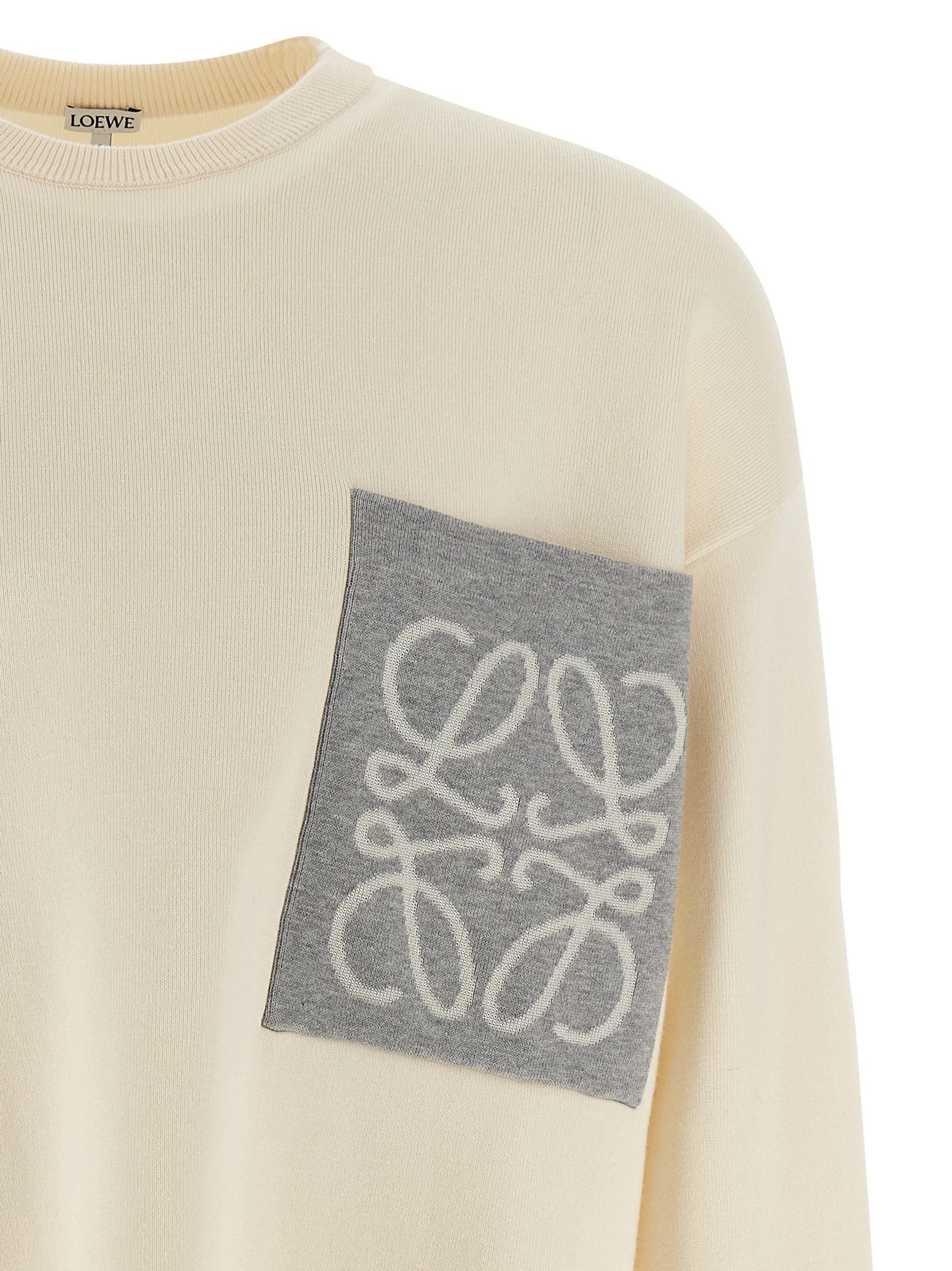 Double-sided knit medium weight cotton blend sweater, contrasting Anagram inlay pocket, round neckline, long sleeves with cuffs and dropped shoulders, and raw cut hem.