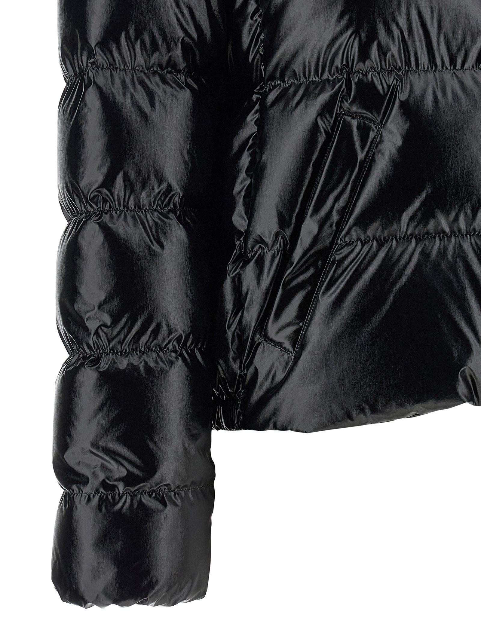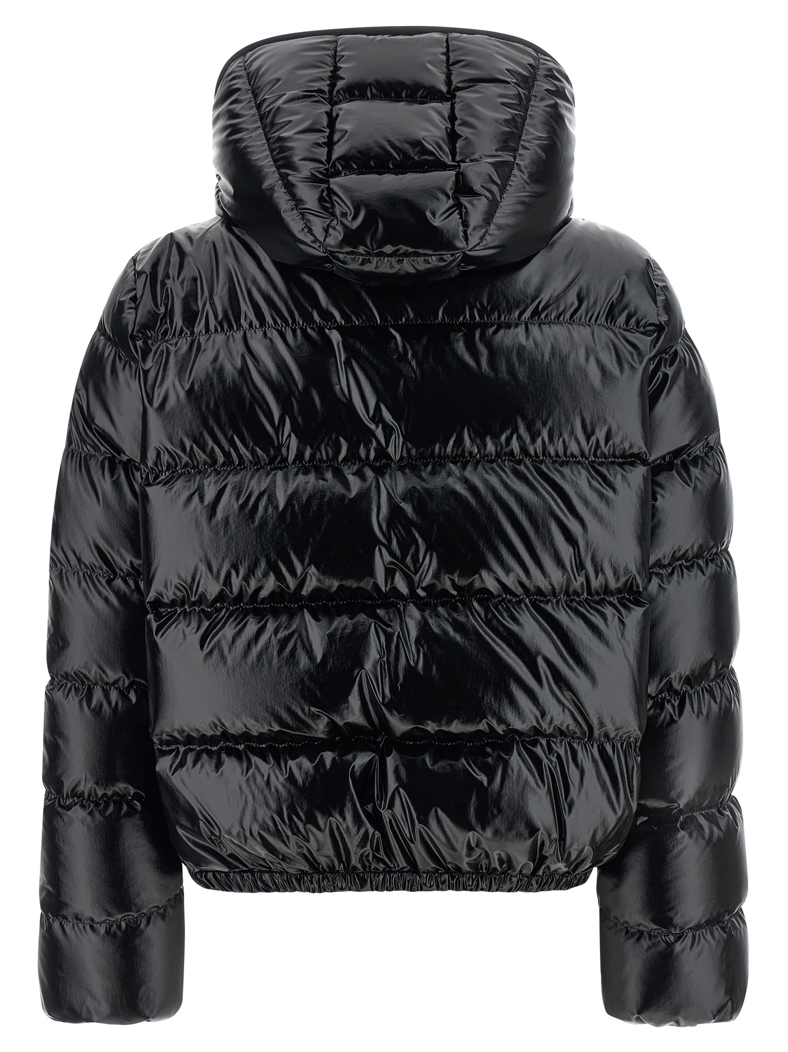 ‘Andro’ short quilted nylon down jacket, saison goose feather padded longue lining, adjustable and removable hood, standing collar, felt logo patch and front zip closure, long sleeves with elastic cuffs, elastic hem.