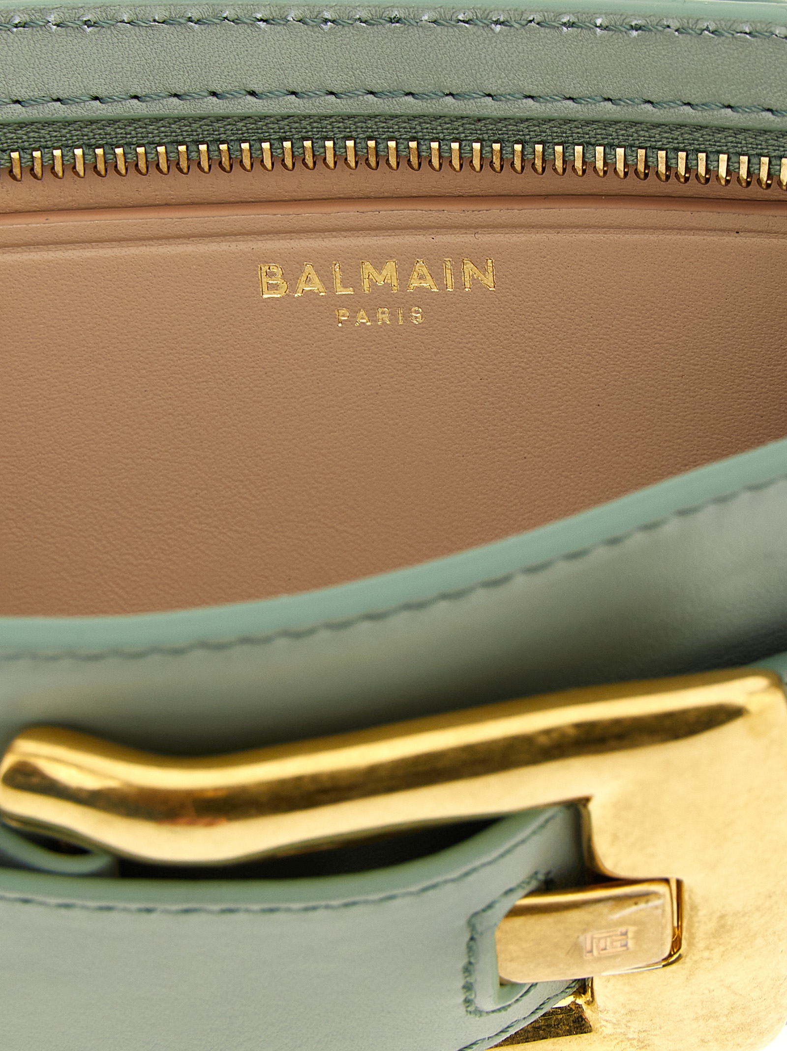 Calf leather clutch bag, tone-on-tone belt detail with antiqued metal ‘Anthem’ buckle, top zip closure, chain handle with removable leather protection.