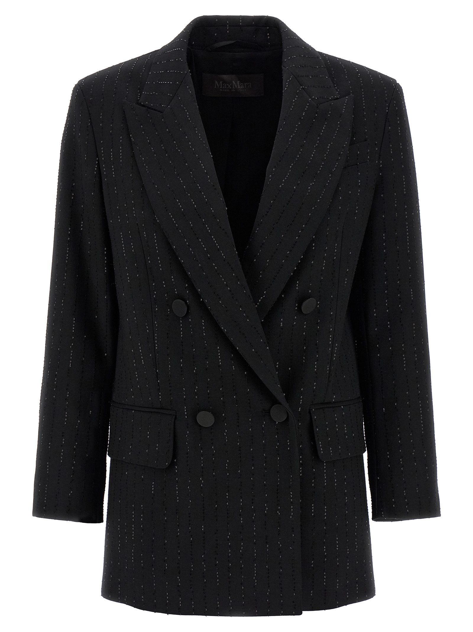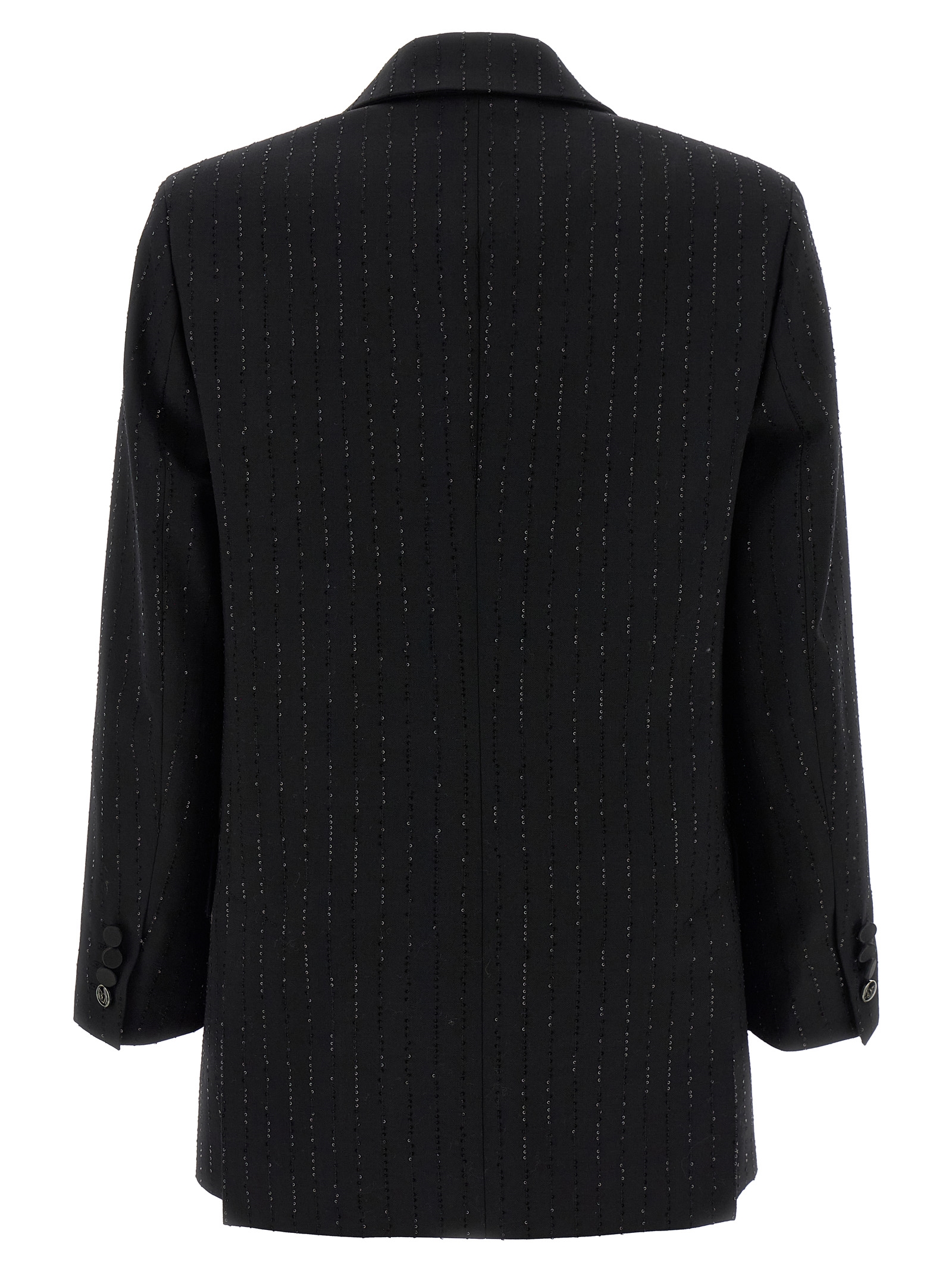 ‘Appia’ double-breasted blazer in wool sail with micro sequins embroidered in pinstriped effect, front button closure, peak lapels, breast pocket, flap pockets, structured shoulder strap, long sleeves, back slits, Monogram jacquard fabric lining.