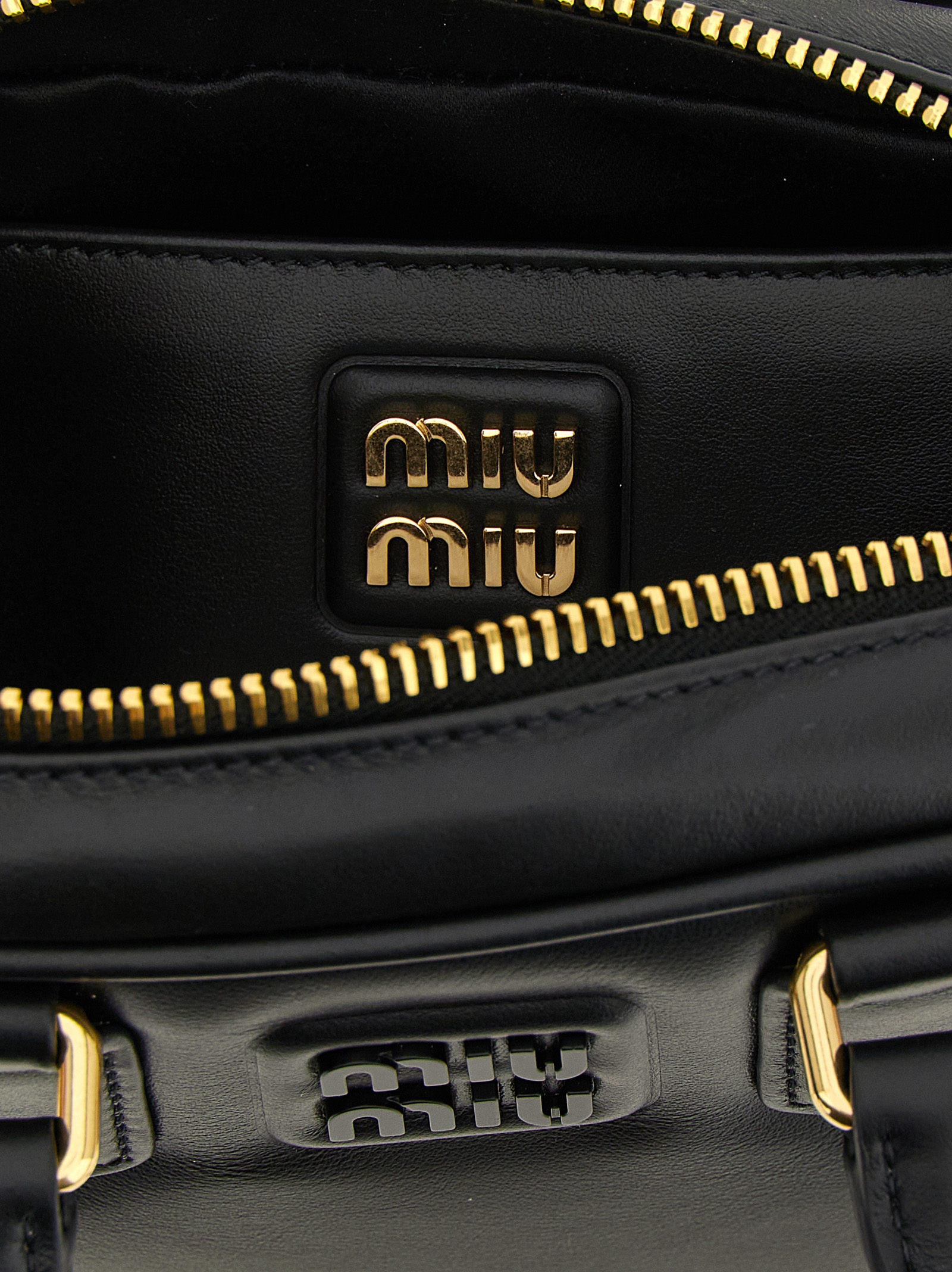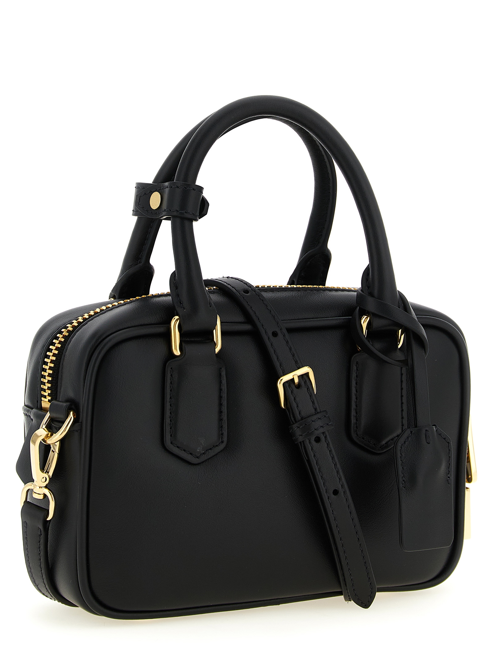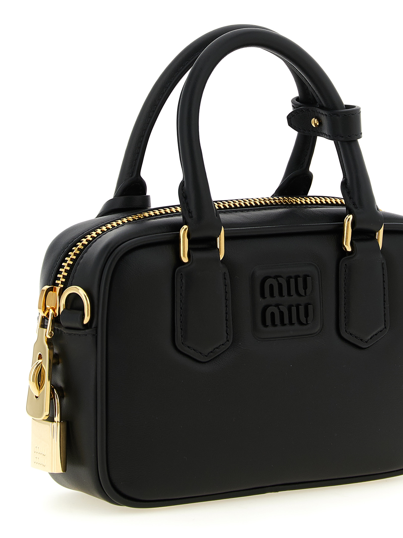 ‘Arcadie’ lightly padded nappa leather mini handbag, tone-on-tone metal lettering logo on the front, removable metal padlock detail, top zip closure, double fixed handle, rigid bottom with metal feet, cotton satin lining, adjustable and removable shoulder strap.