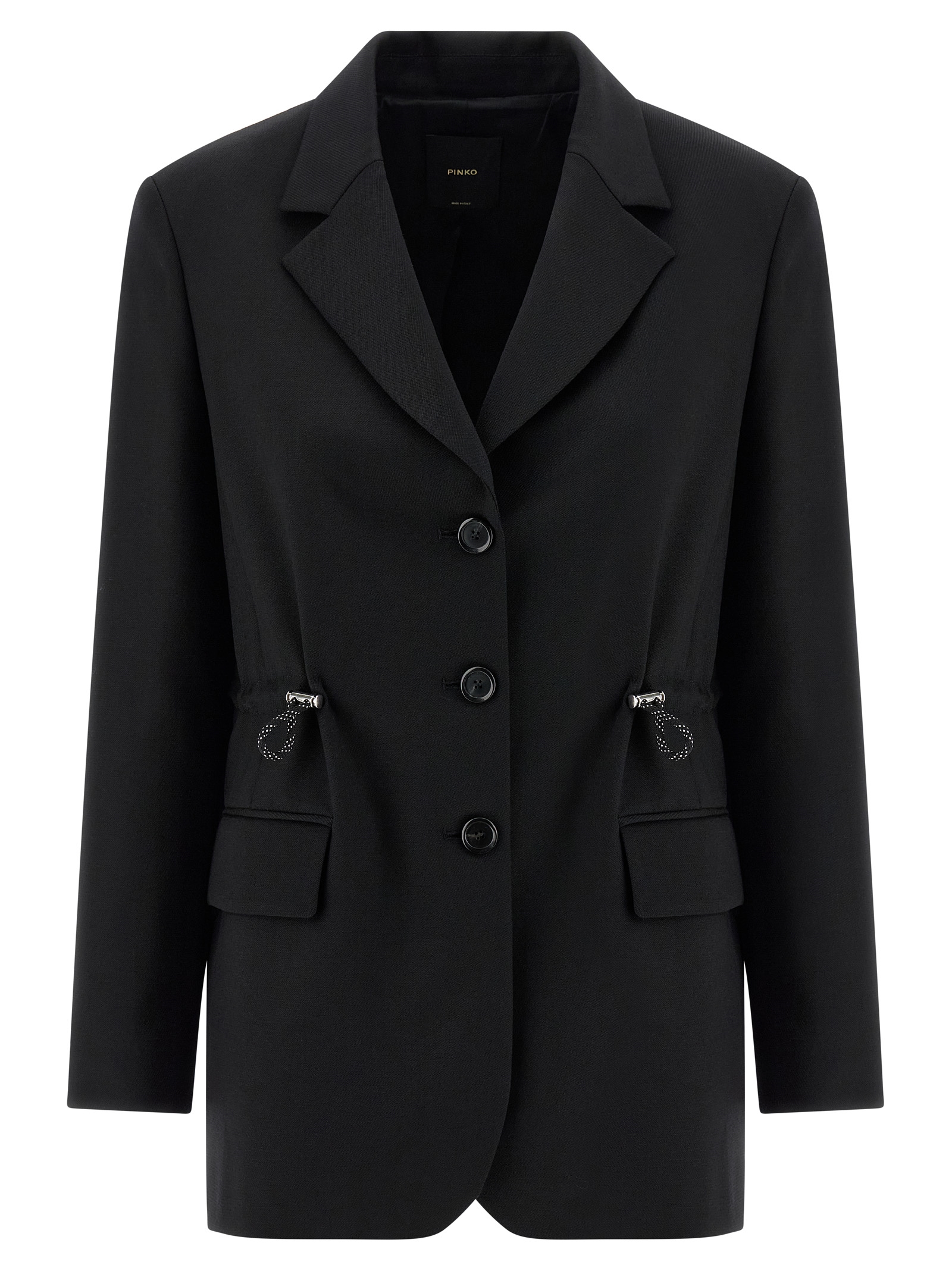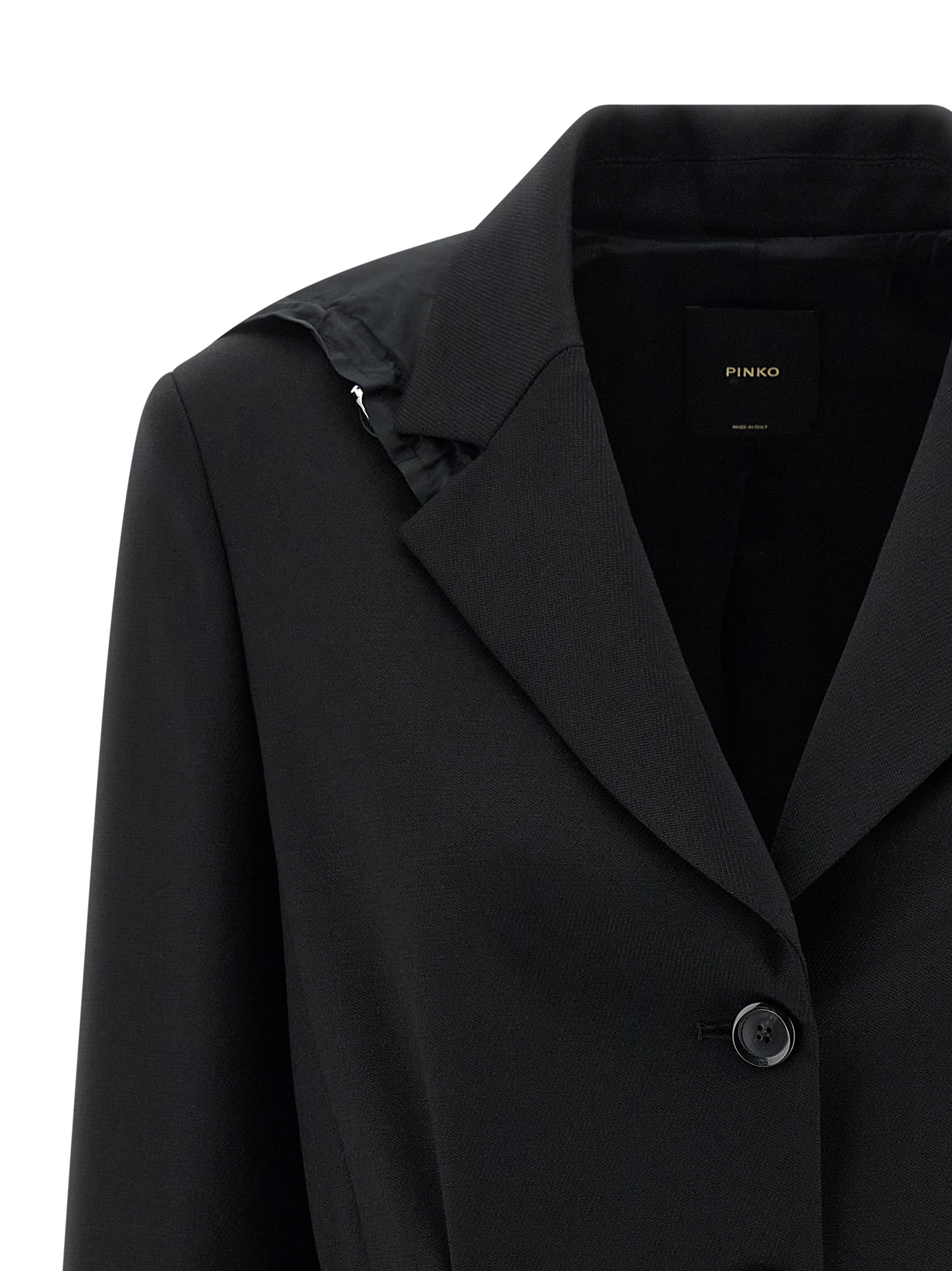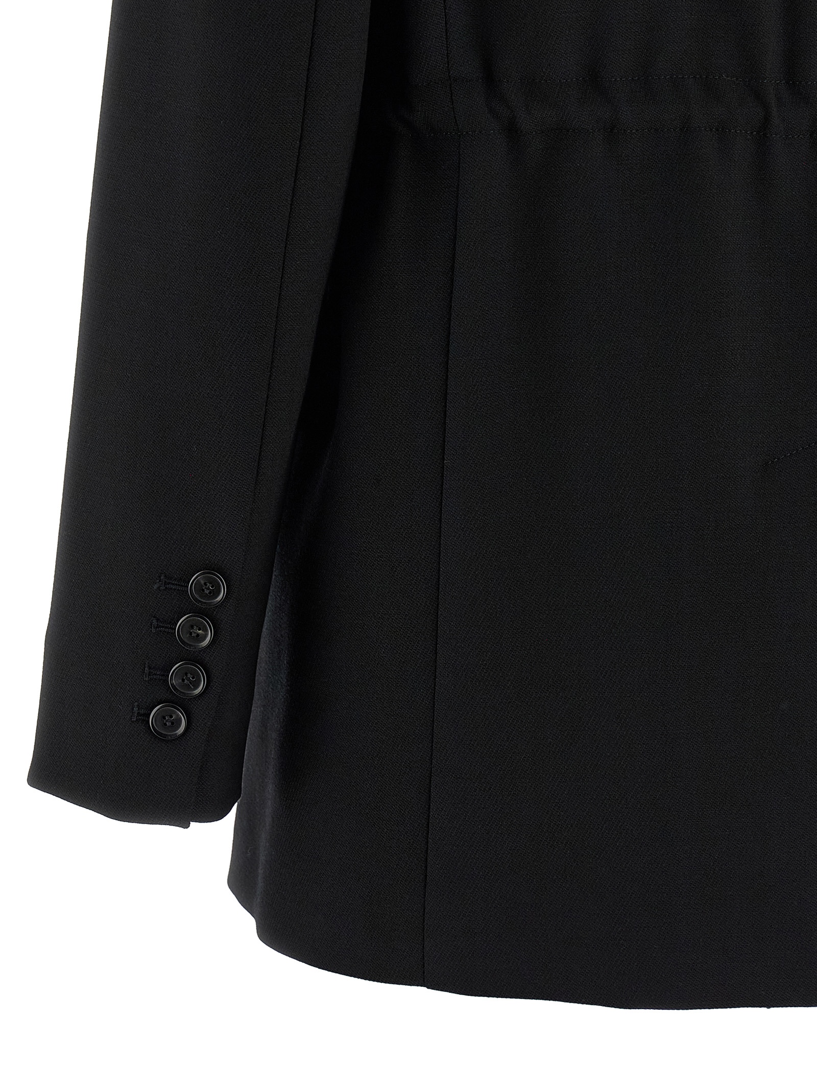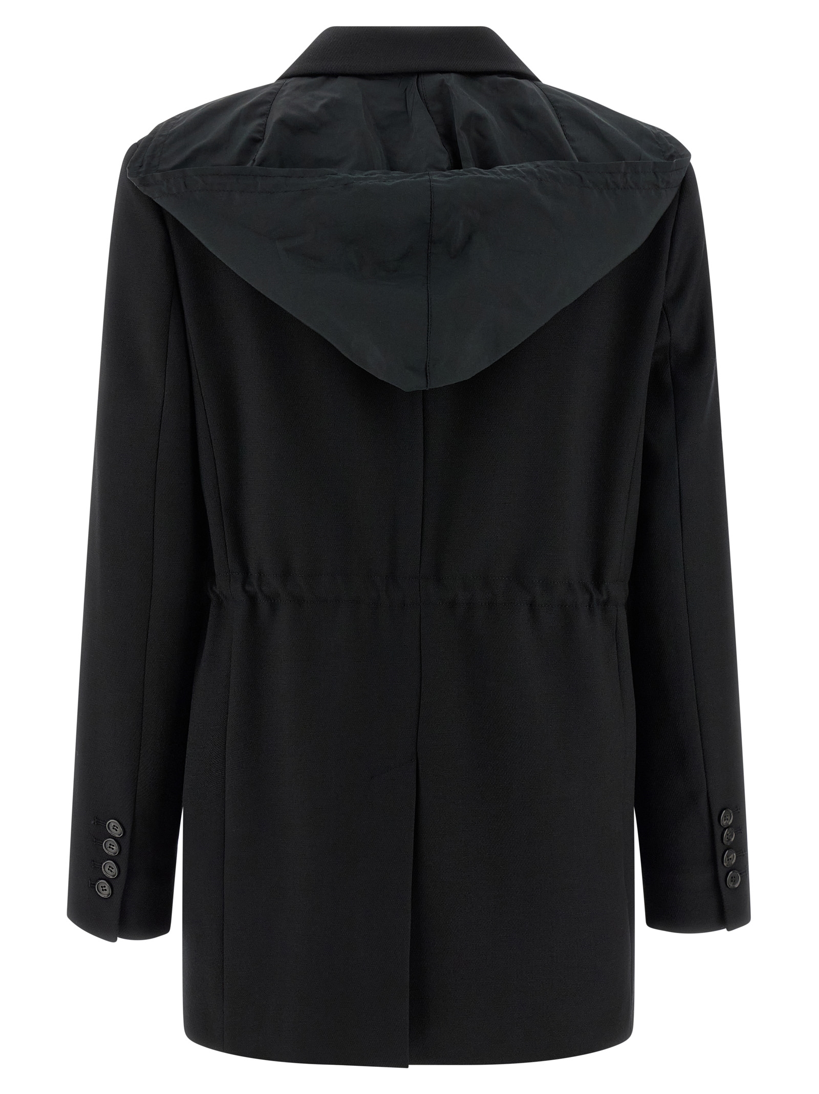 Artemisia’ wool blend blazer jacket with diagonal armor with a frosted and fluid hand, adjustable and removable nylon hood, single-breasted style with front button closure, mirror lapels, drawstring at the waist, flap pockets, padded shoulder, long sleeves, back split, lining.
