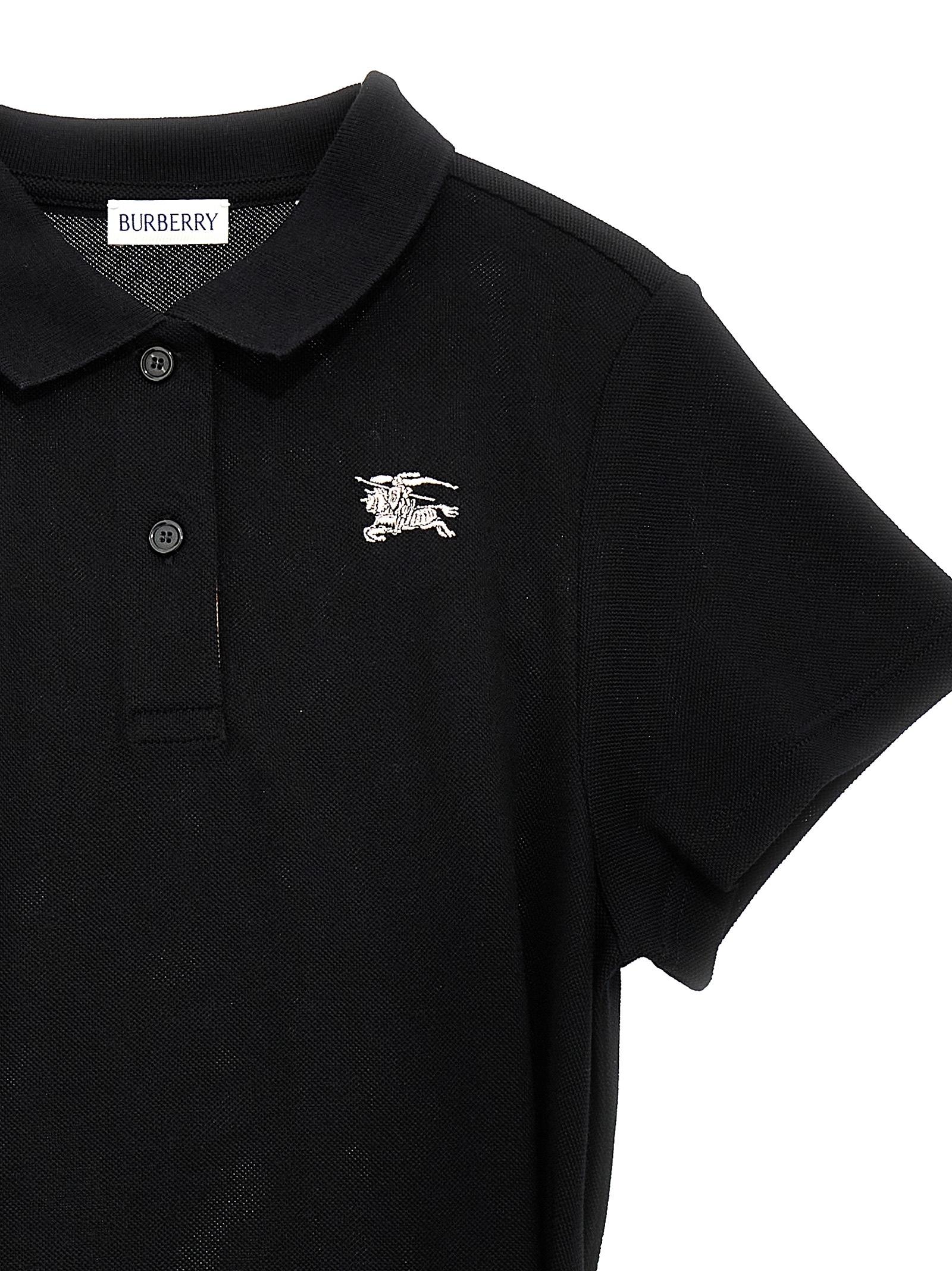 ‘Astrid’ cotton piqué polo dress with collar and buttons, front logo embroidery, short sleeves, full skirt, removable belt.