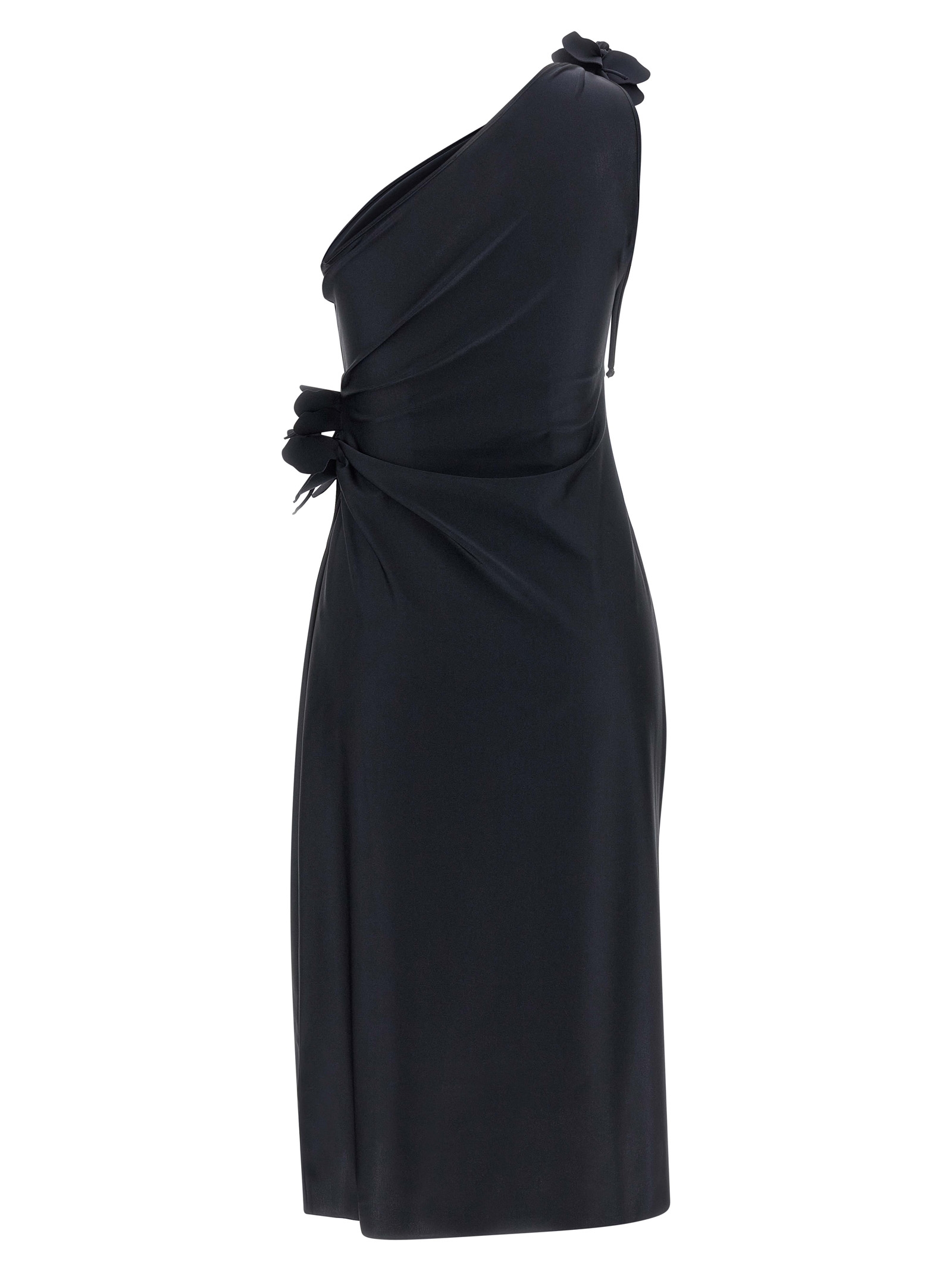 ‘Asymmetric Mini Flower’ midi dress in stretch technical jersey, one-shoulder model, front cut-out detail, brand petal knots on the shoulders and waist, sleeveless, side split, asymmetrical hem.