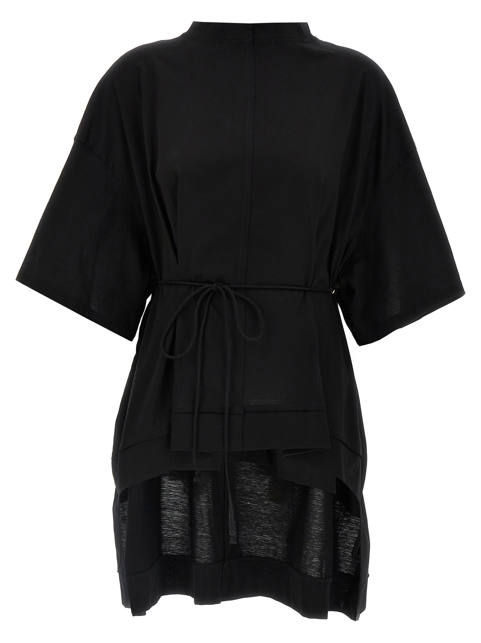 Cotton, crewneck t-shirt with short sleeves with dropped shoulders, side slits with asymmetrical hem, belt at the waist with underarm loops.