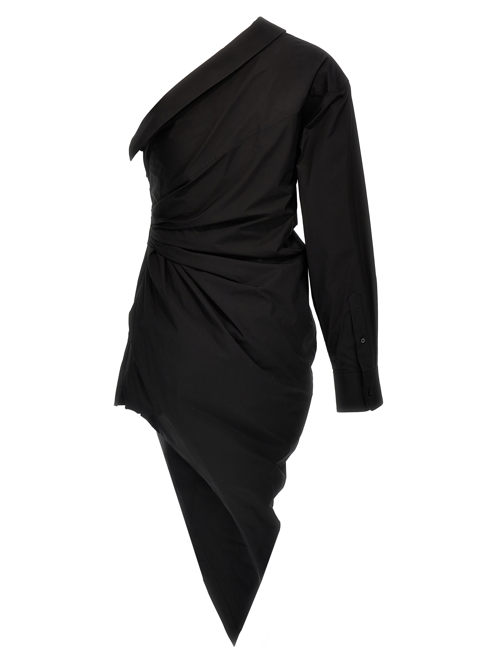 Asymmetrical cotton shirt dress, one-shoulder model with long cuffed sleeves. Side zip closure.
