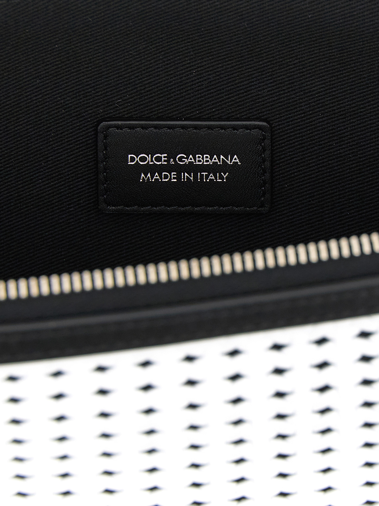 ‘Atene’ clutch bag in plongé calf leather with contrasting weave on the front, top zip closure, antique palladium plating metal details, front embossed logo, and removable handle.