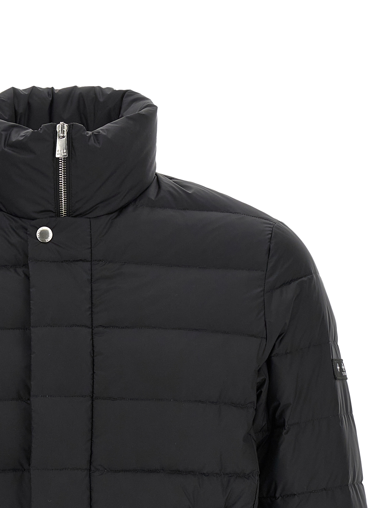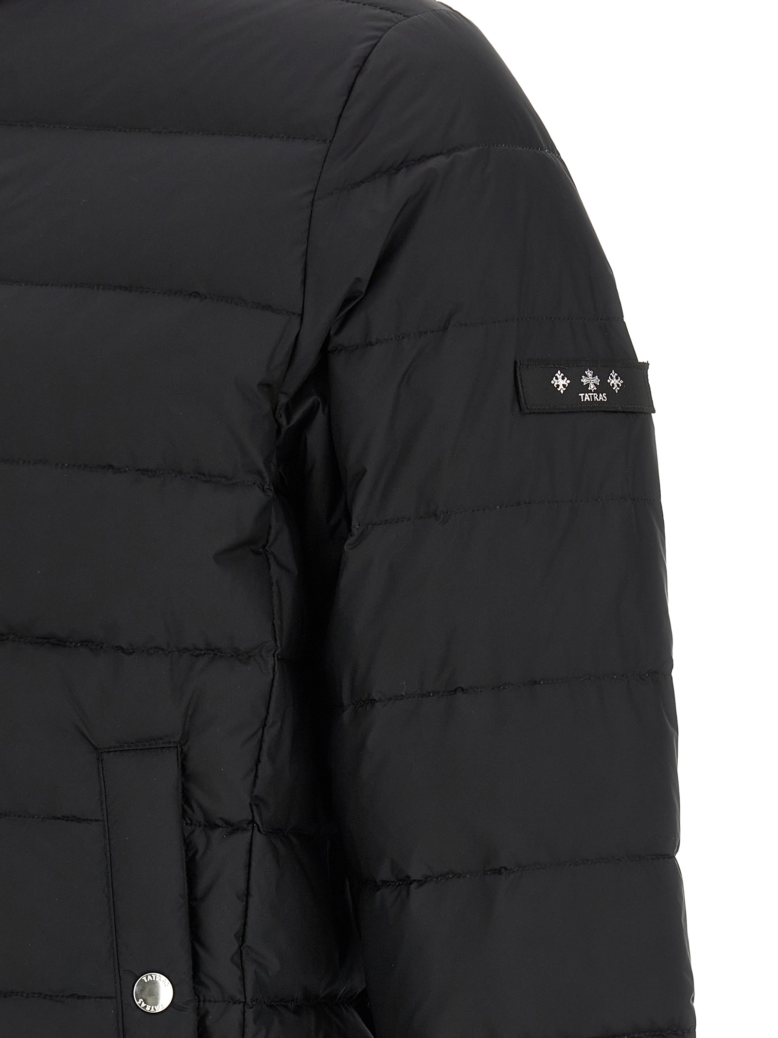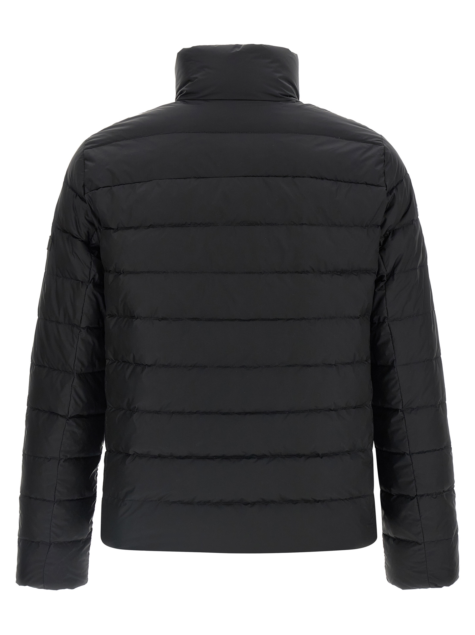 ‘Atene’ slightly shiny quilted taffeta jacket with goose down padding, light down model, standing collar, front zip and snap button closure, pockets, long sleeves with elastic cuffs.